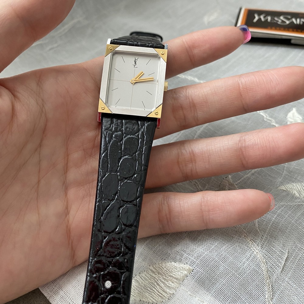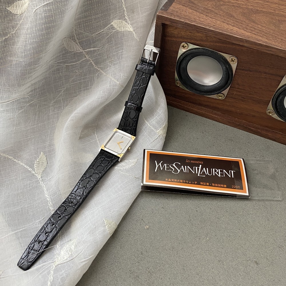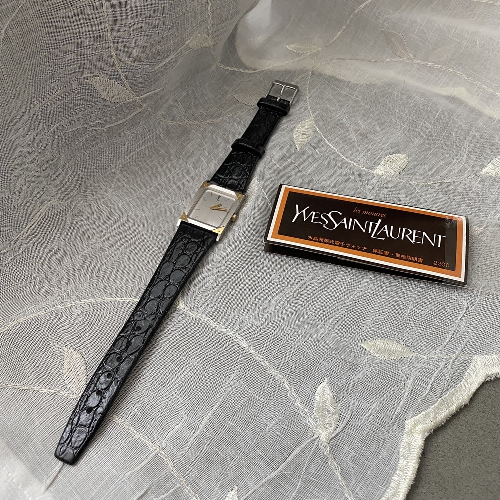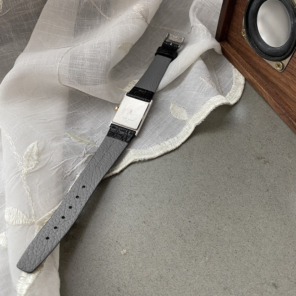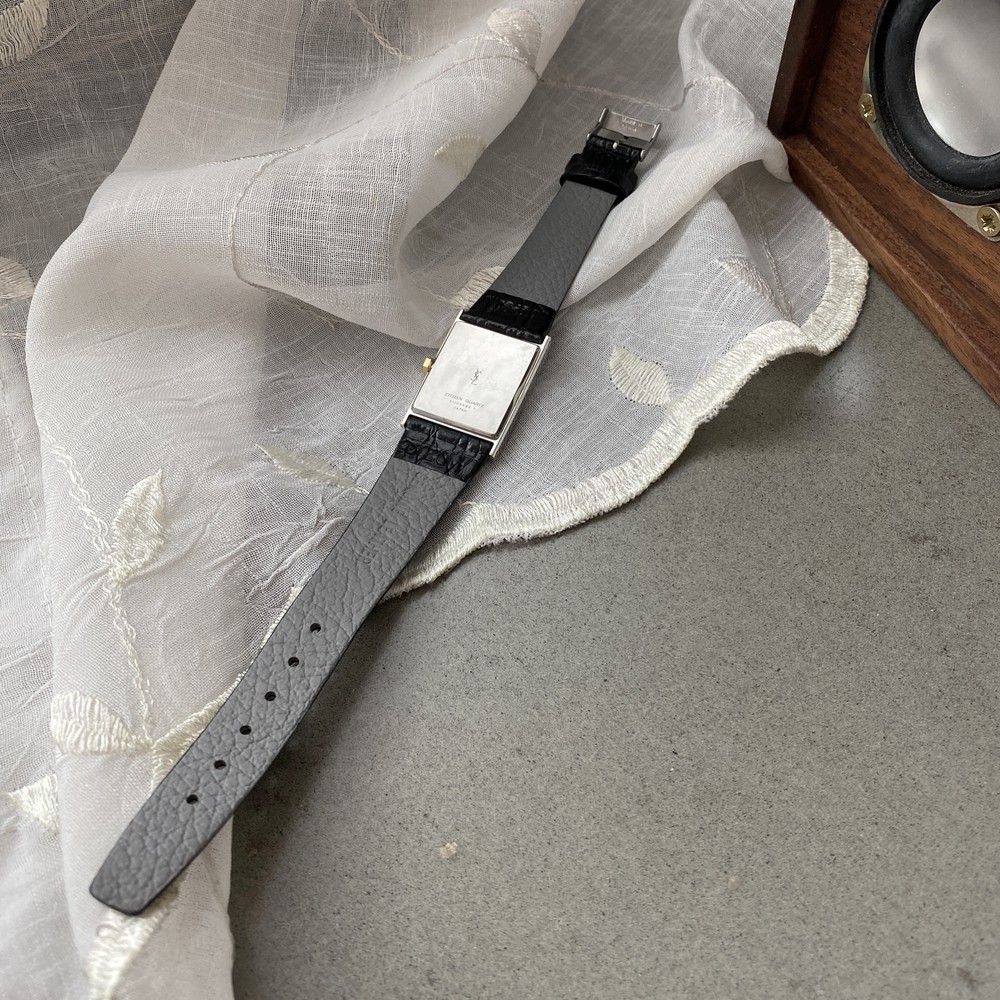 실버 스퀘어 케이스에 입생로랑 로고 다이얼이 인상적인 시계입니다.