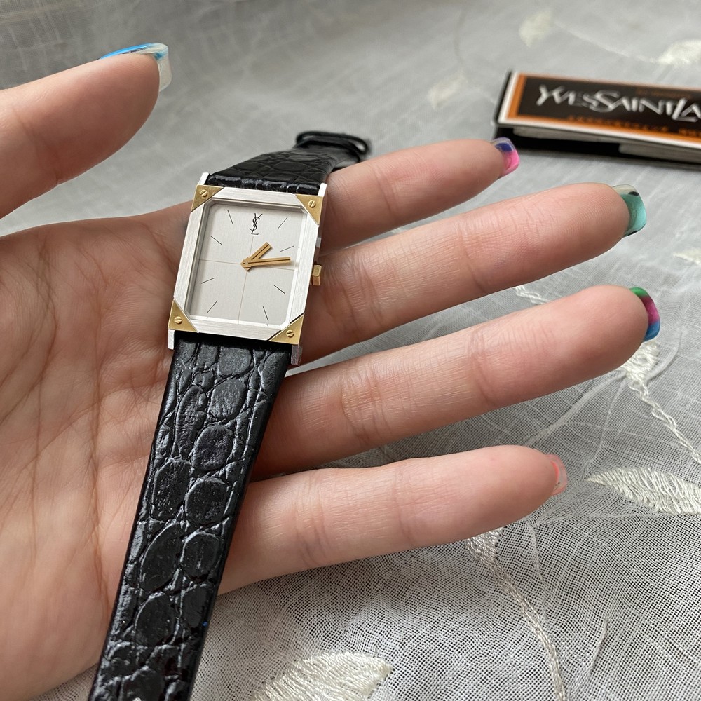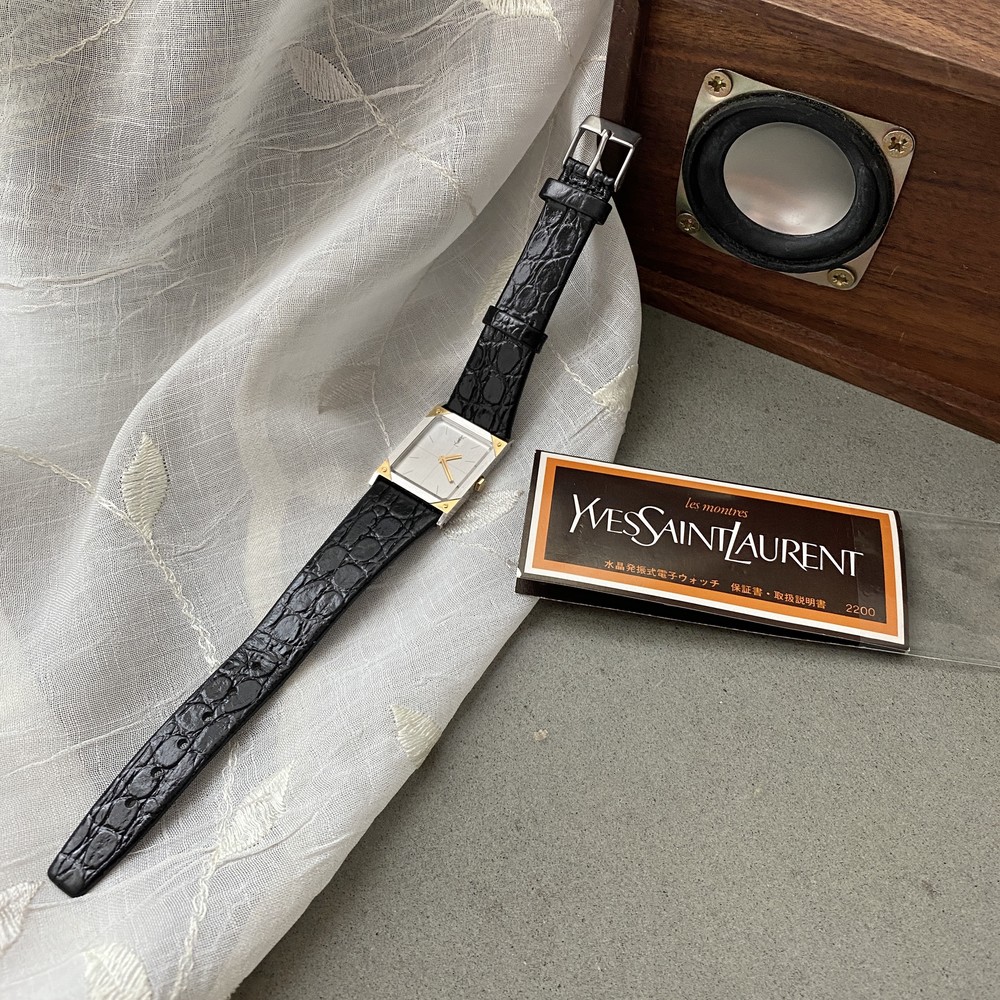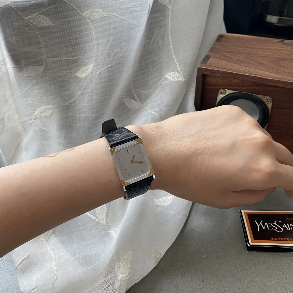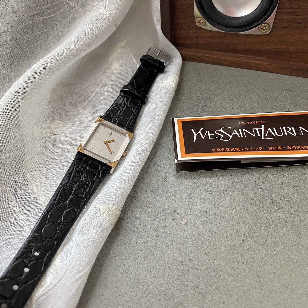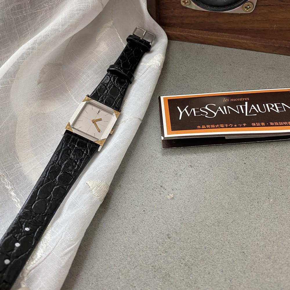 실버 스퀘어 케이스에 입생로랑 로고 다이얼이 인상적인 시계입니다.