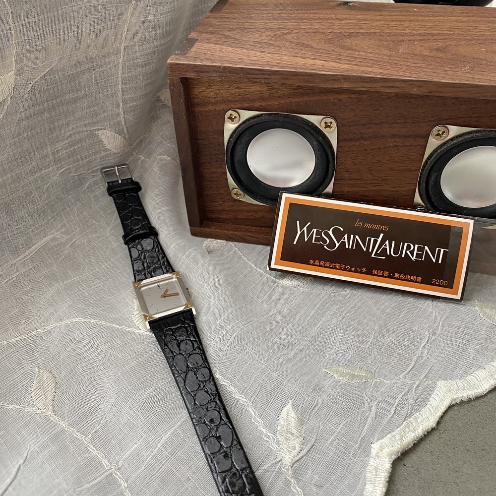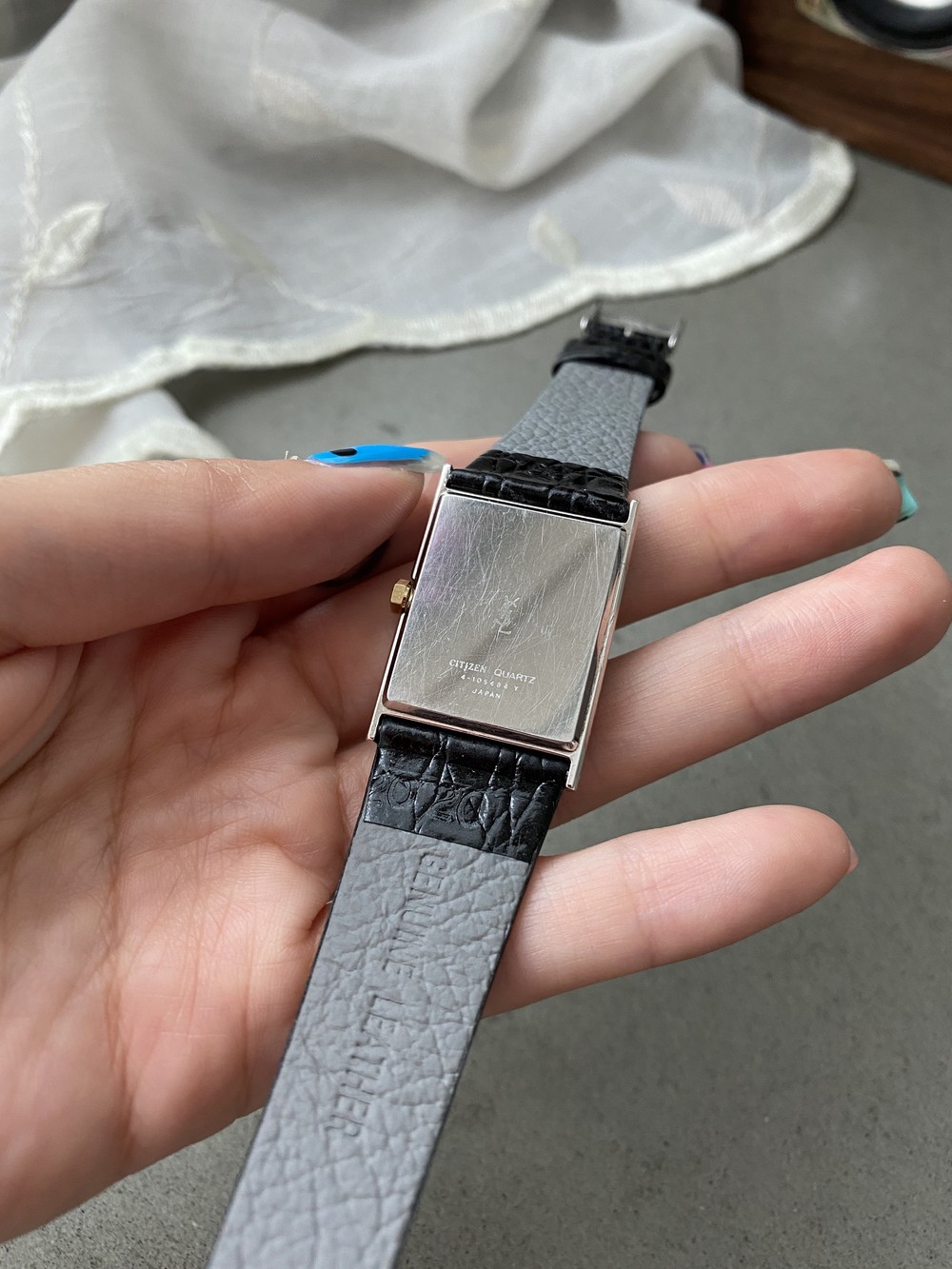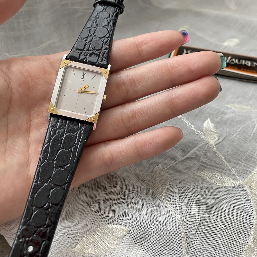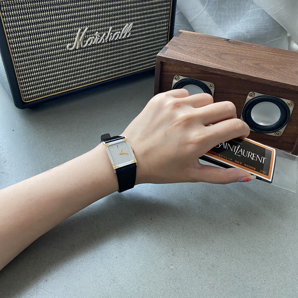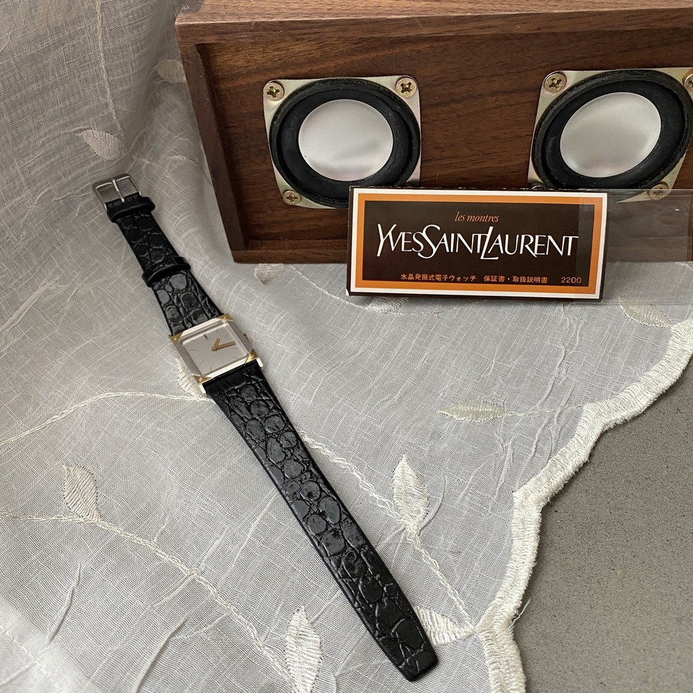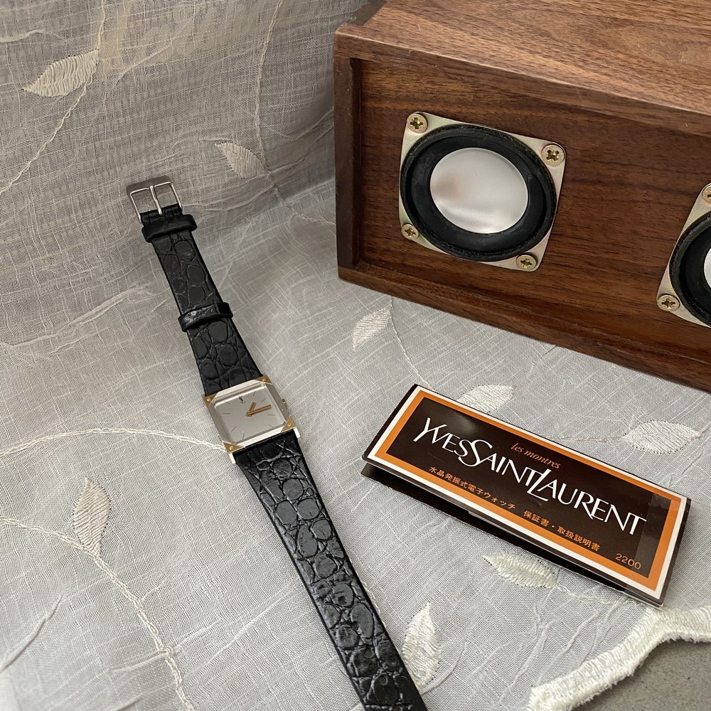 실버 스퀘어 케이스에 입생로랑 로고 다이얼이 인상적인 시계입니다.