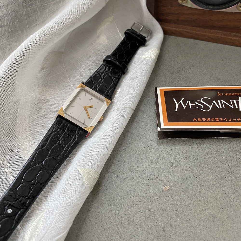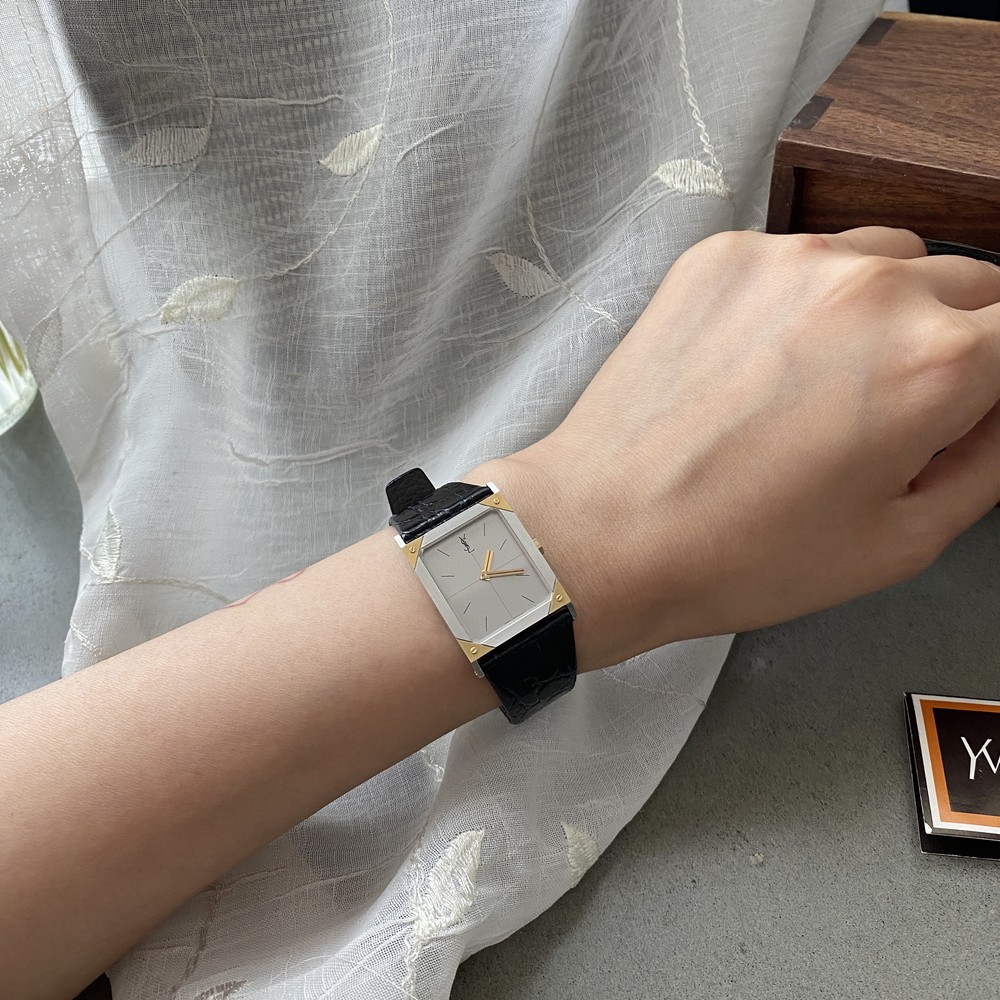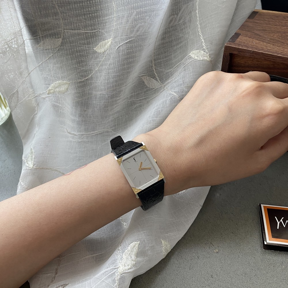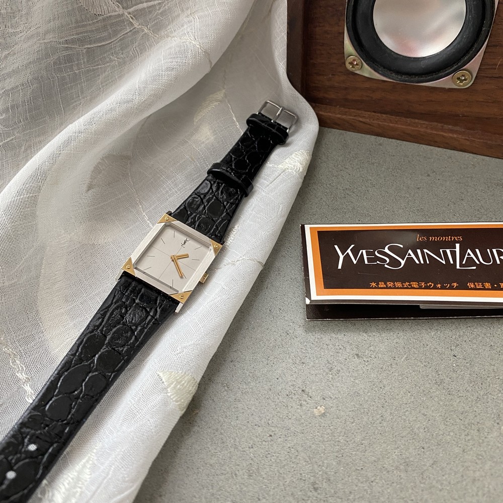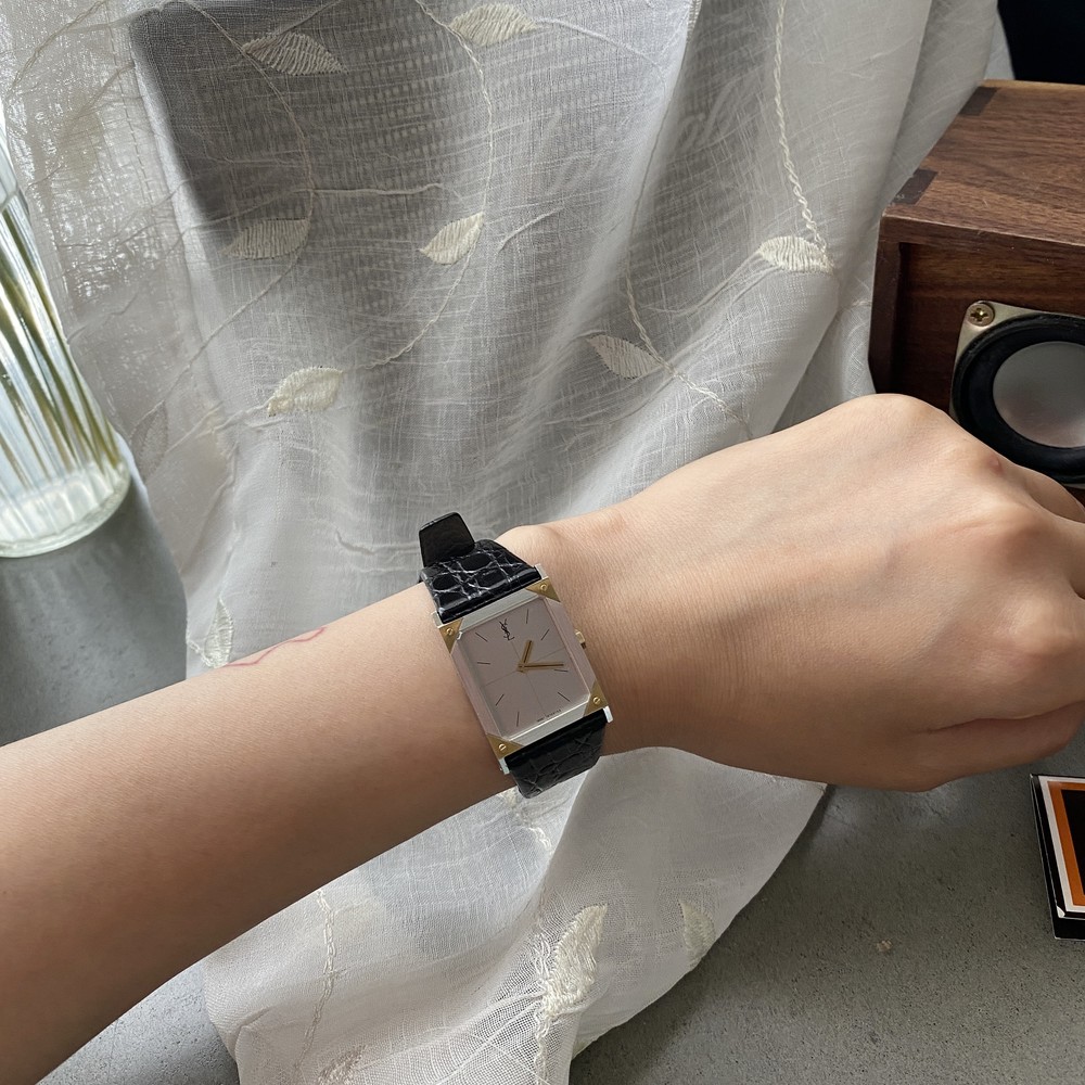실버 스퀘어 케이스에 입생로랑 로고 다이얼이 인상적인 시계입니다.