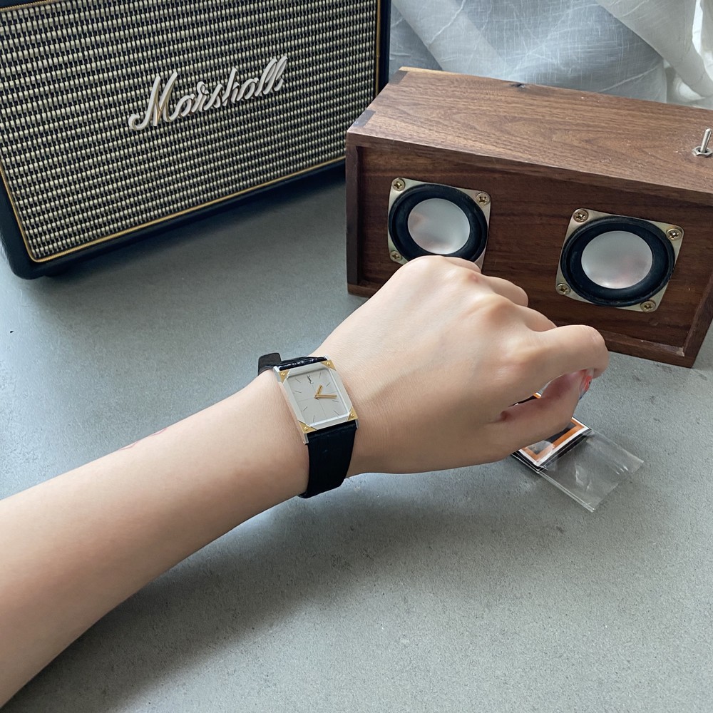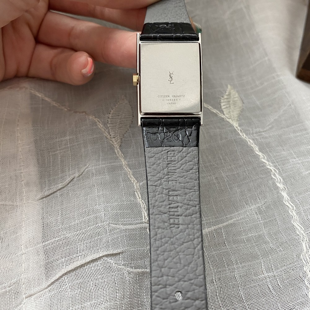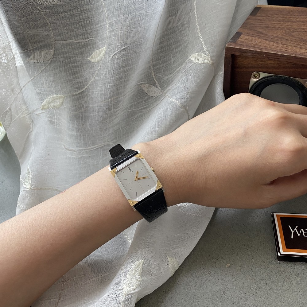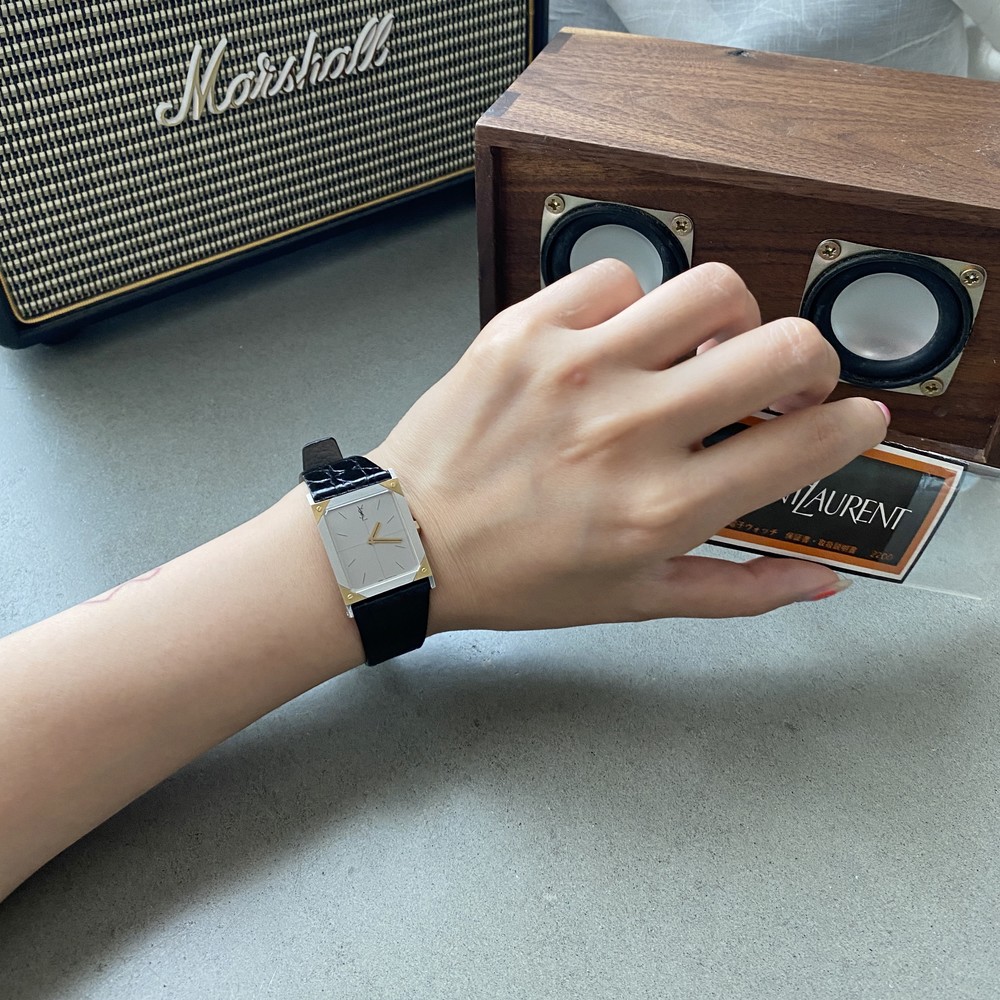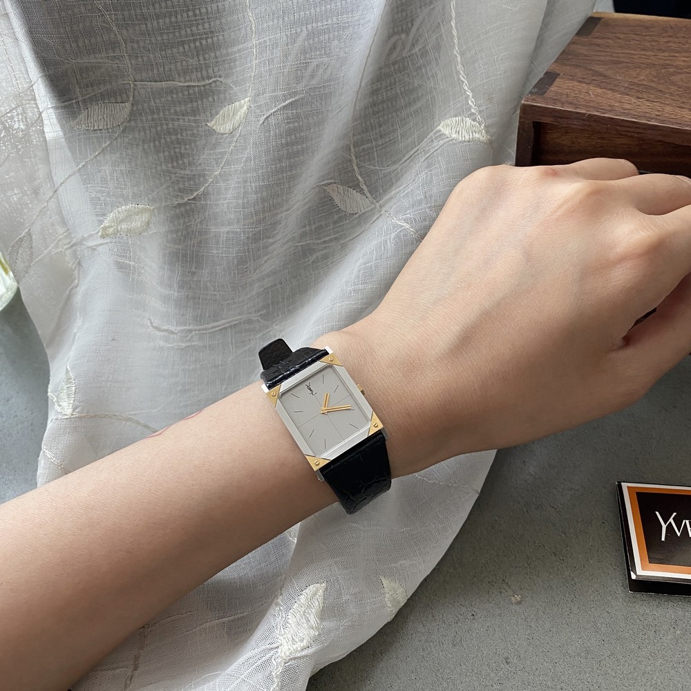 실버 스퀘어 케이스에 입생로랑 로고 다이얼이 인상적인 시계입니다.