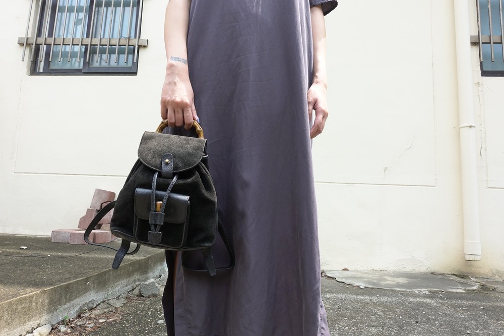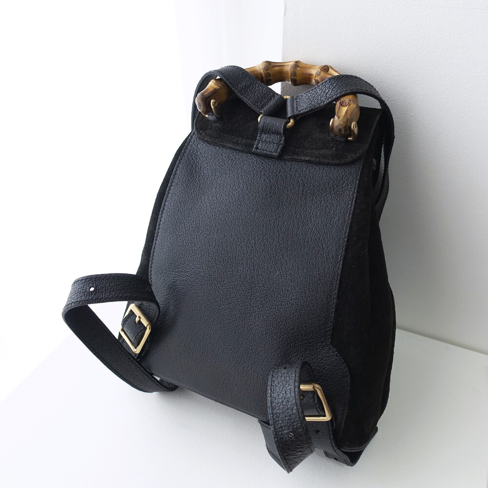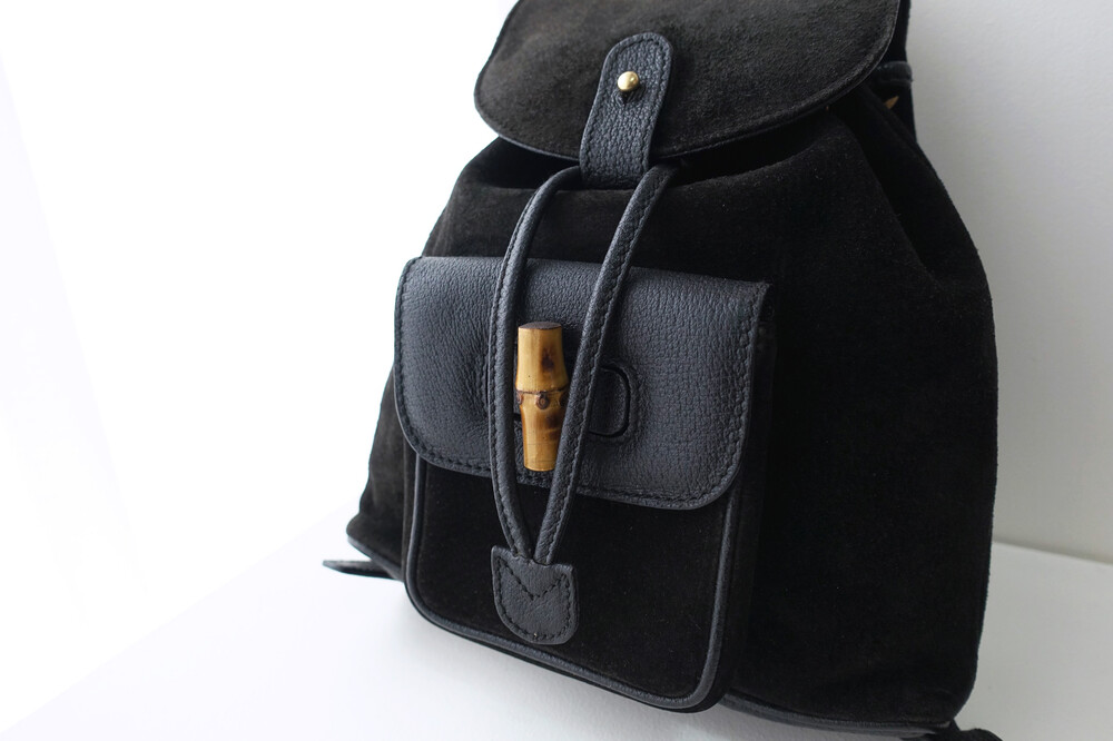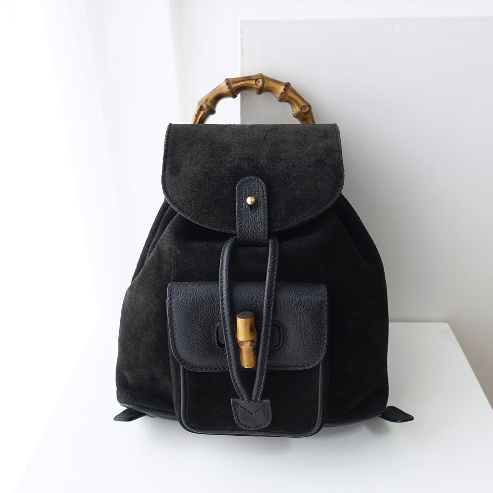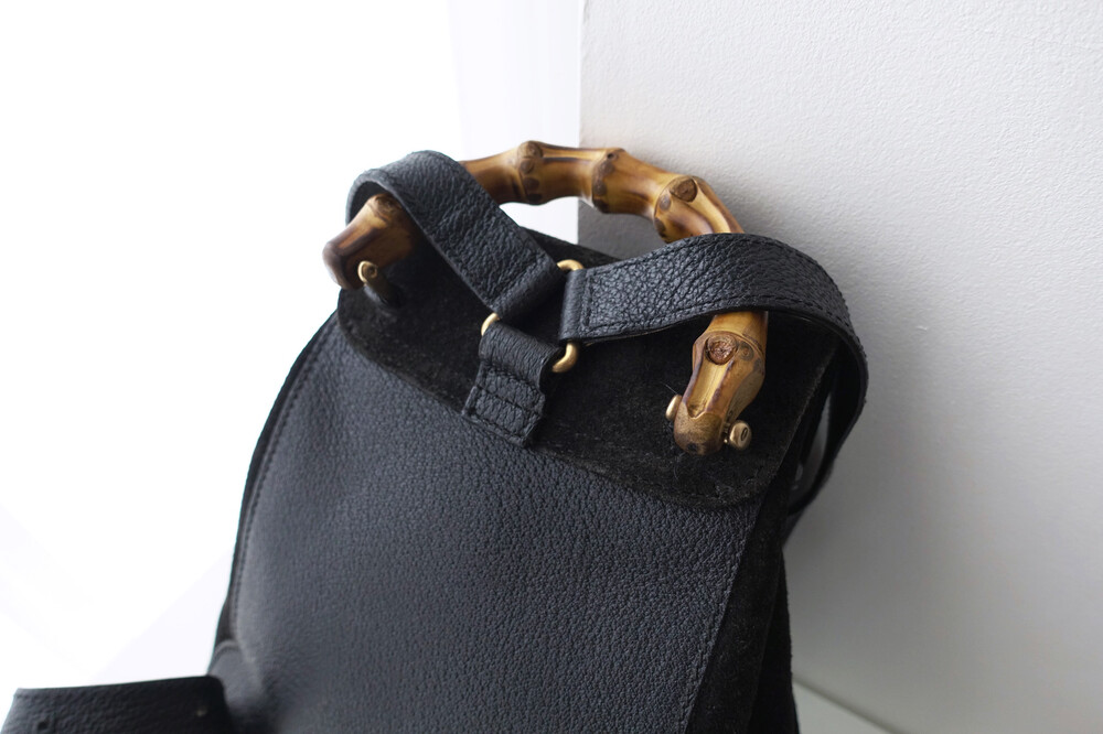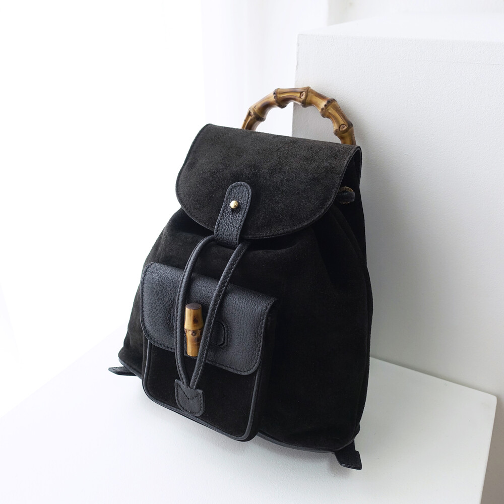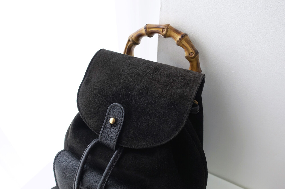 부드러운 스웨이드 바디에 뱀부 핸들로 제작된 구찌 스웨이드 백팩입니다.