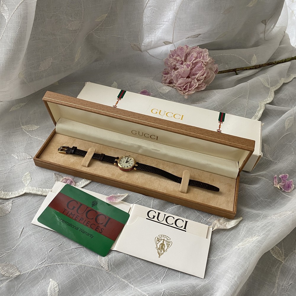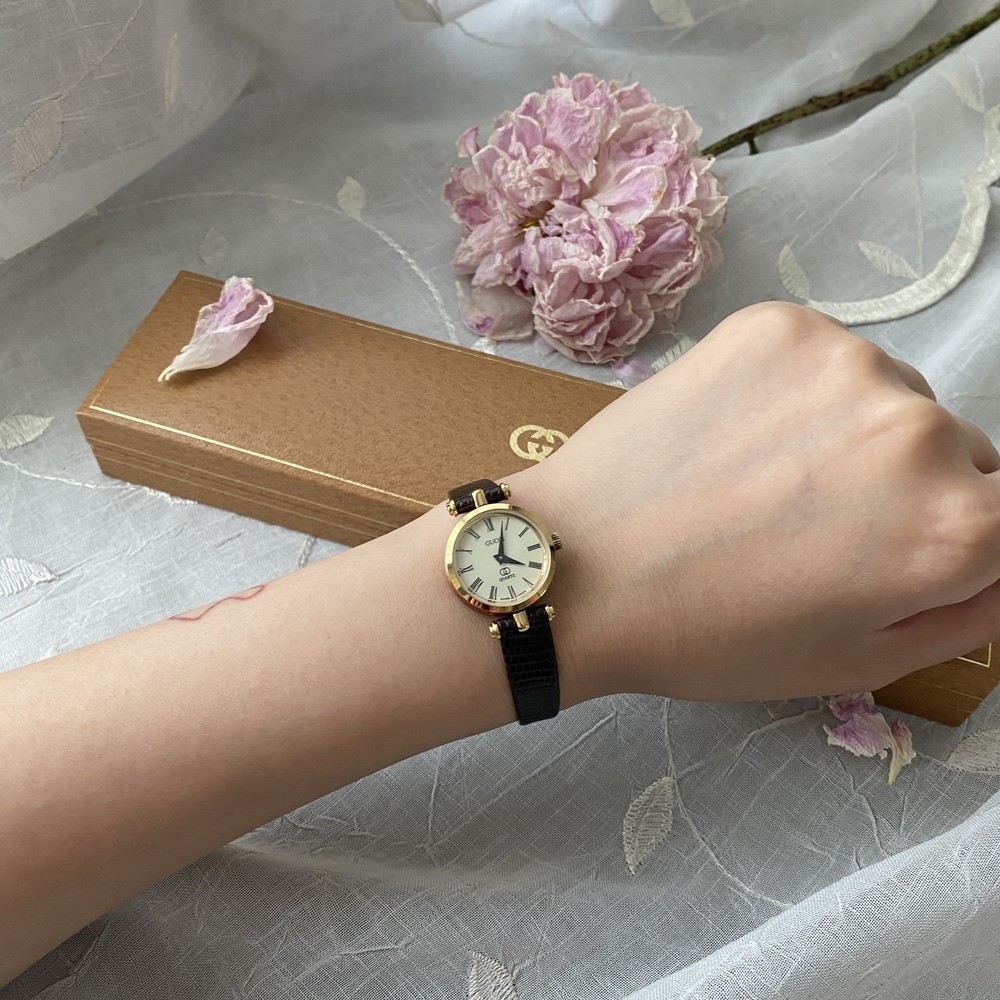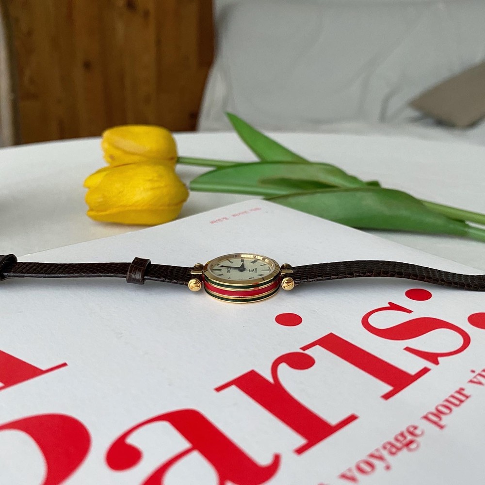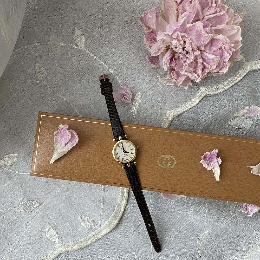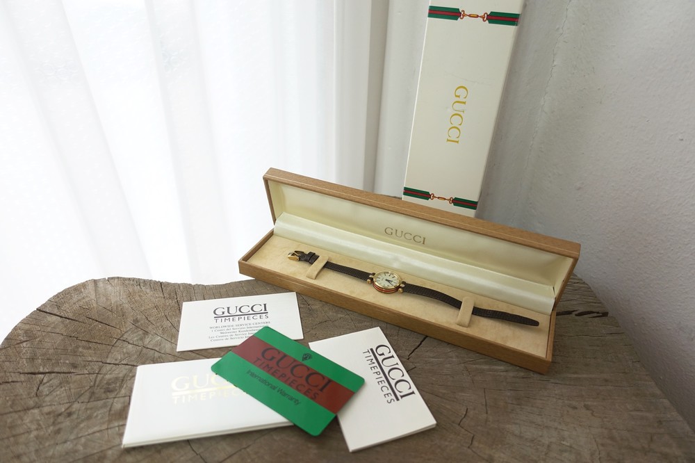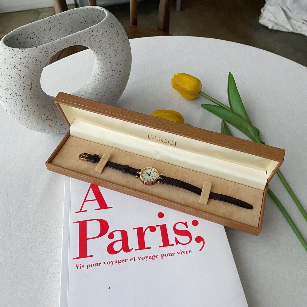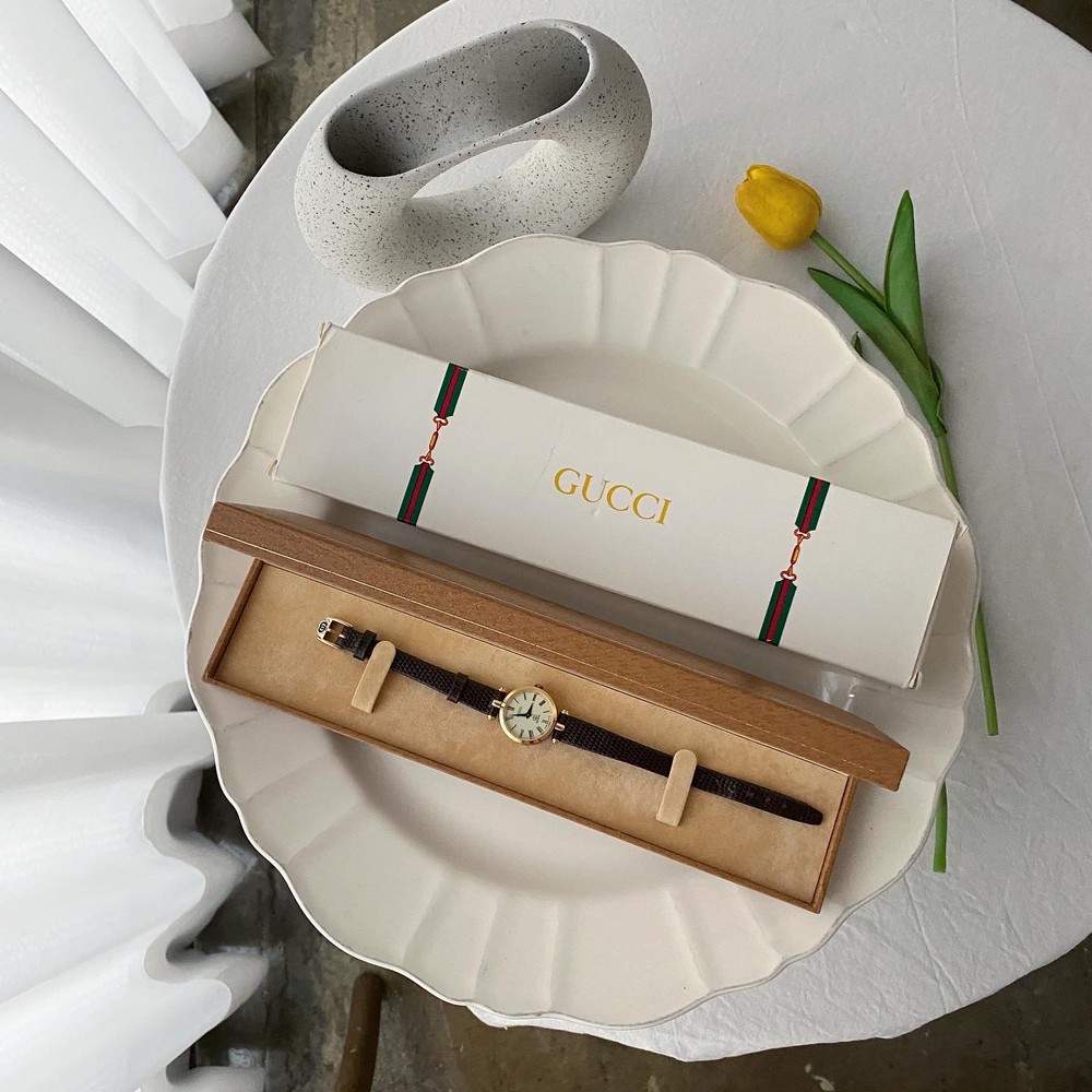 너무나도 잘 에이징 된 골드 다이얼과 구찌 GG 심볼이 인상적이며