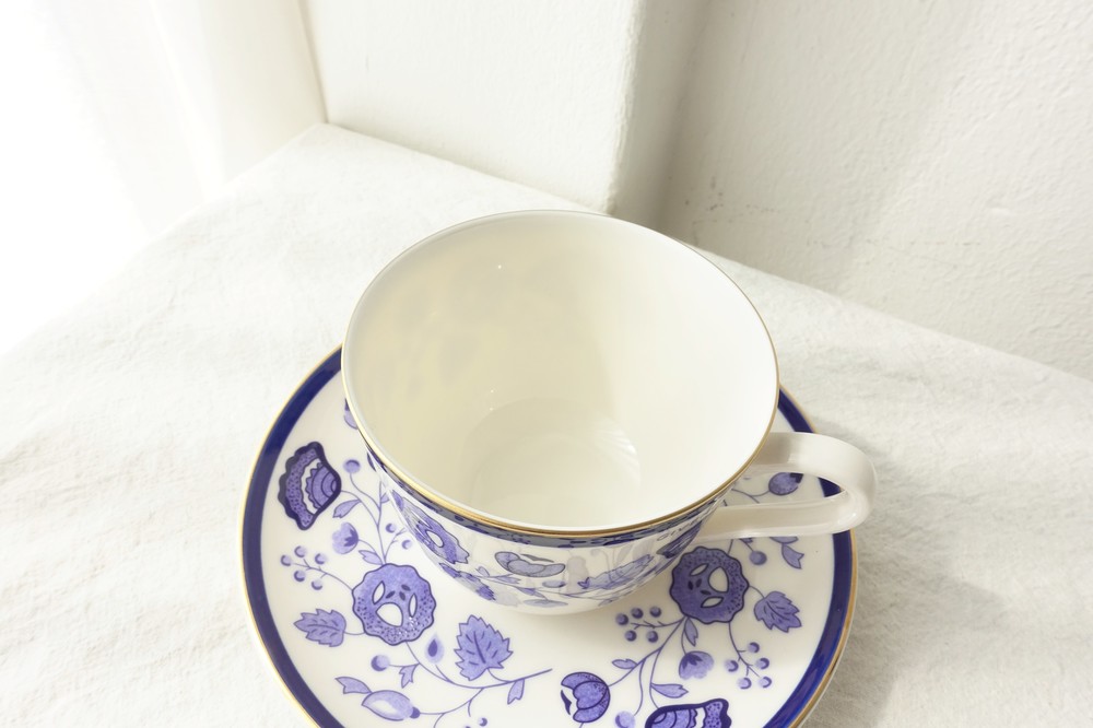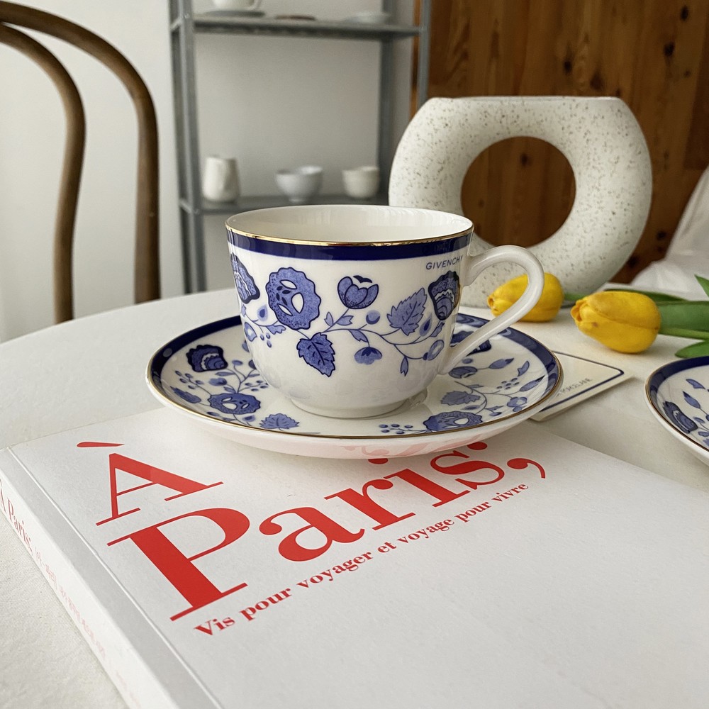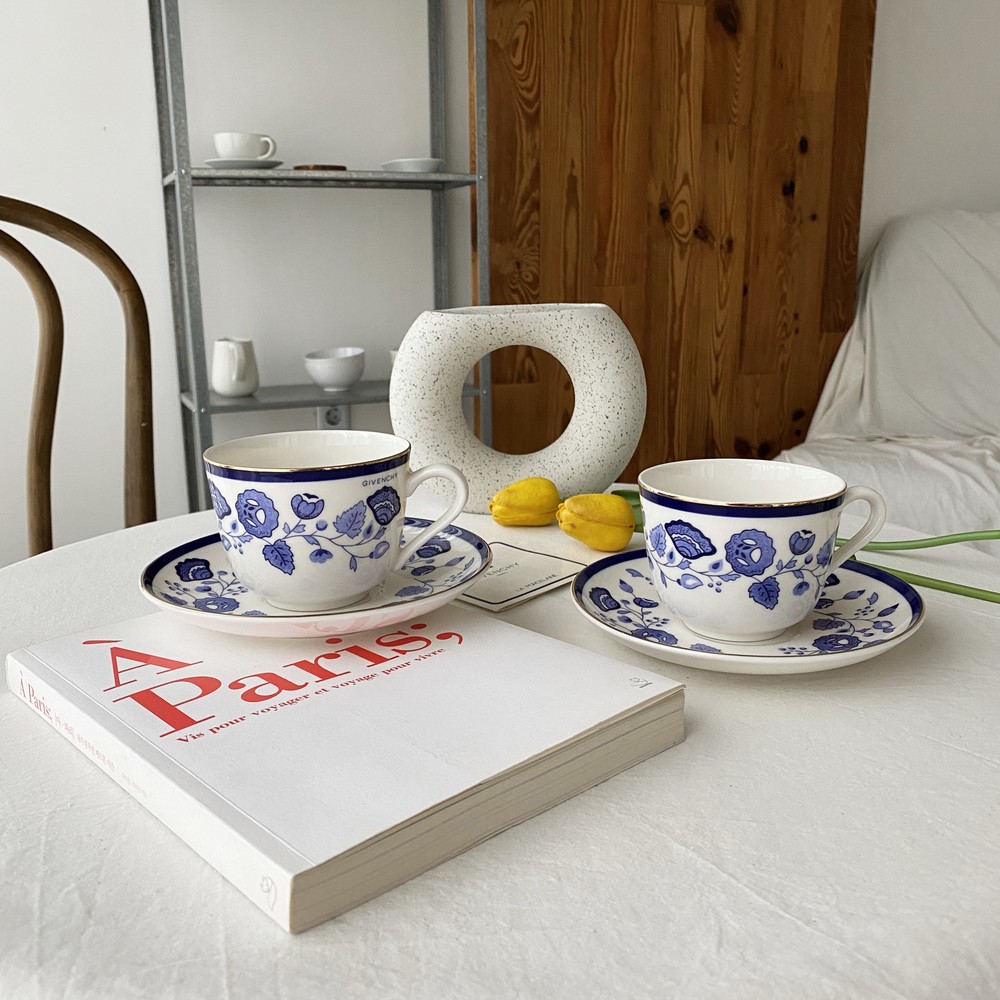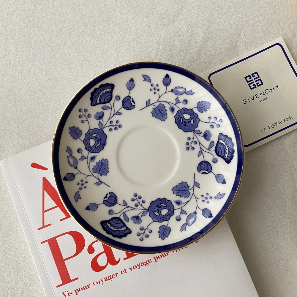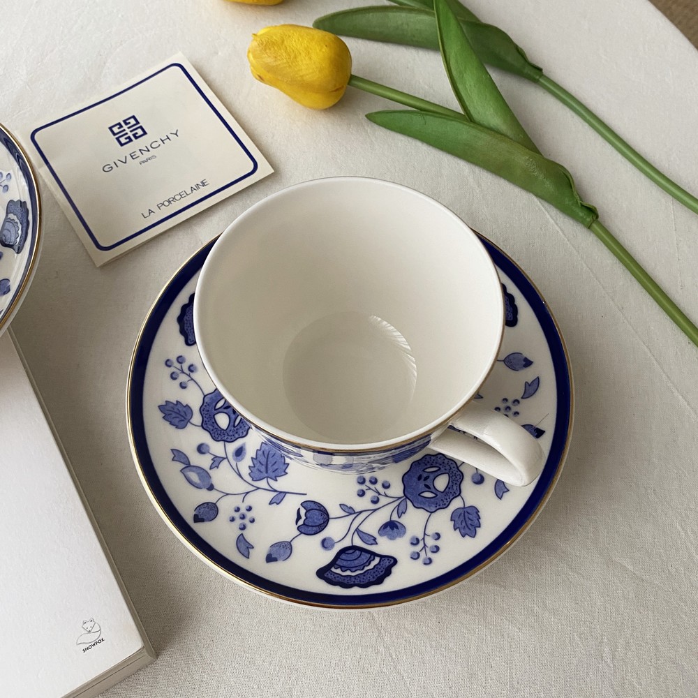 아름다운 코발트 블루의 꽃, 나뭇잎들을 포슬린 기법으로 그려넣은 빈티지 지방시 찻잔입니다.