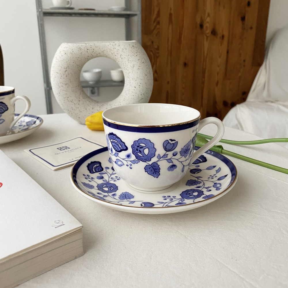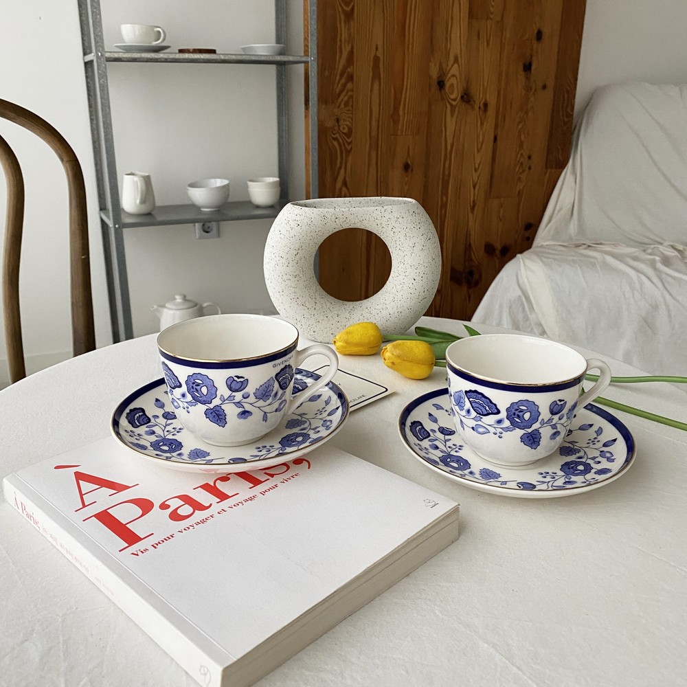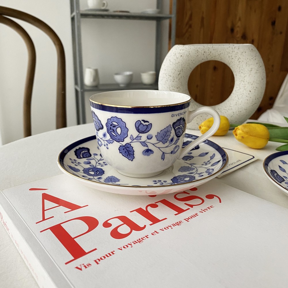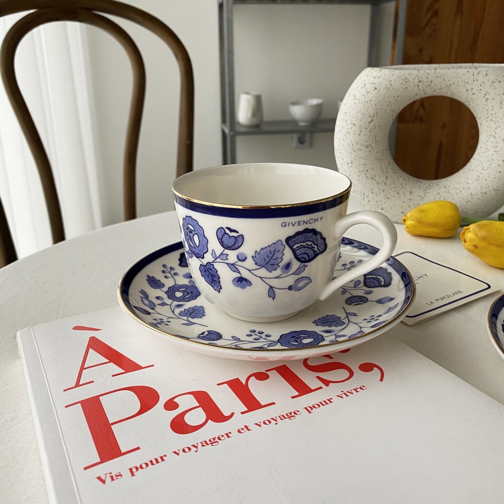 아름다운 코발트 블루의 꽃, 나뭇잎들을 포슬린 기법으로 그려넣은 빈티지 지방시 찻잔입니다.