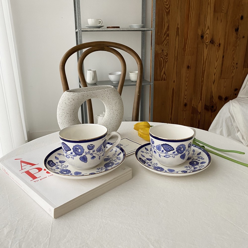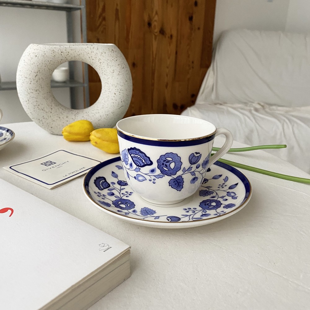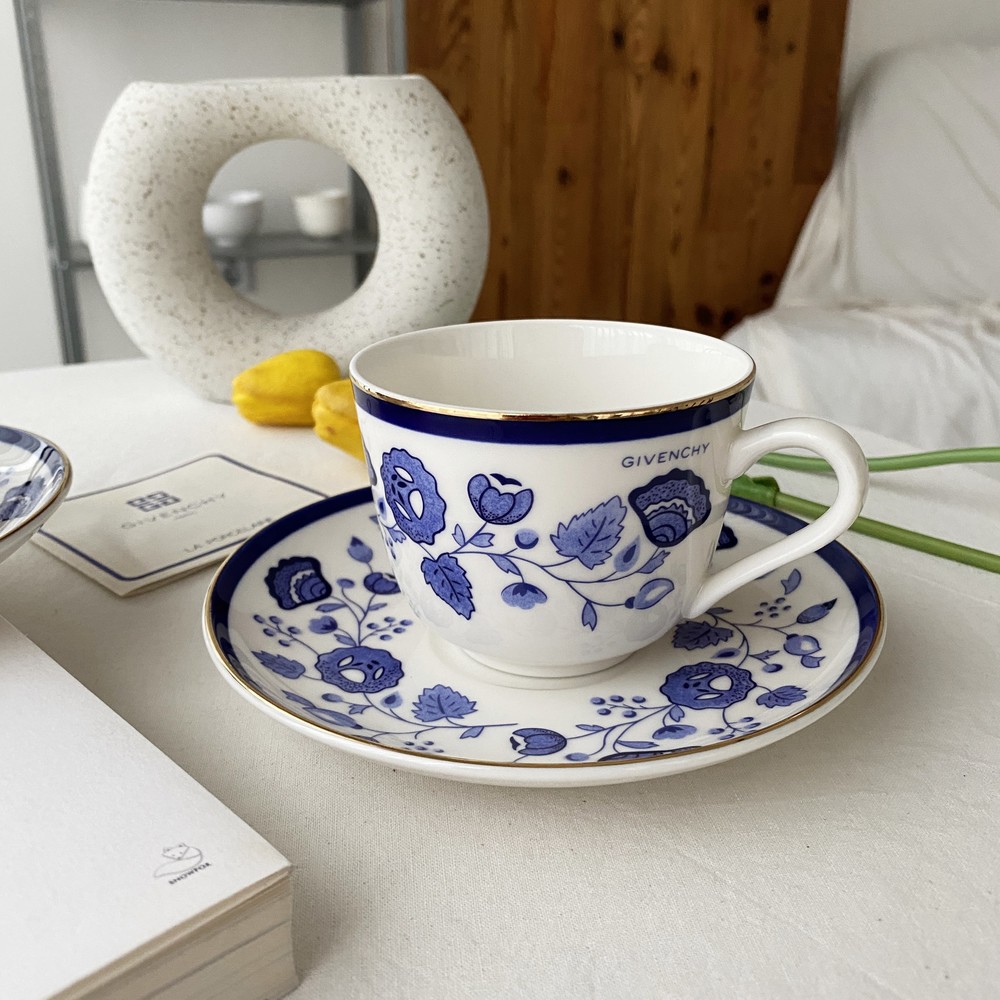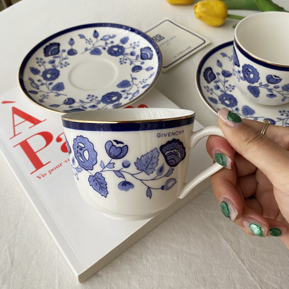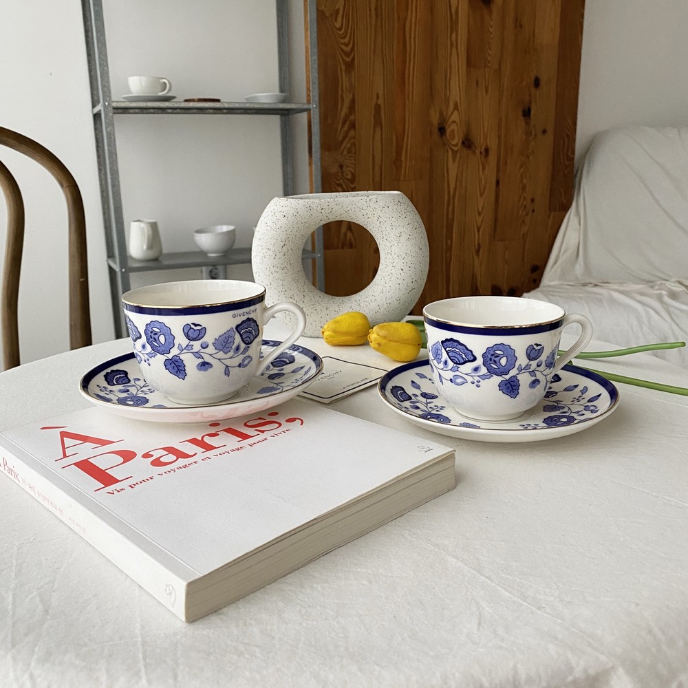 아름다운 코발트 블루의 꽃, 나뭇잎들을 포슬린 기법으로 그려넣은 빈티지 지방시 찻잔입니다.