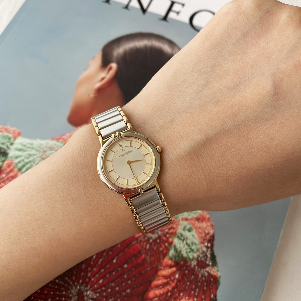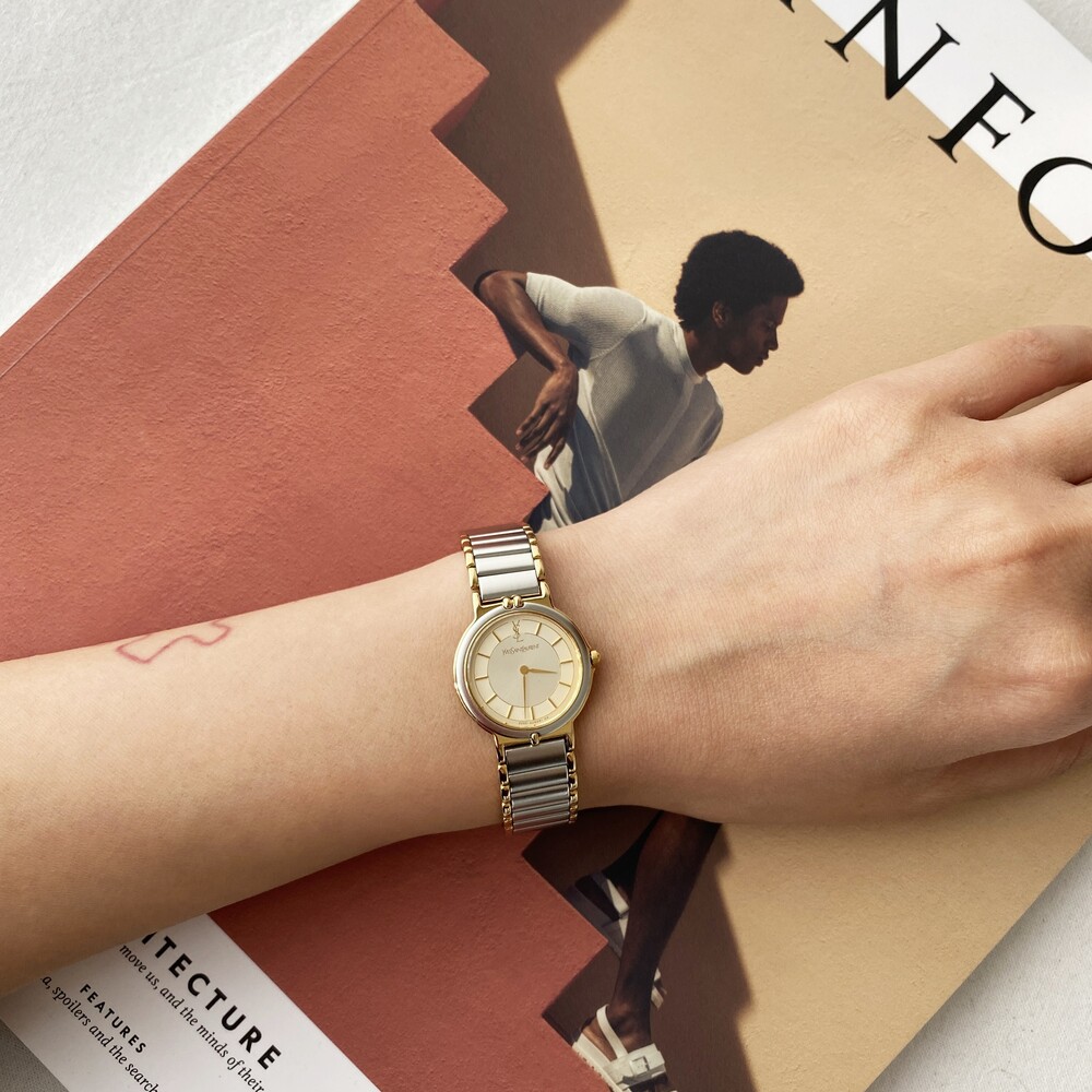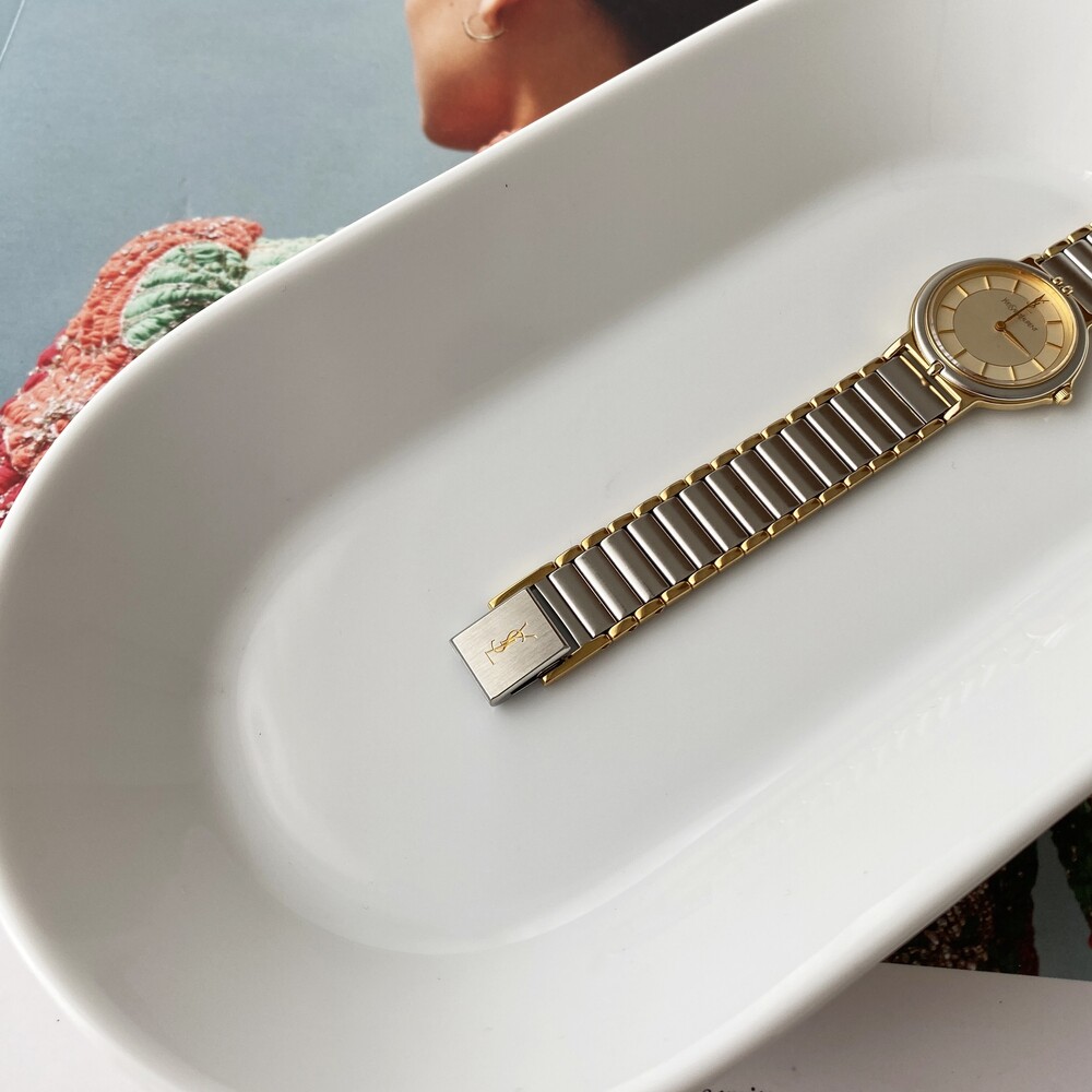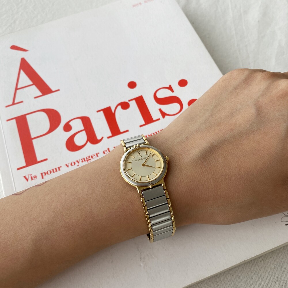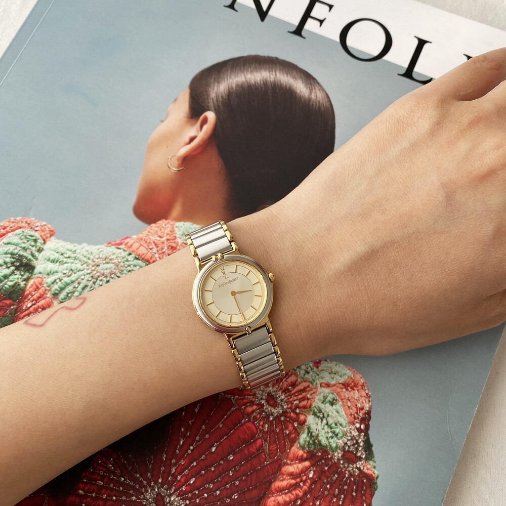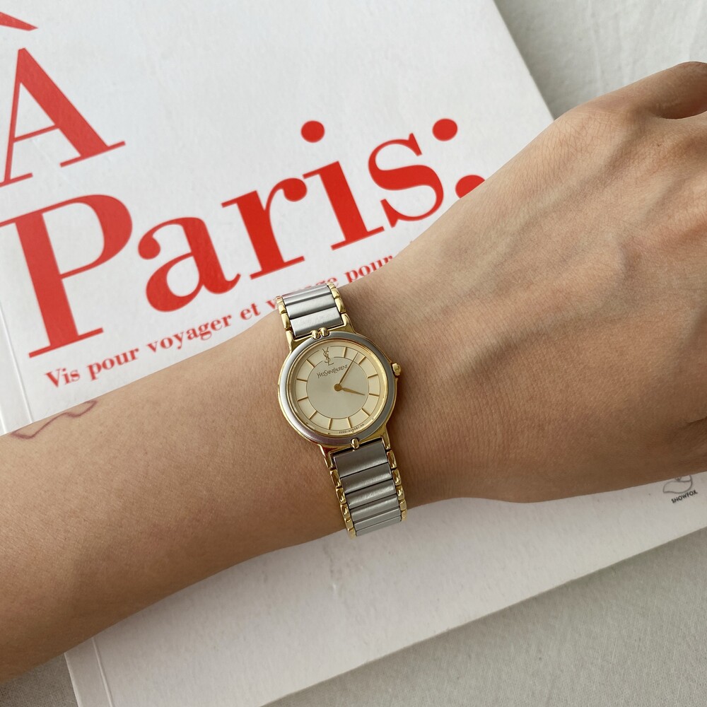 투톤 케이스에 골드 톤 입생로랑 로고 다이얼이 인상적인 시계입니다.