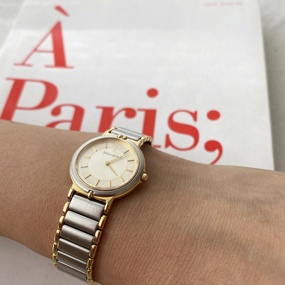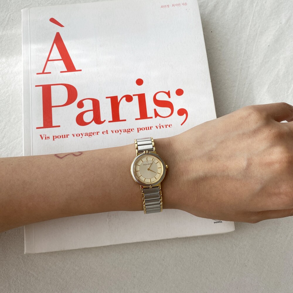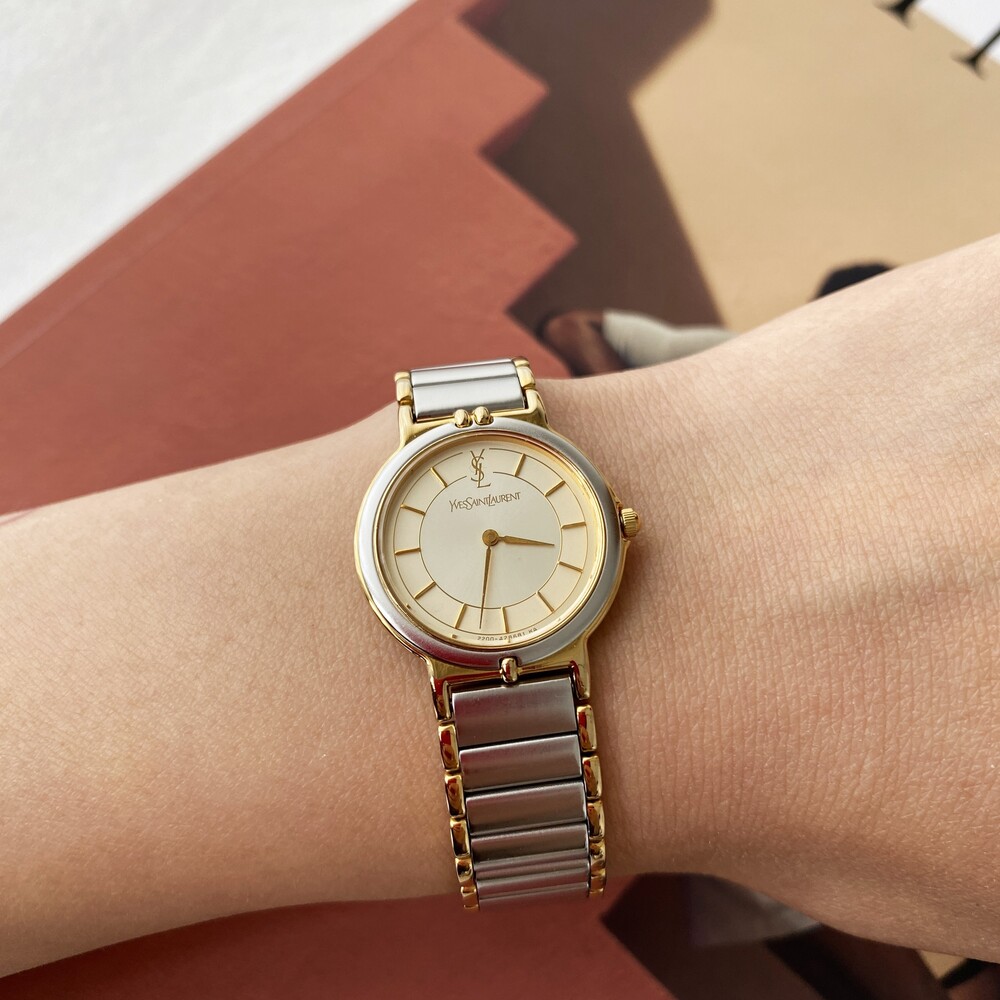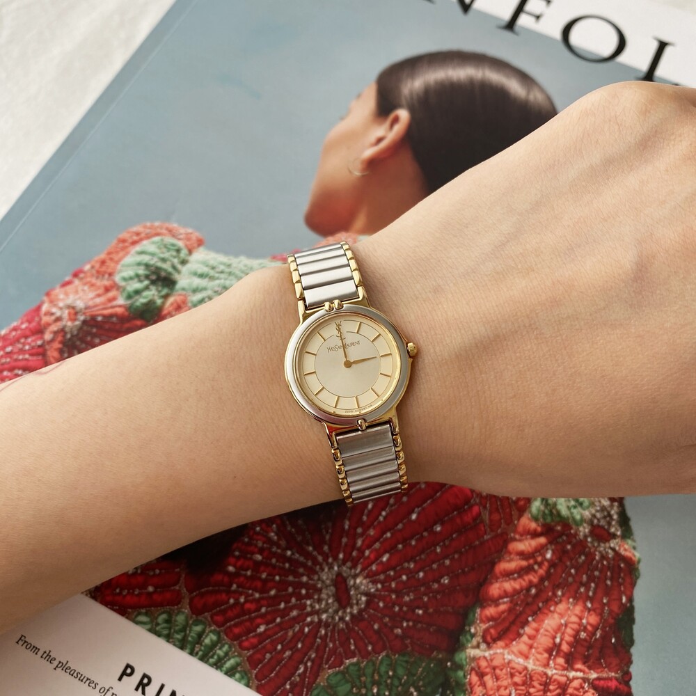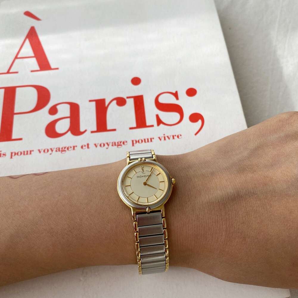 투톤 케이스에 골드 톤 입생로랑 로고 다이얼이 인상적인 시계입니다.