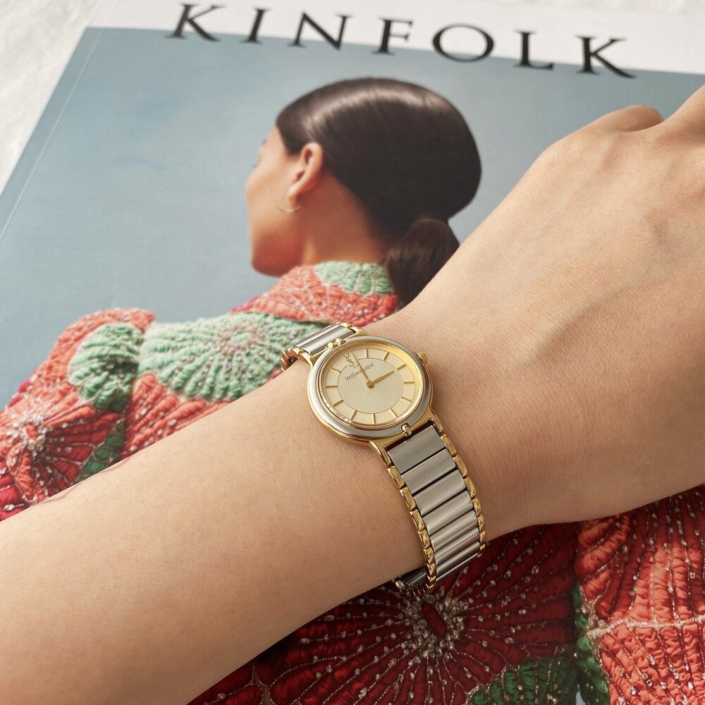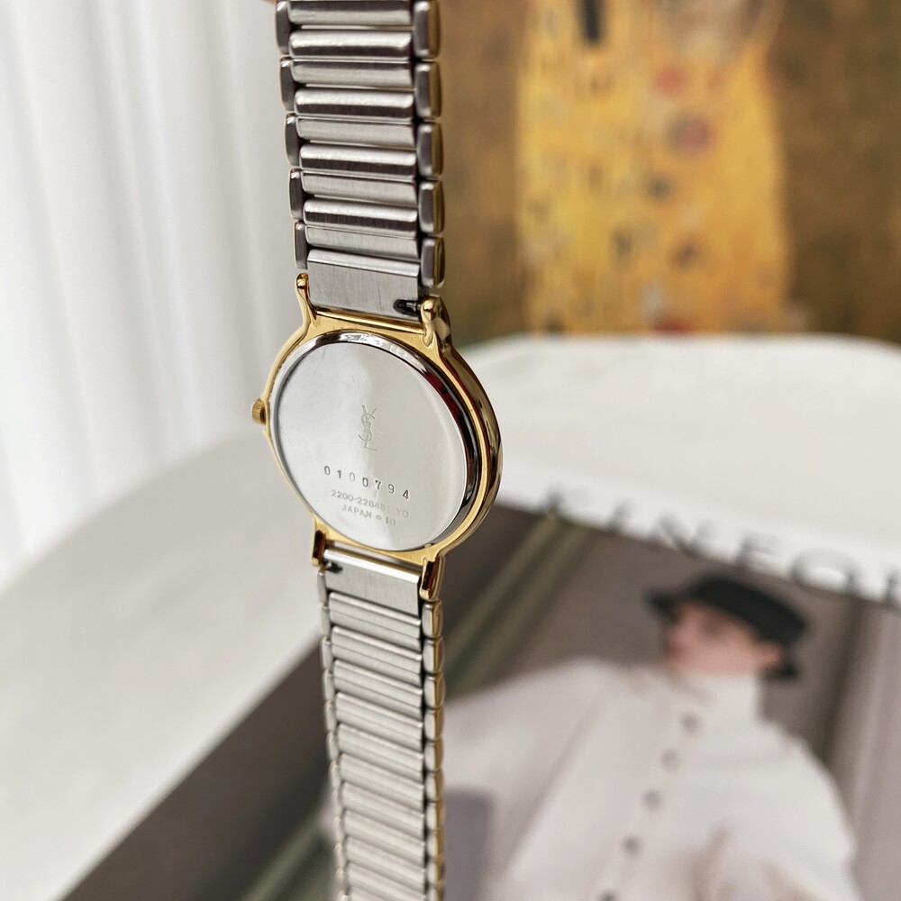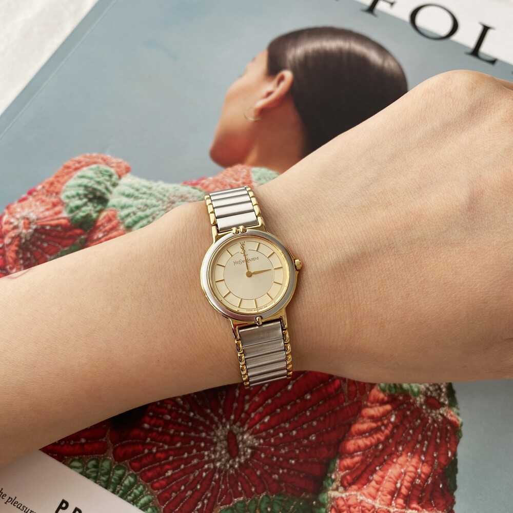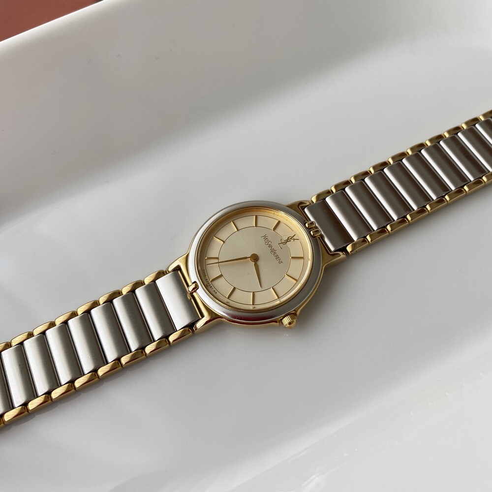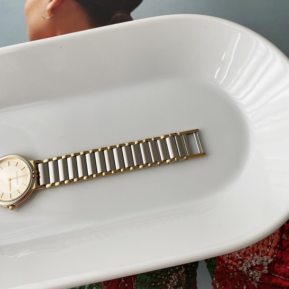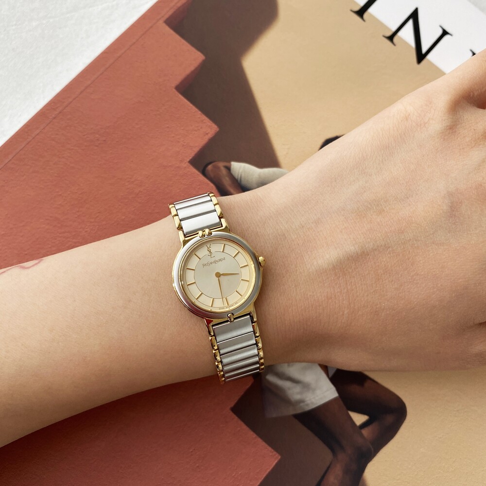 투톤 케이스에 골드 톤 입생로랑 로고 다이얼이 인상적인 시계입니다.
