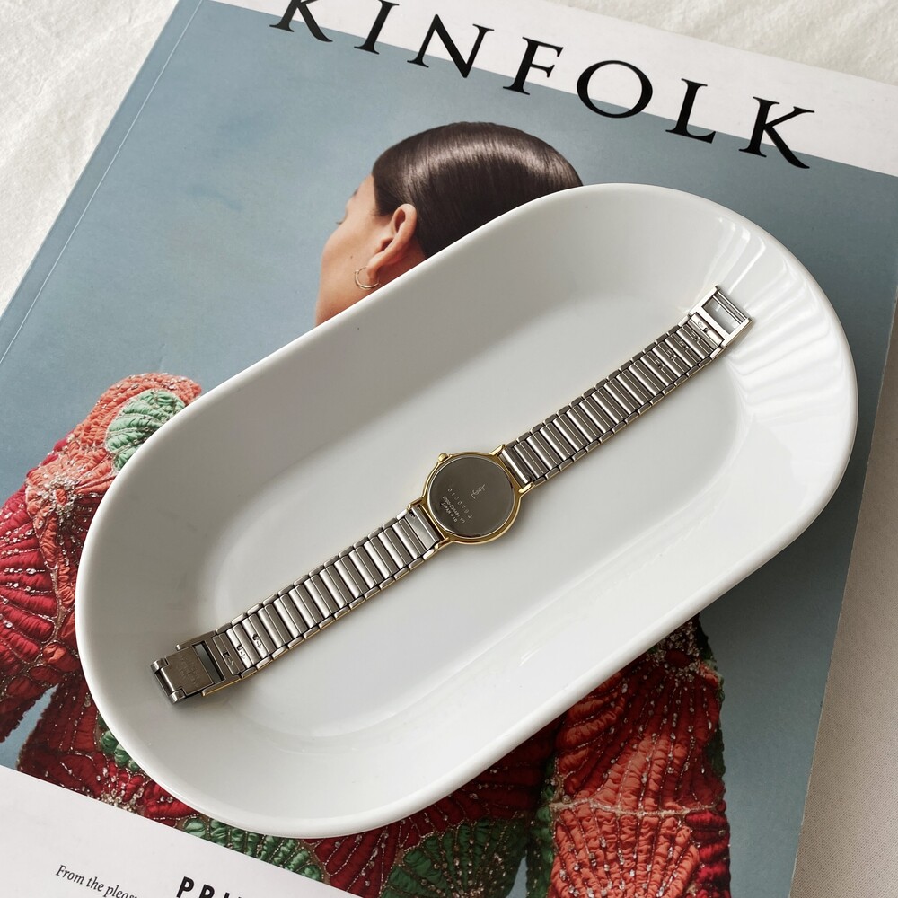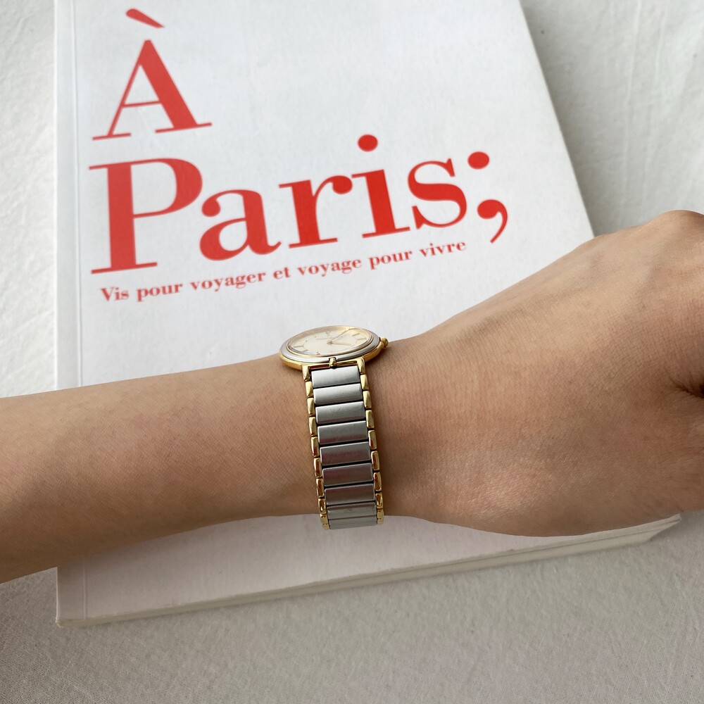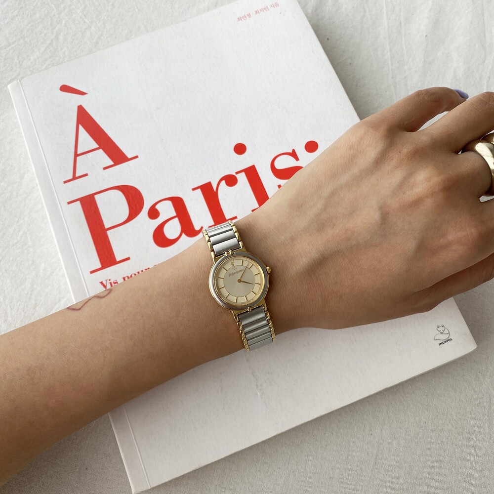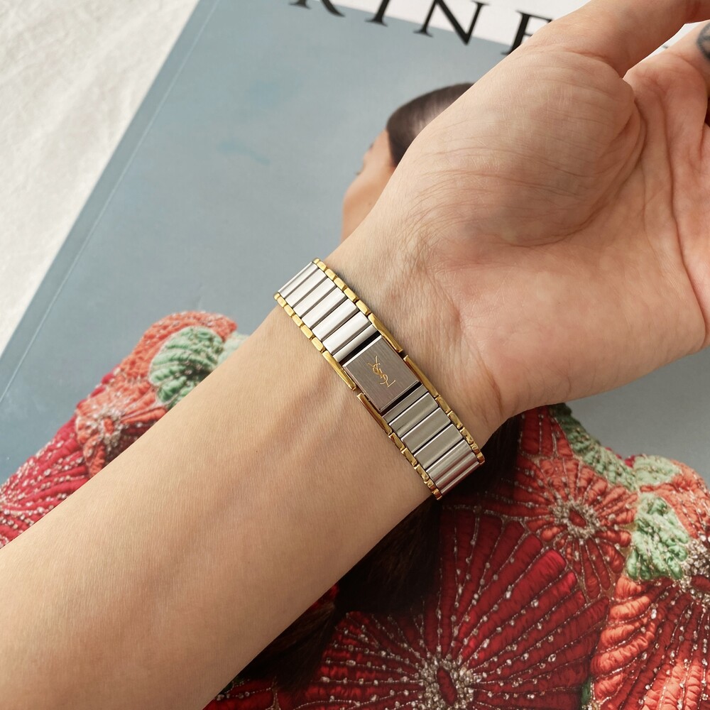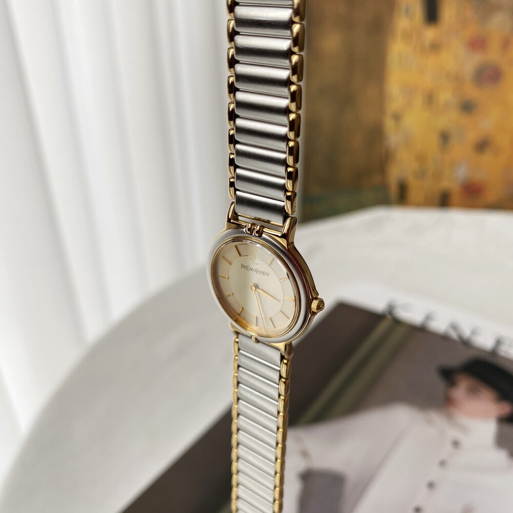 투톤 케이스에 골드 톤 입생로랑 로고 다이얼이 인상적인 시계입니다.