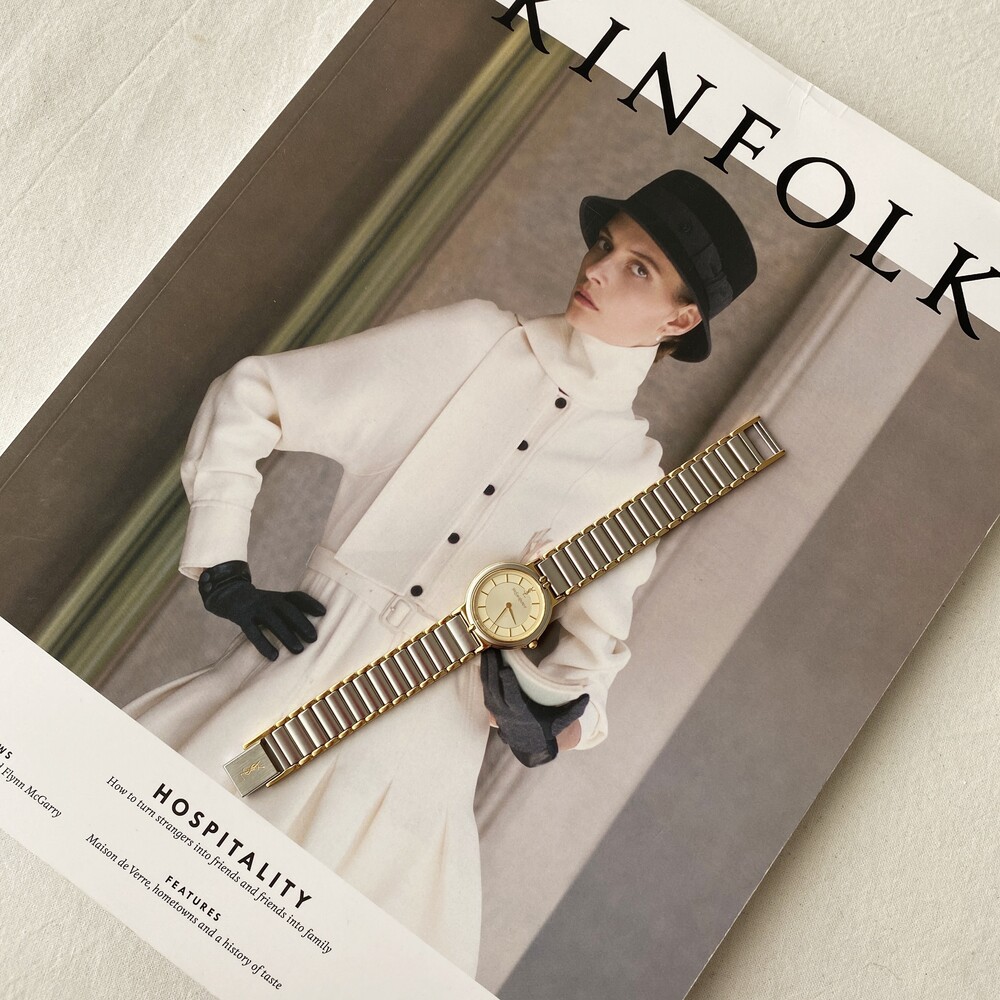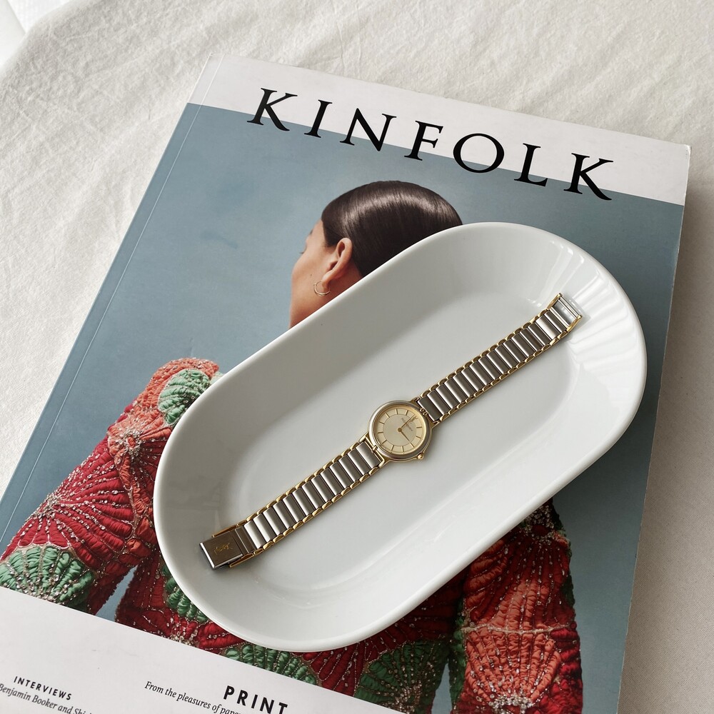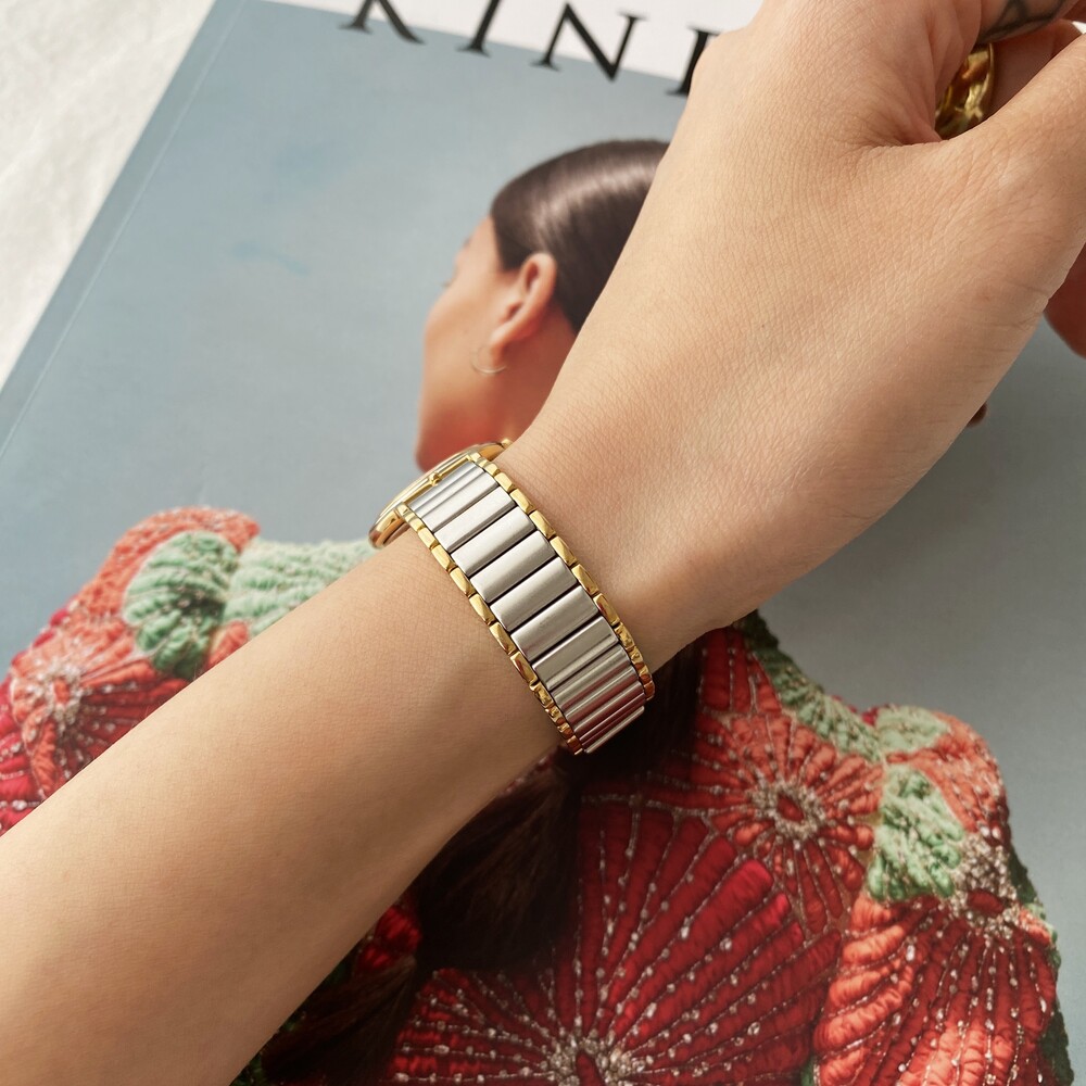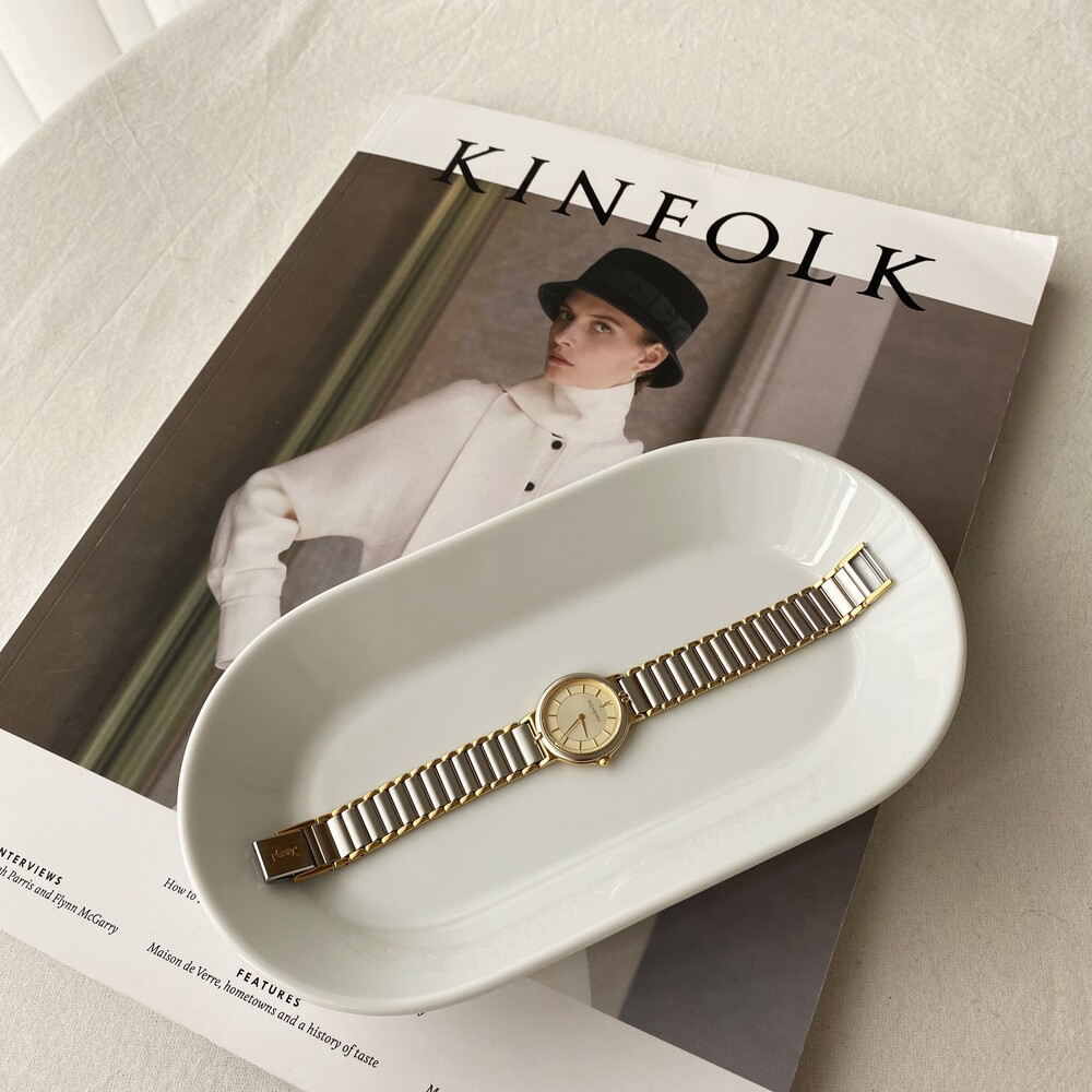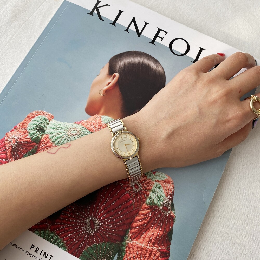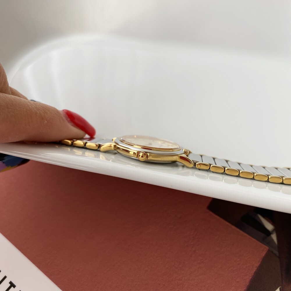 투톤 케이스에 골드 톤 입생로랑 로고 다이얼이 인상적인 시계입니다.