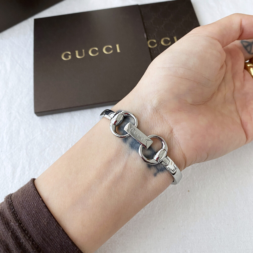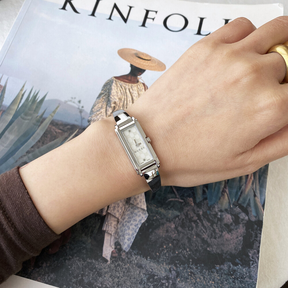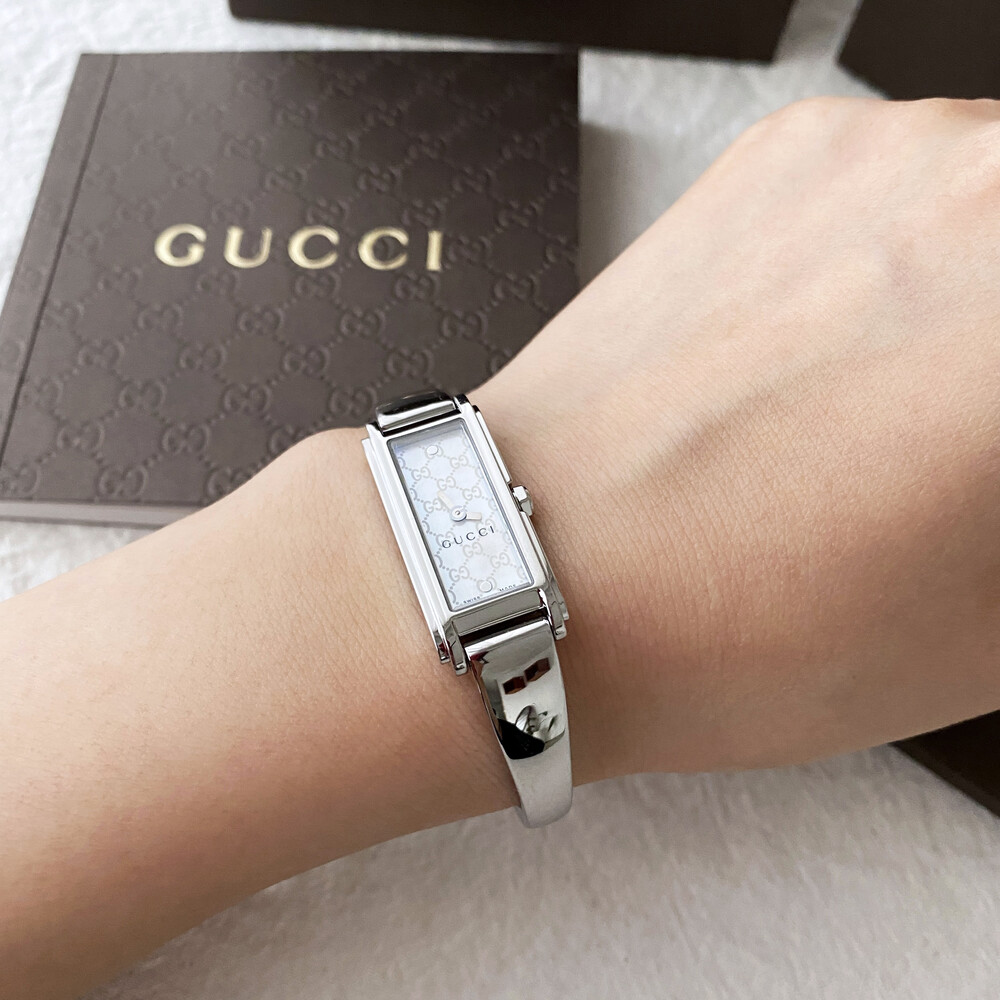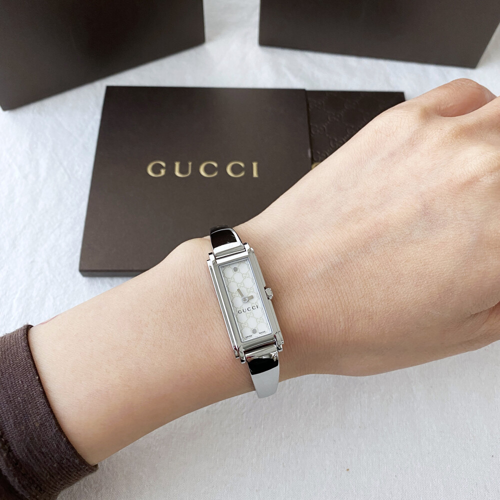 실버 케이스와 자개로 만들어진 다이얼 위를 장식하는 GG 자가드가