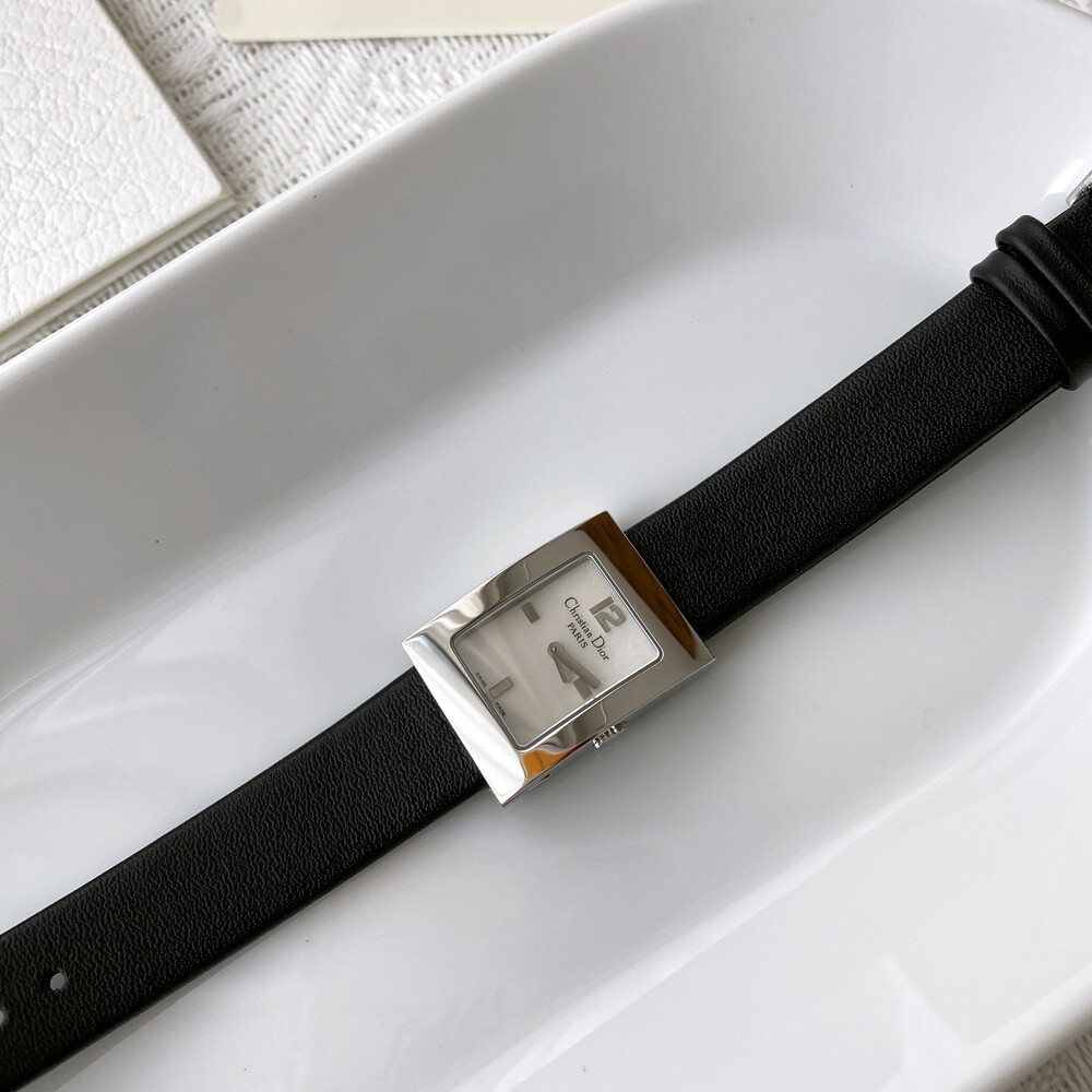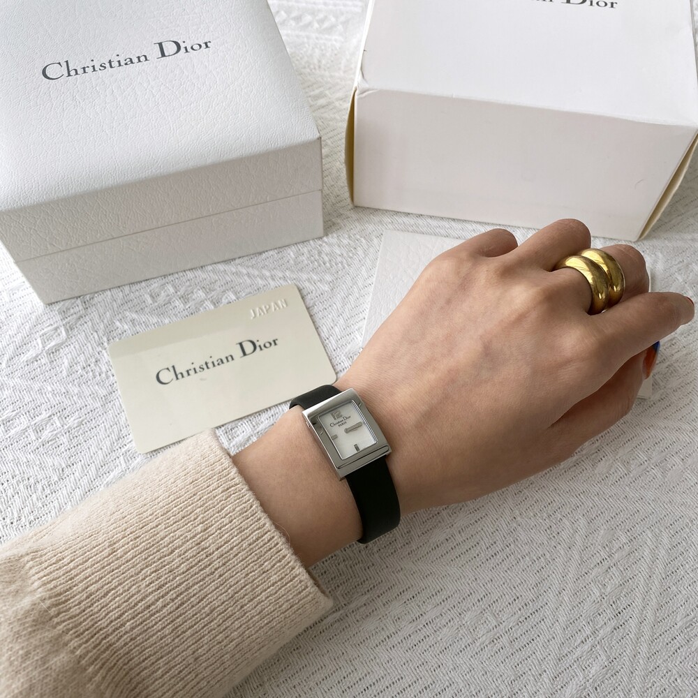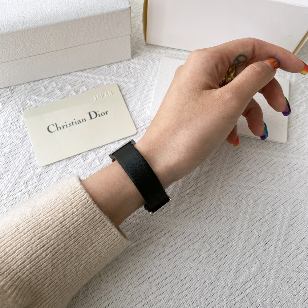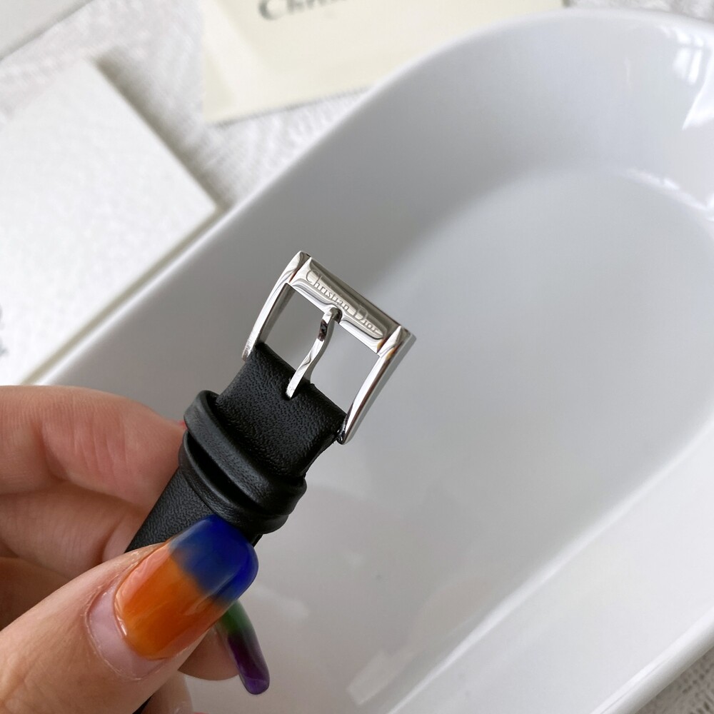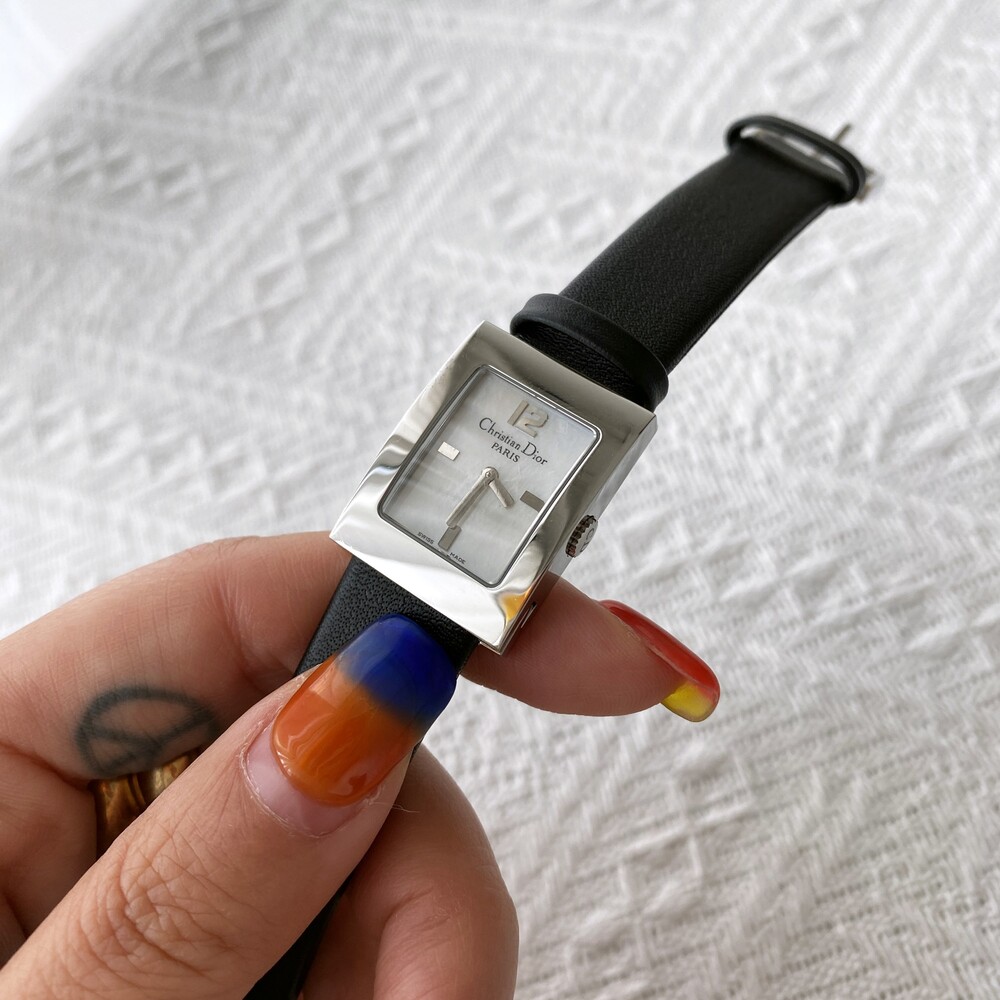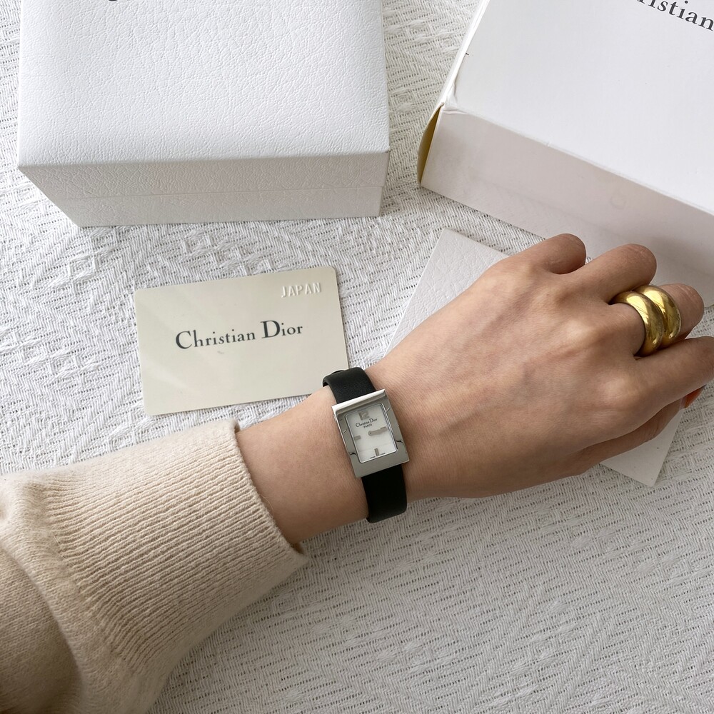 자개로 만들어진 다이얼 위를 장식하는 디올 로고가 아름다운 디올 시계입니다.