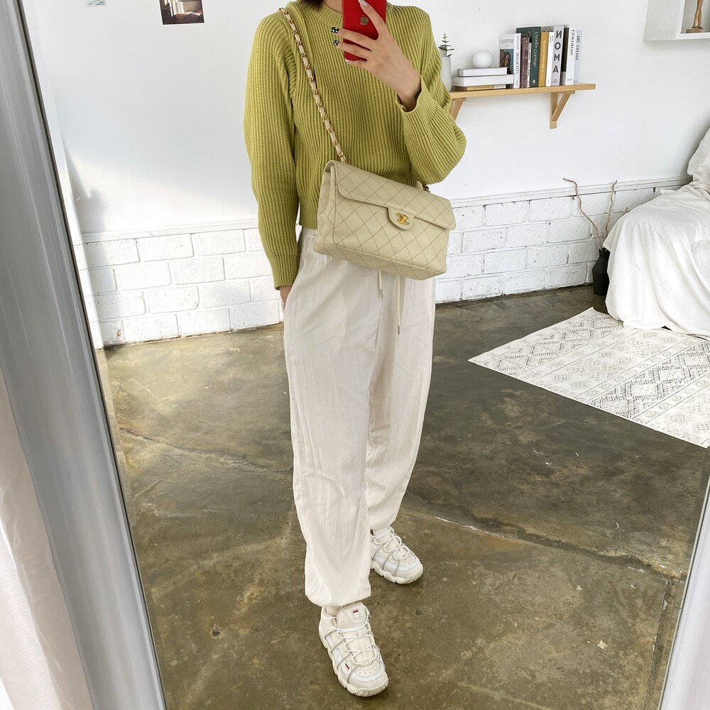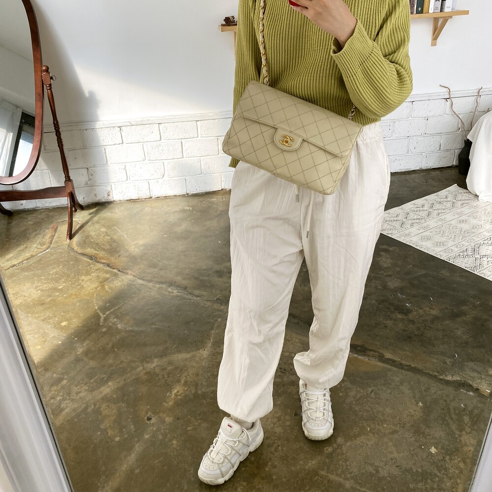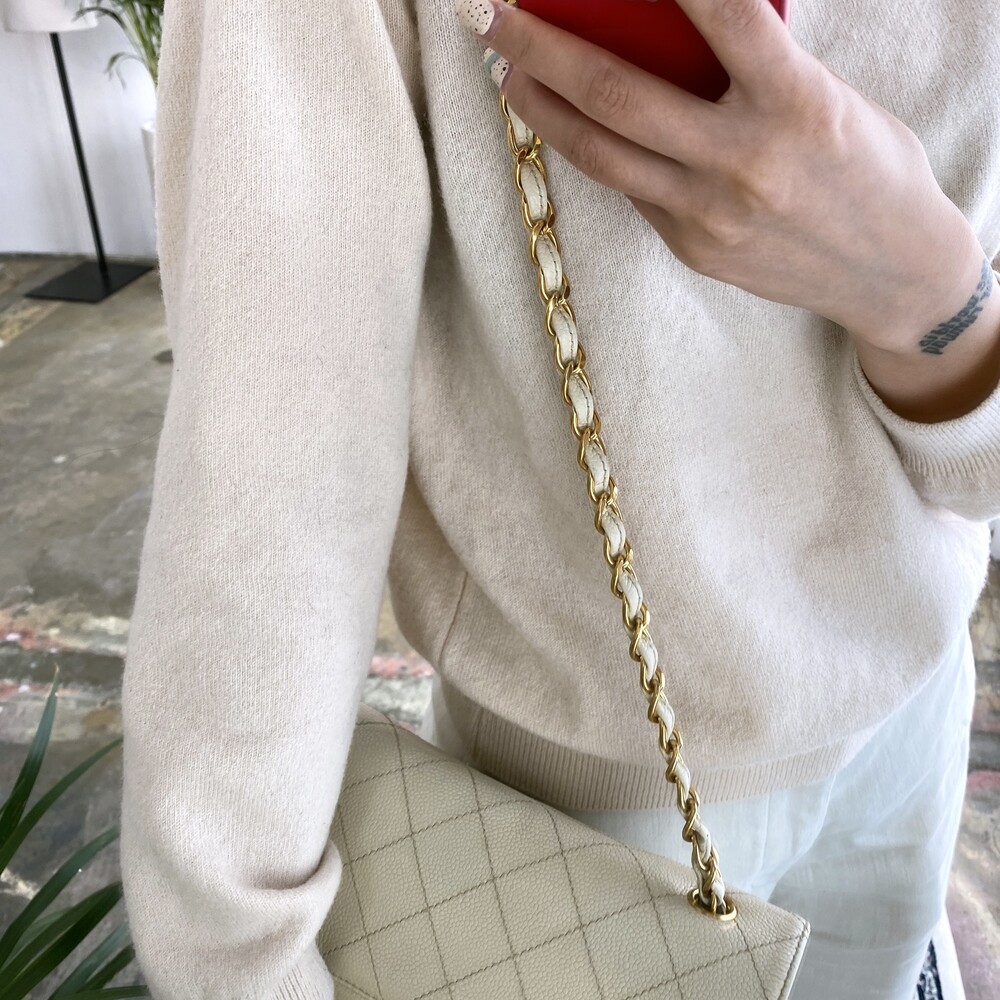 캐비어 가죽 트림과 중앙 샤넬 심볼이 굉장히 아름다운 샤넬 백입니다.