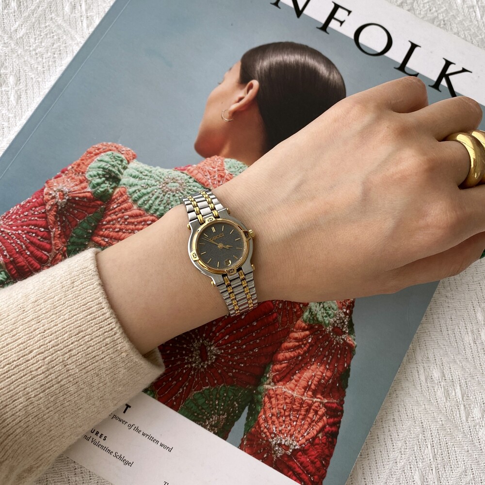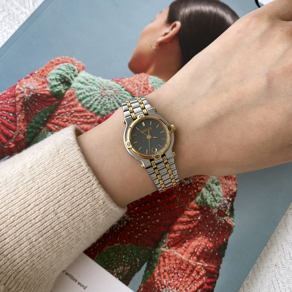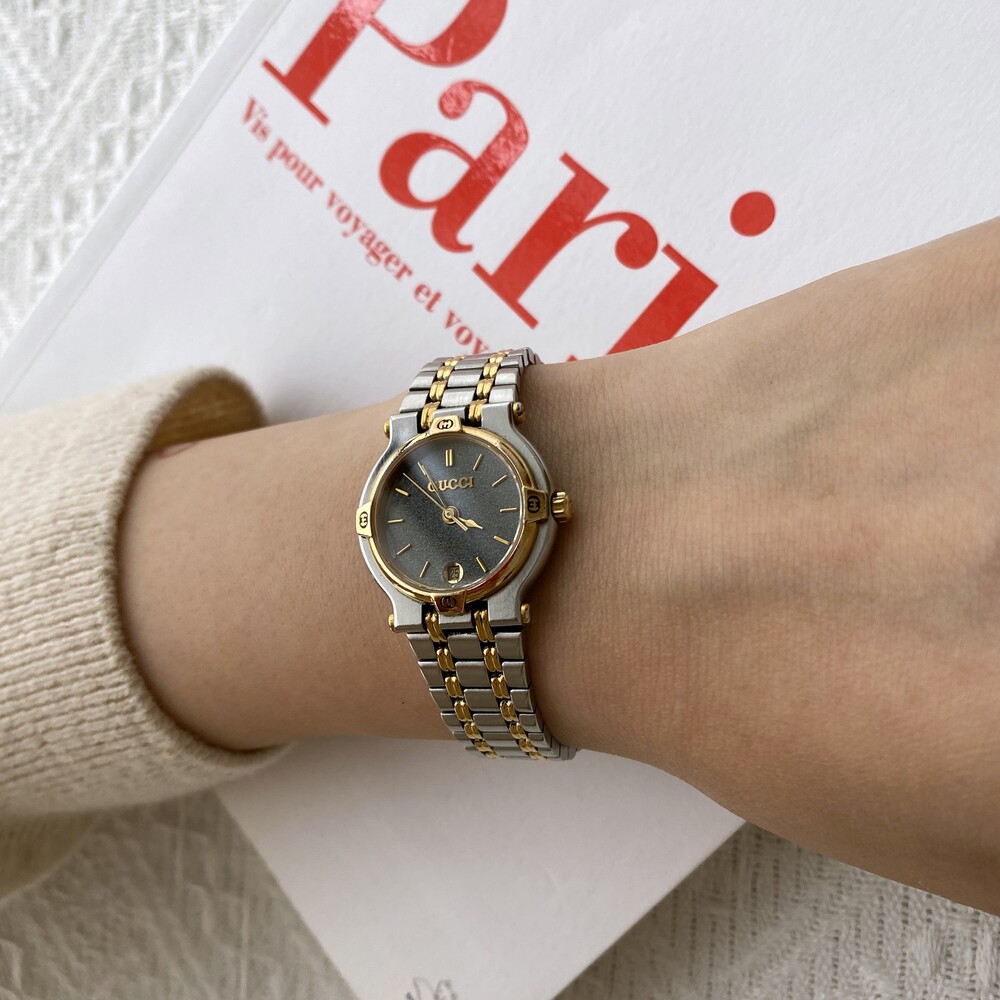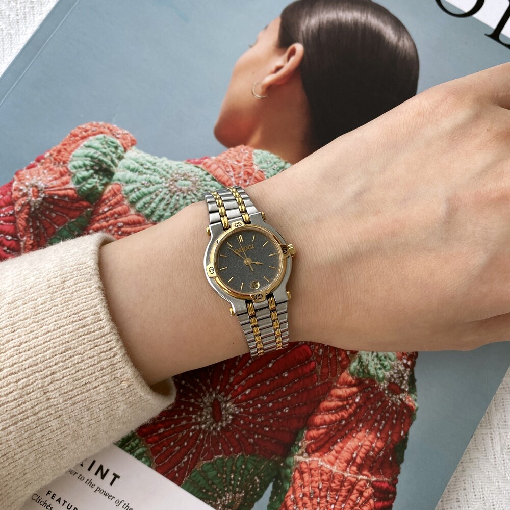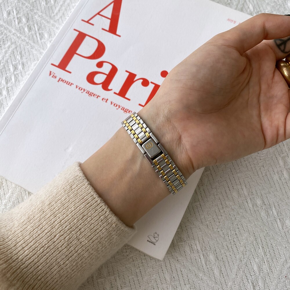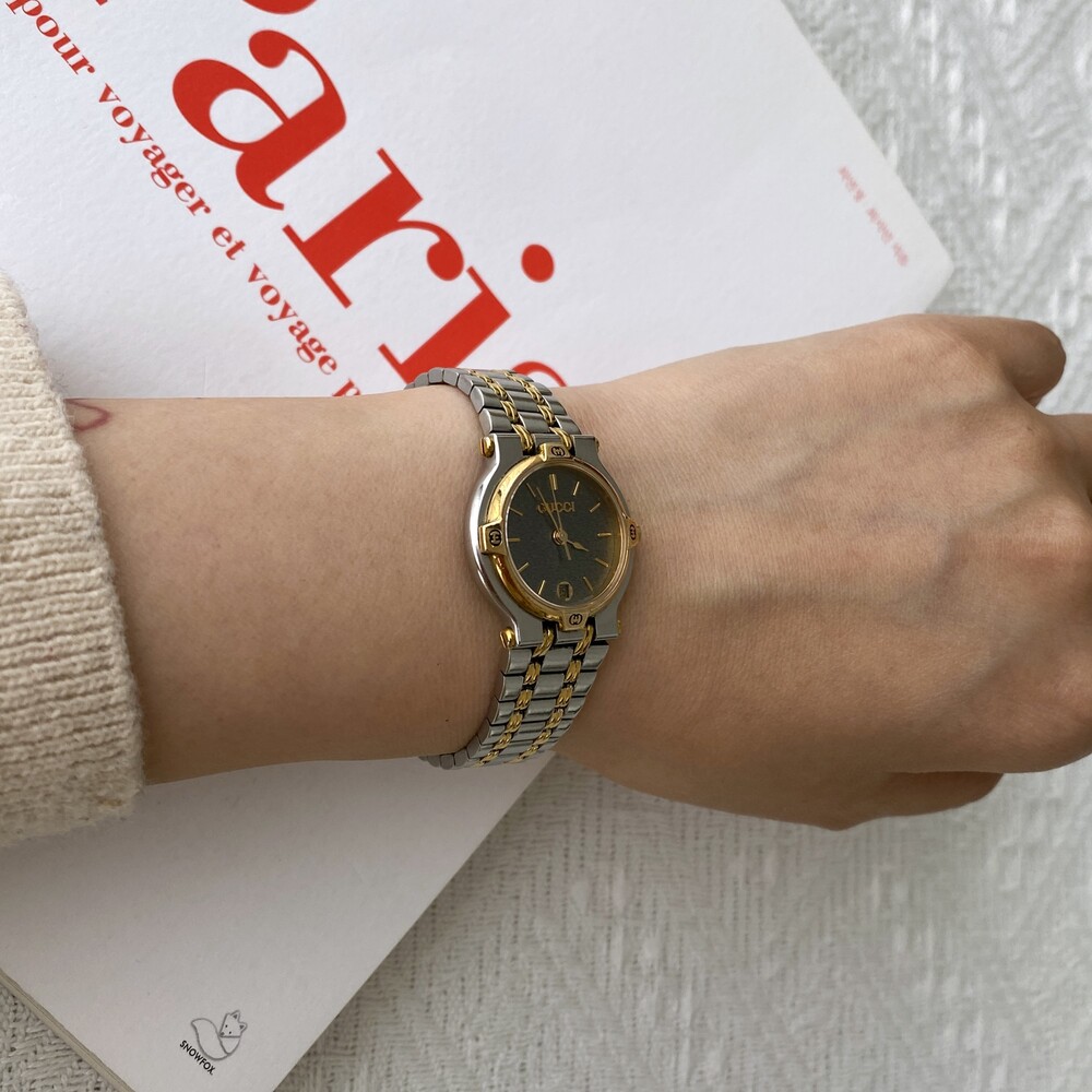 실버 톤 케이스와 골드톤 베젤, 그리고 베젤 위를 장식하는 구찌 심볼과