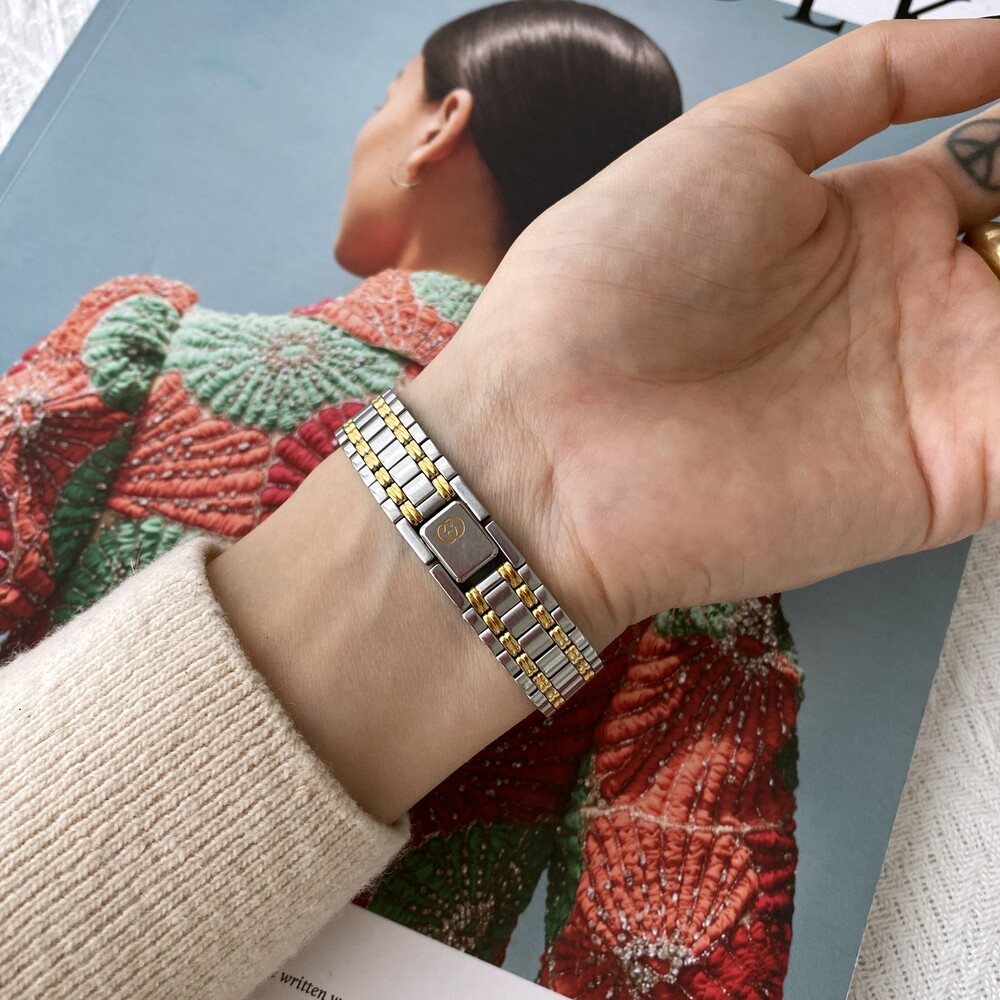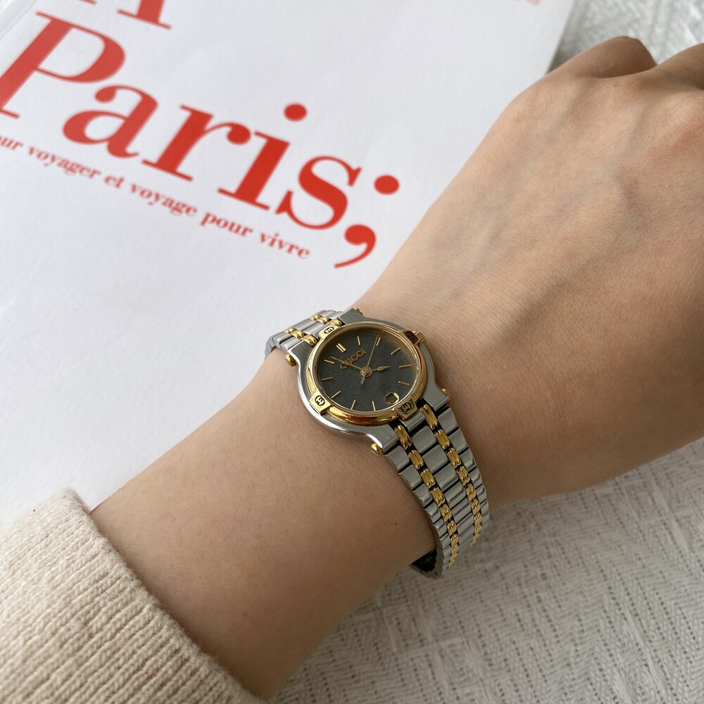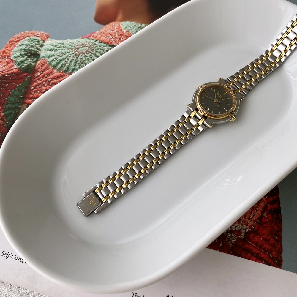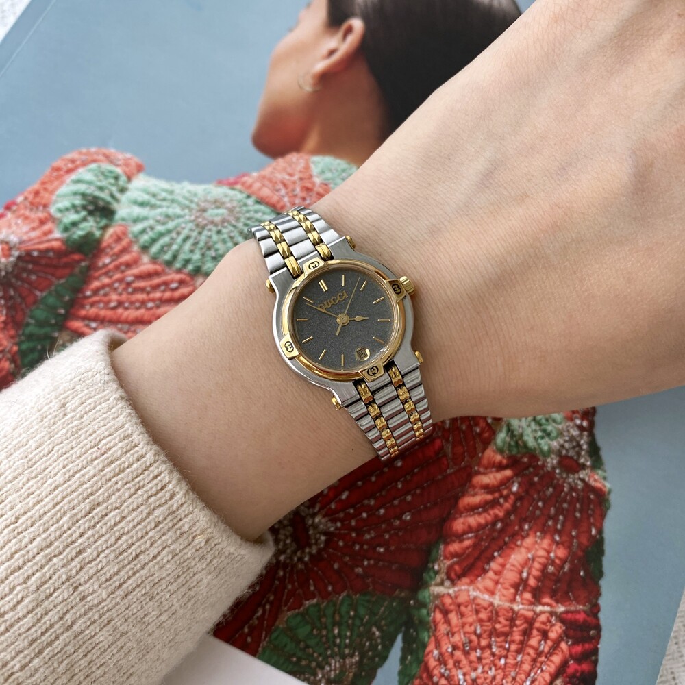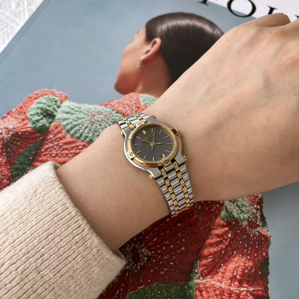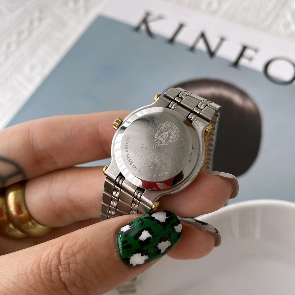 실버 톤 케이스와 골드톤 베젤, 그리고 베젤 위를 장식하는 구찌 심볼과