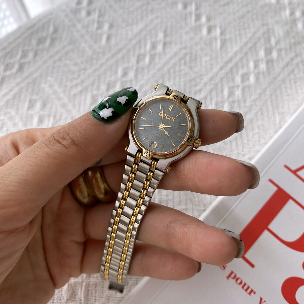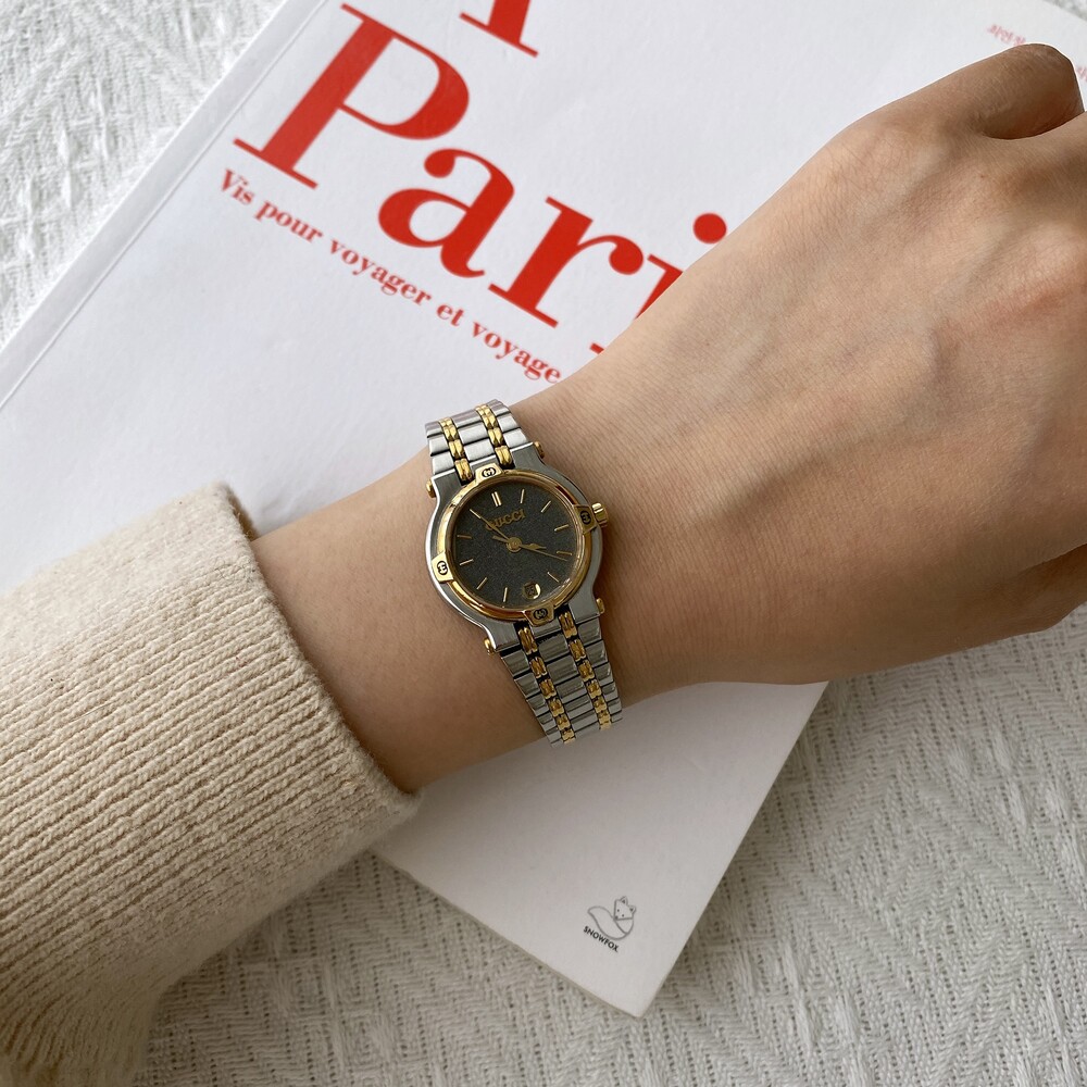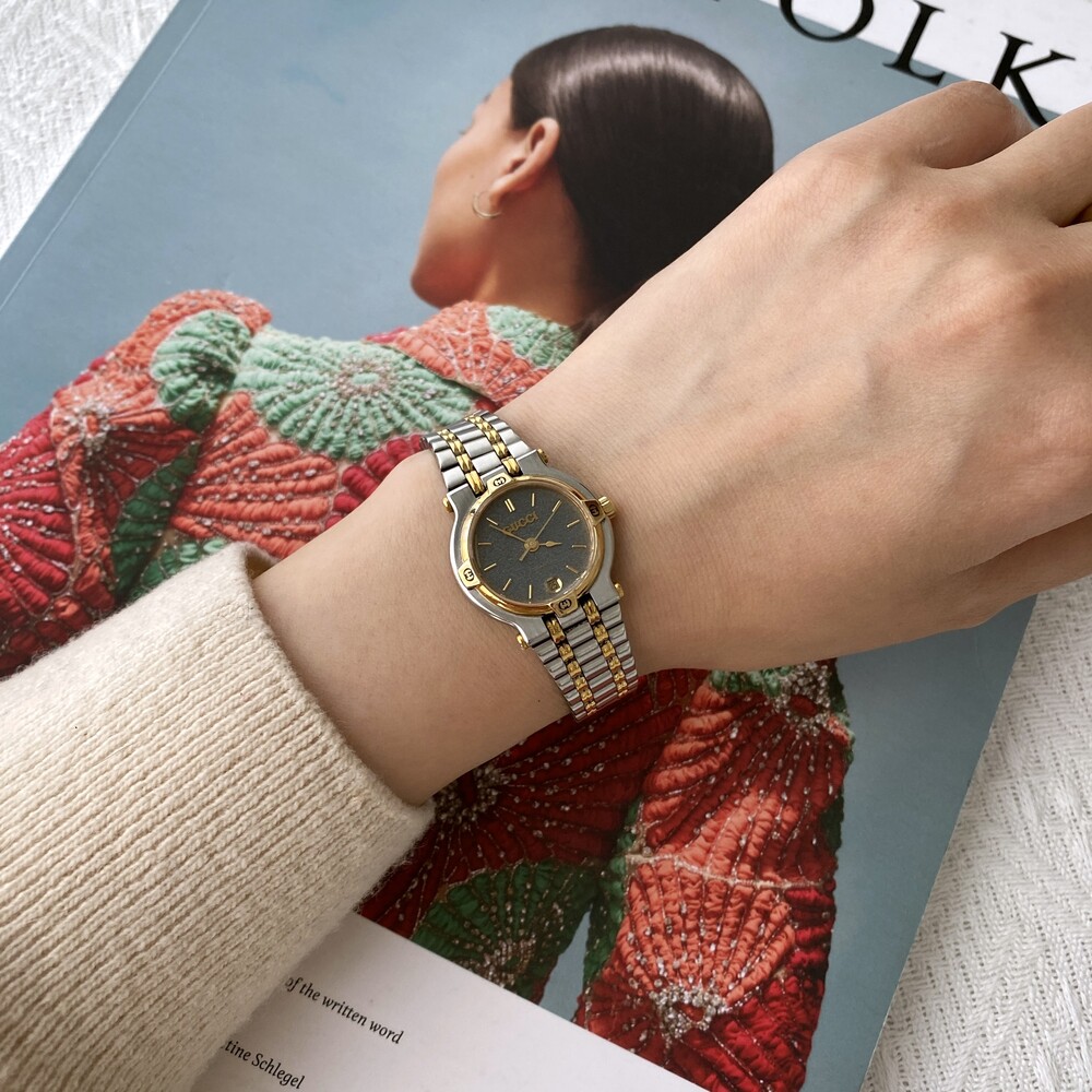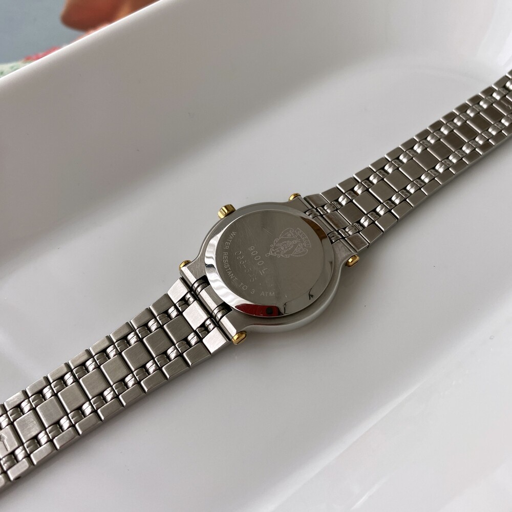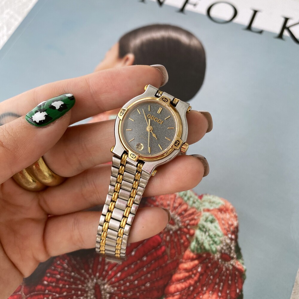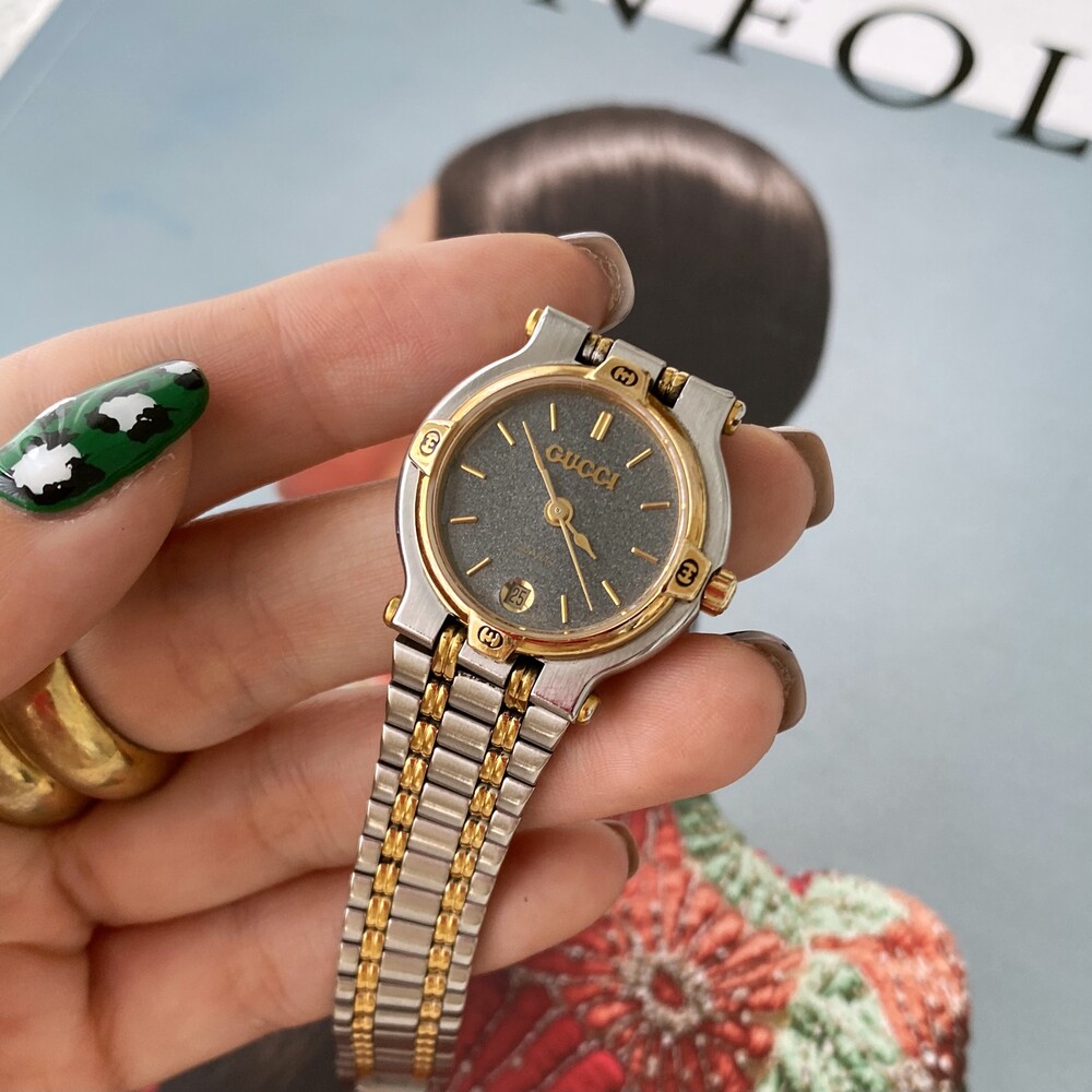 실버 톤 케이스와 골드톤 베젤, 그리고 베젤 위를 장식하는 구찌 심볼과