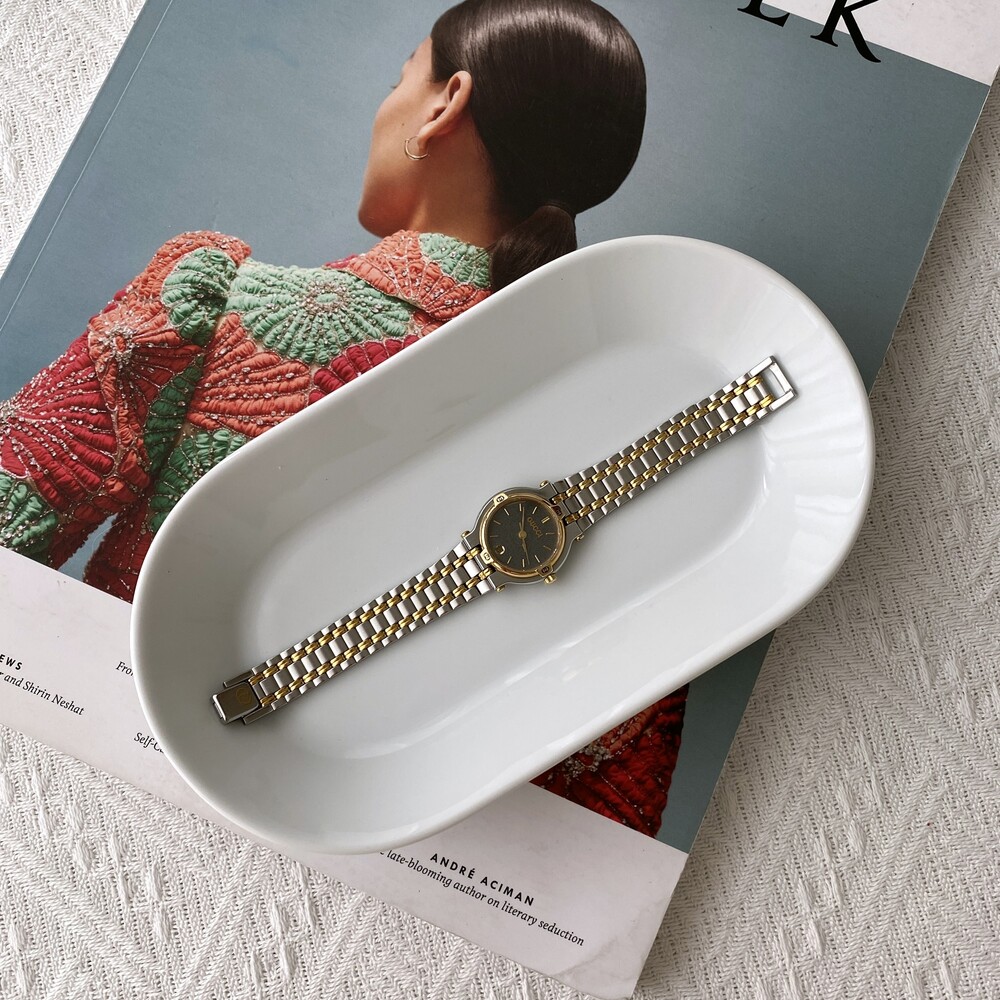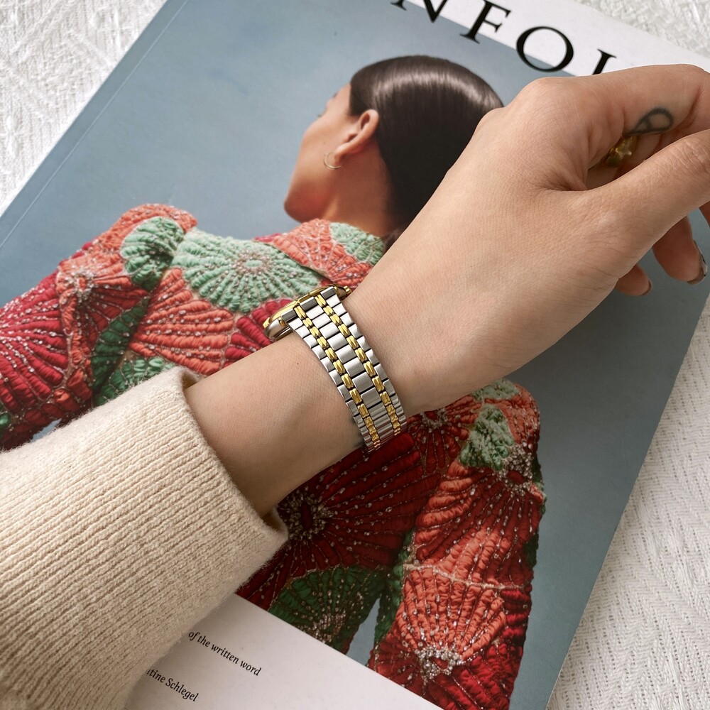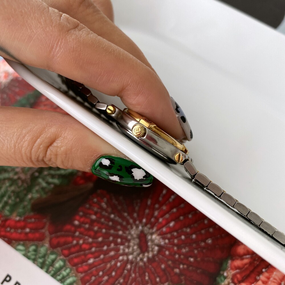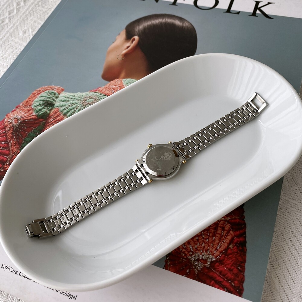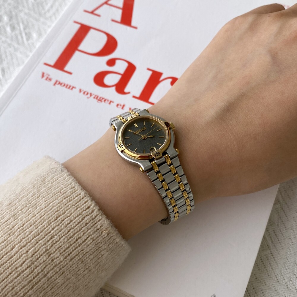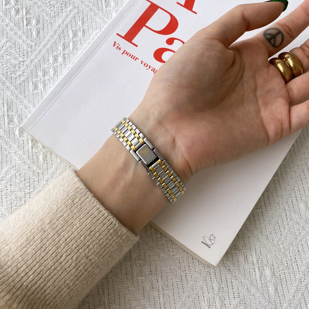 실버 톤 케이스와 골드톤 베젤, 그리고 베젤 위를 장식하는 구찌 심볼과