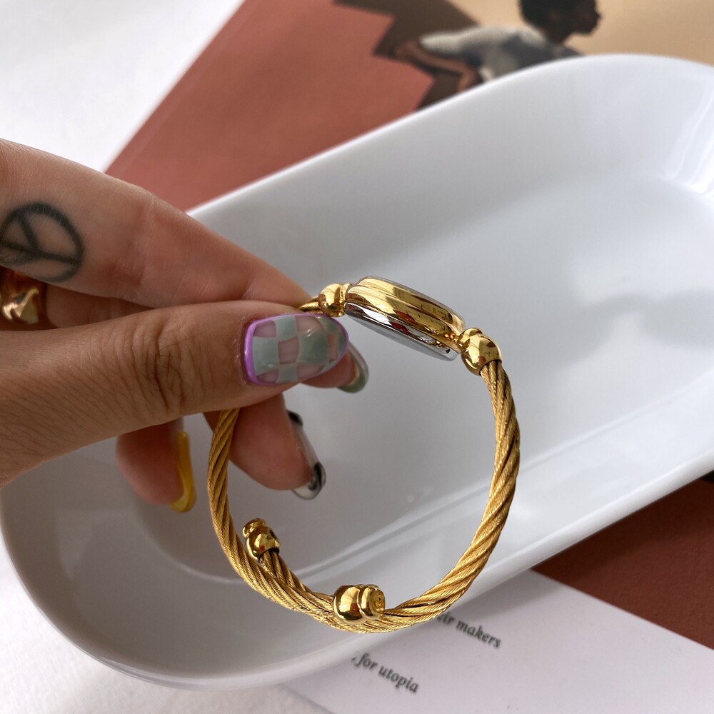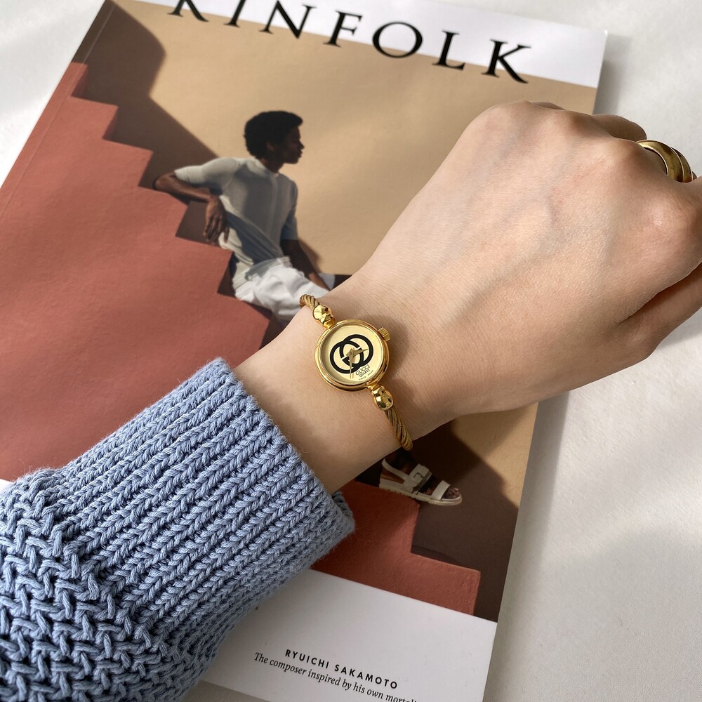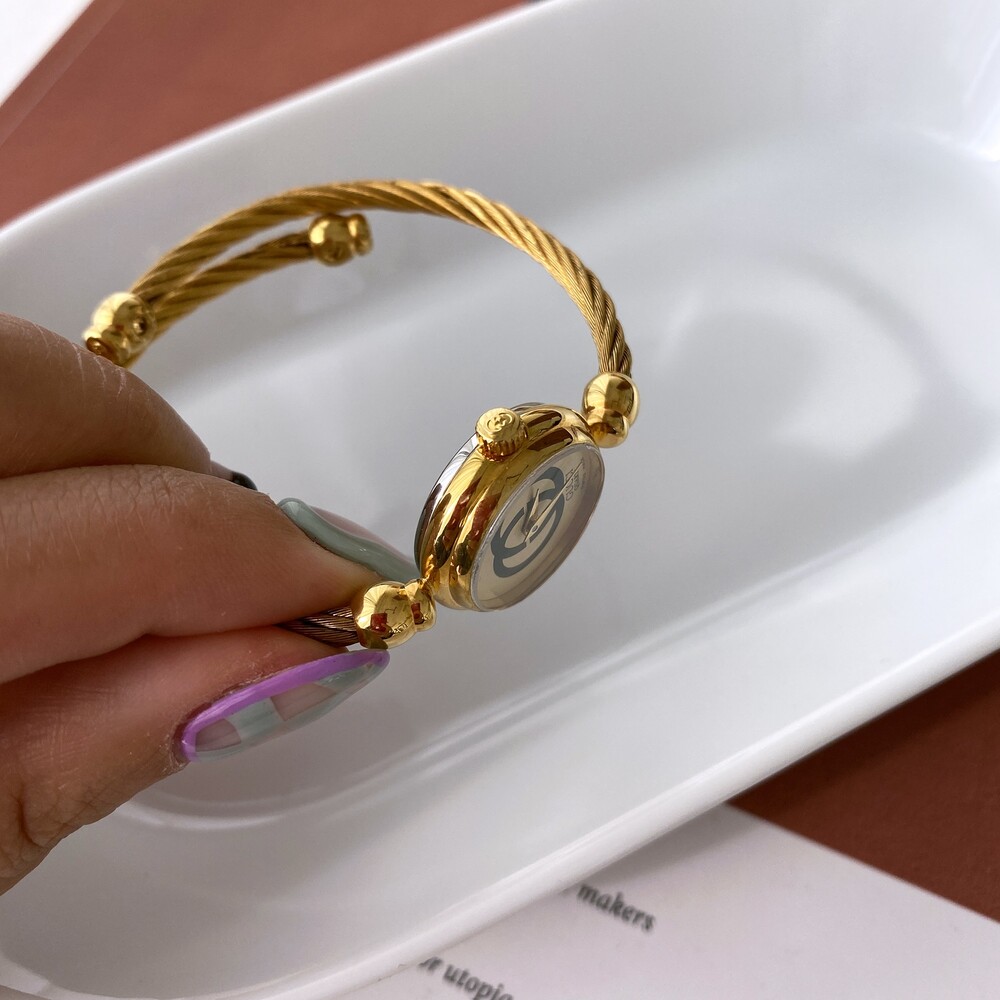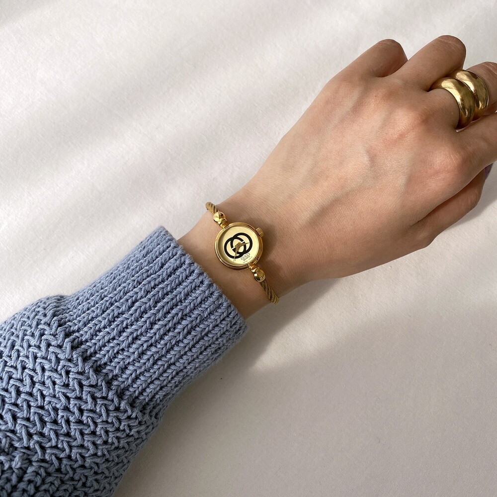 골드톤 케이스와 플렉시블 한 팔찌 형태의 시계줄로