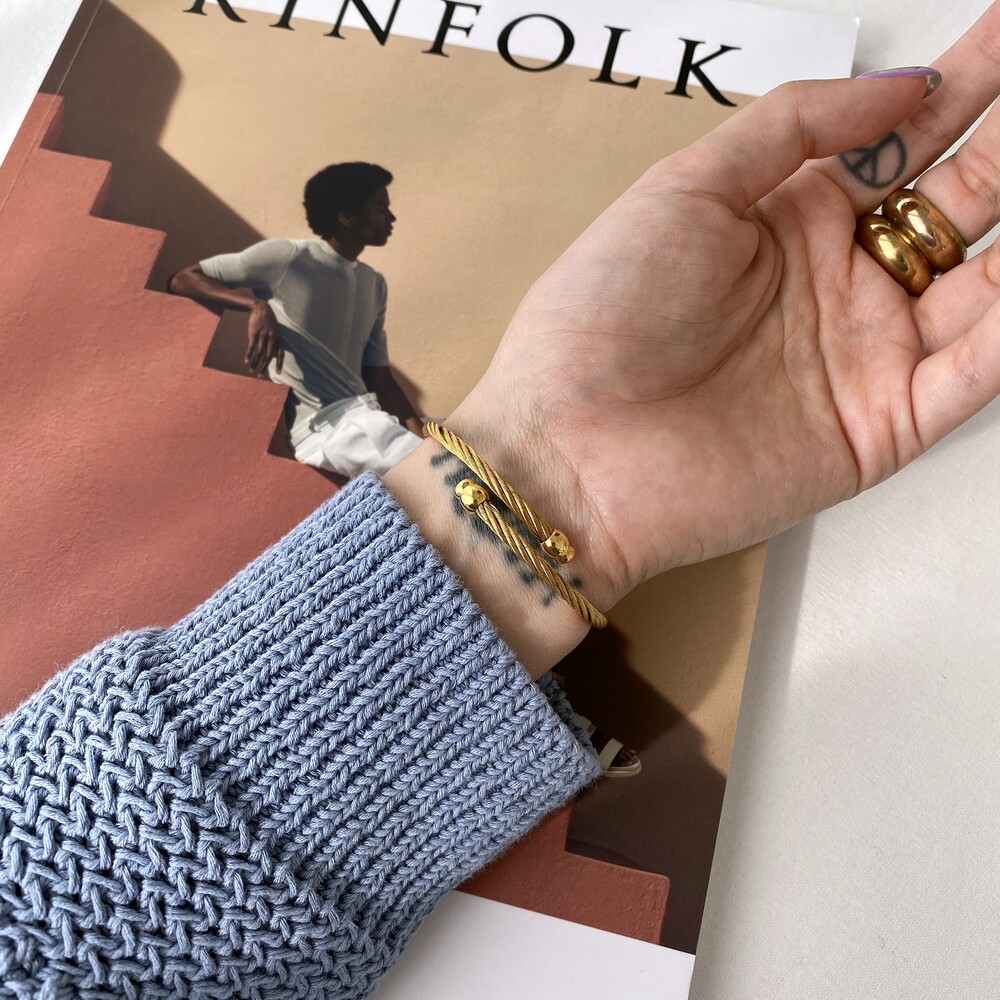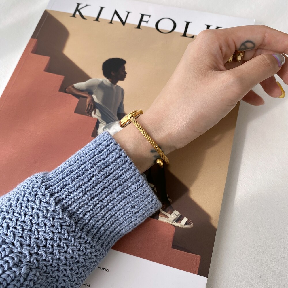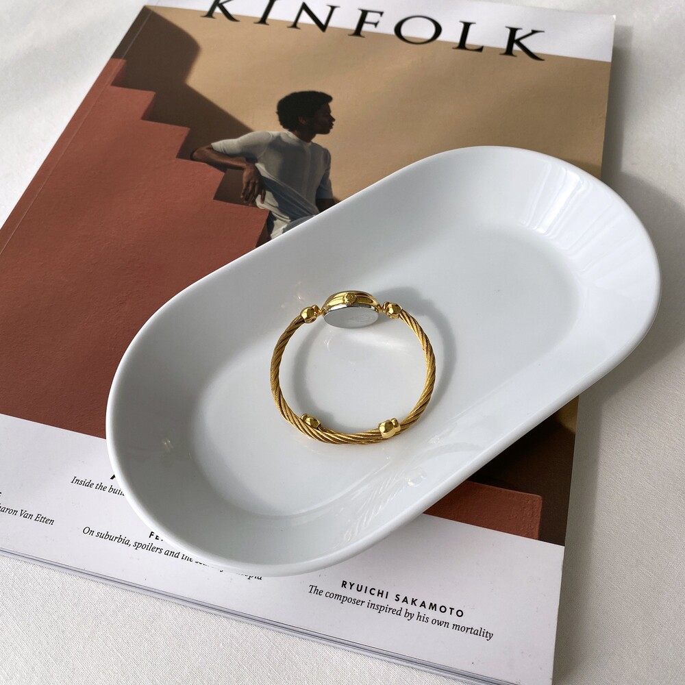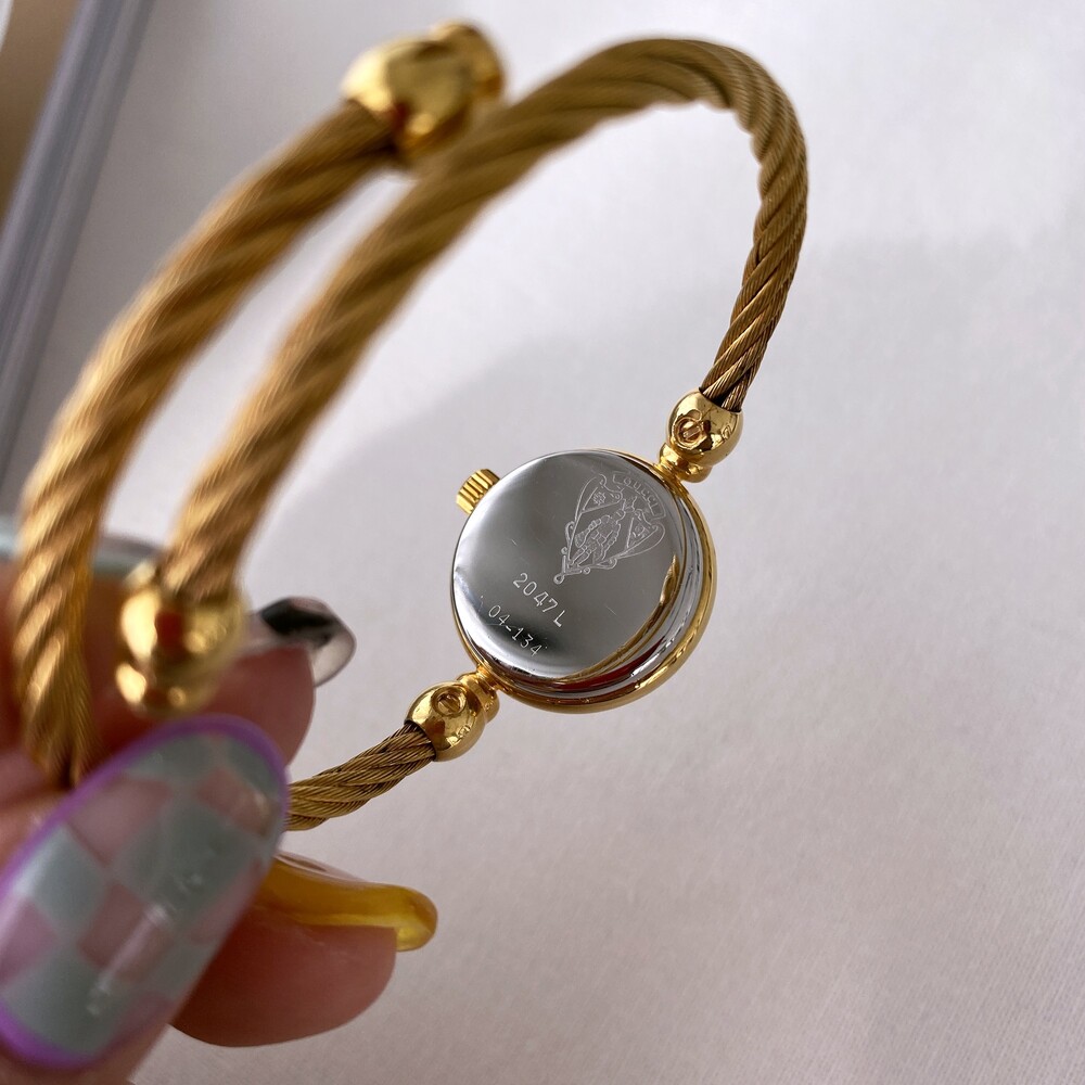 골드톤 케이스와 플렉시블 한 팔찌 형태의 시계줄로