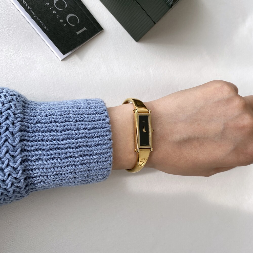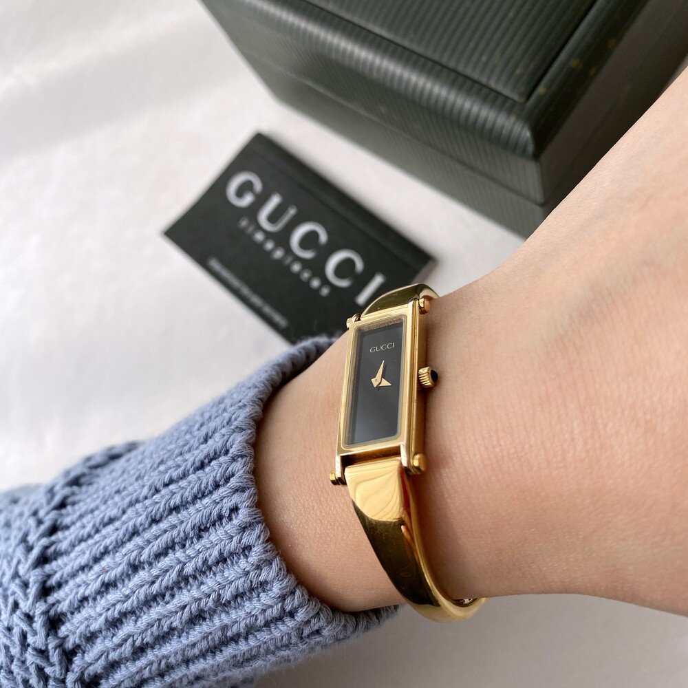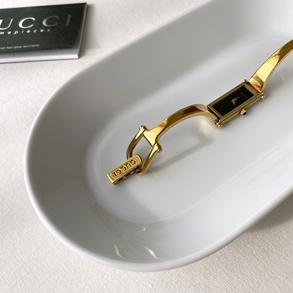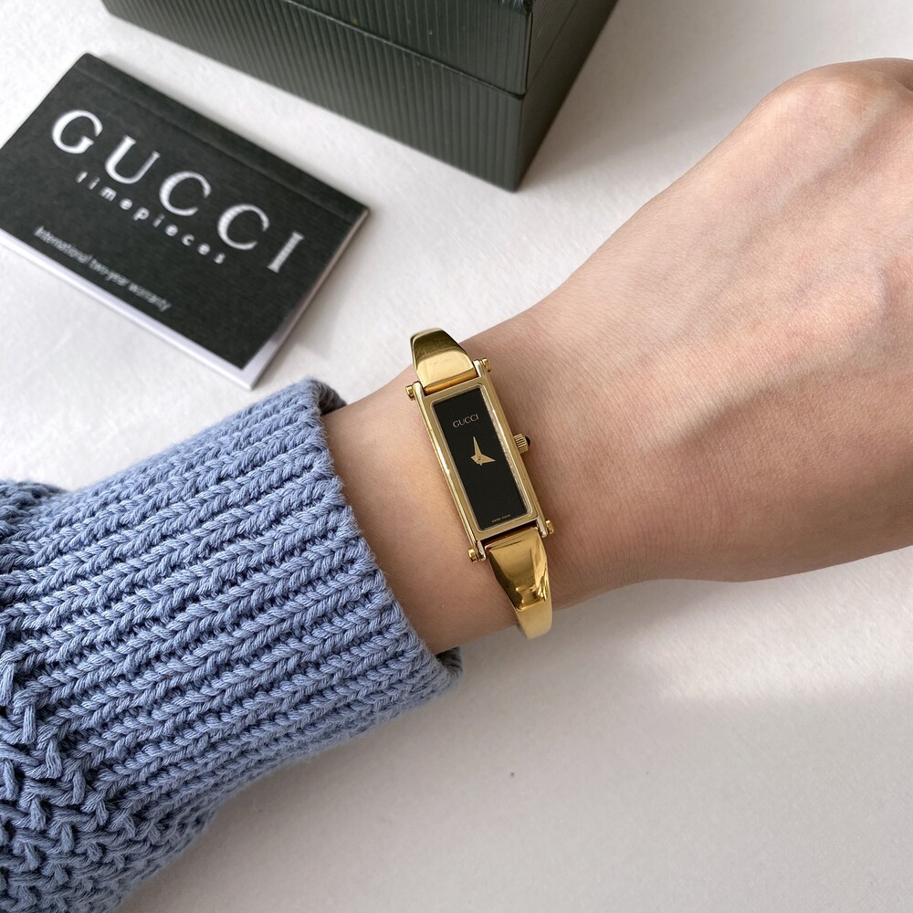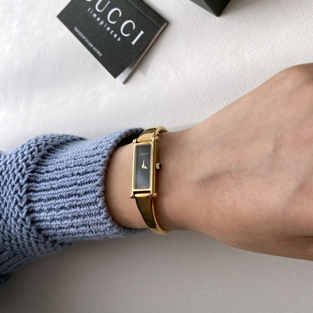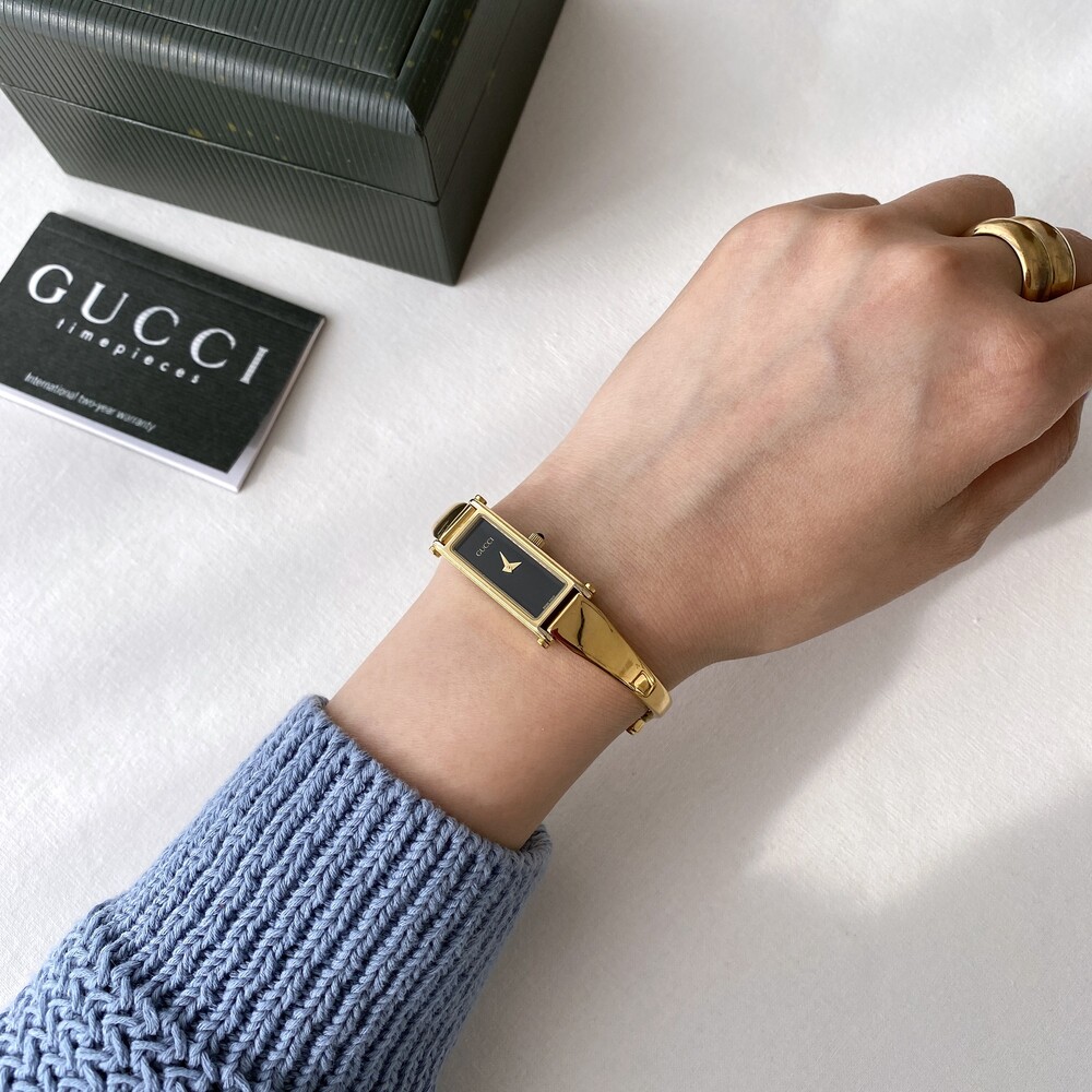 골드 톤 스퀘어 타입의 시계와 블랙 다이얼 위를 장식하는 구찌 로고,