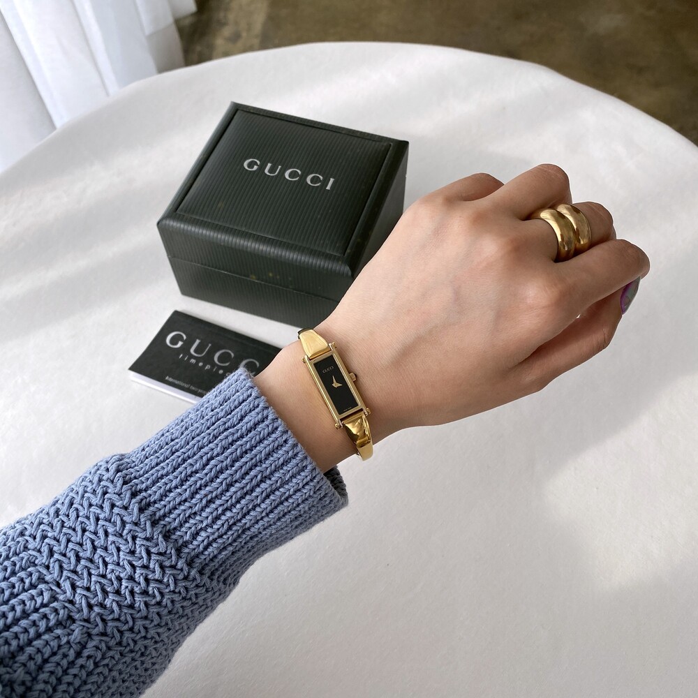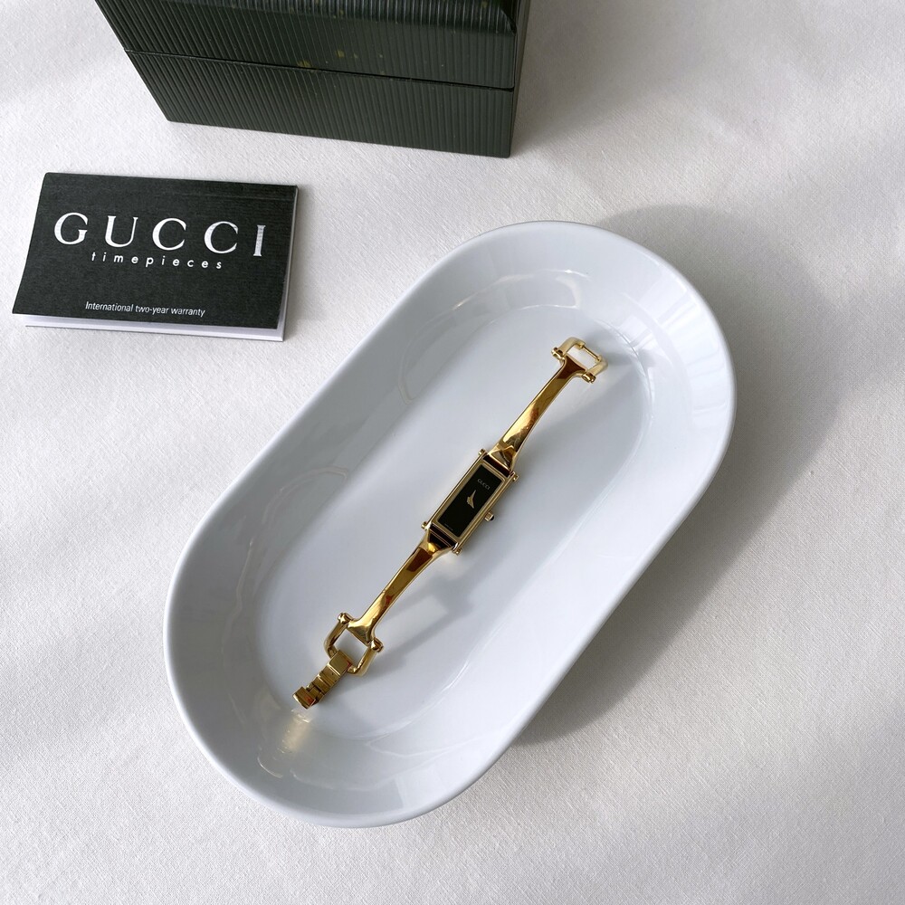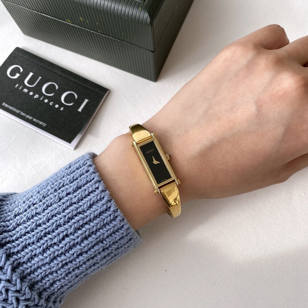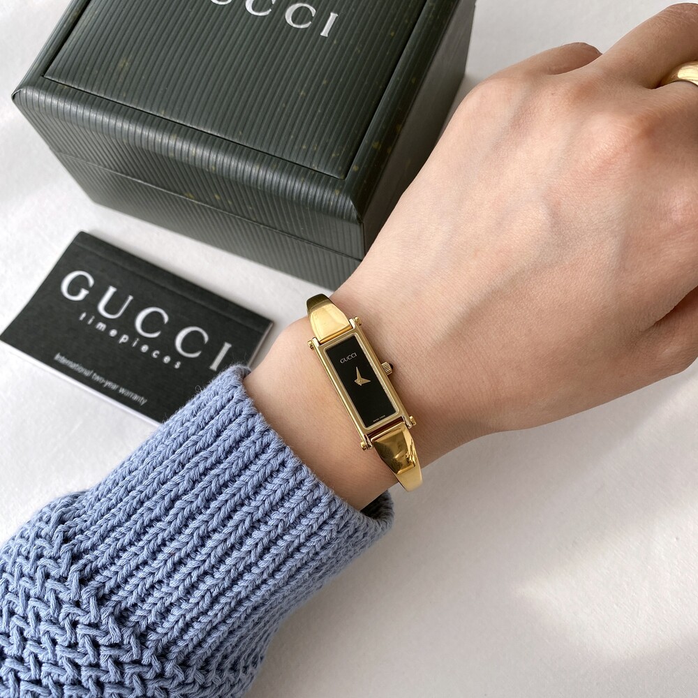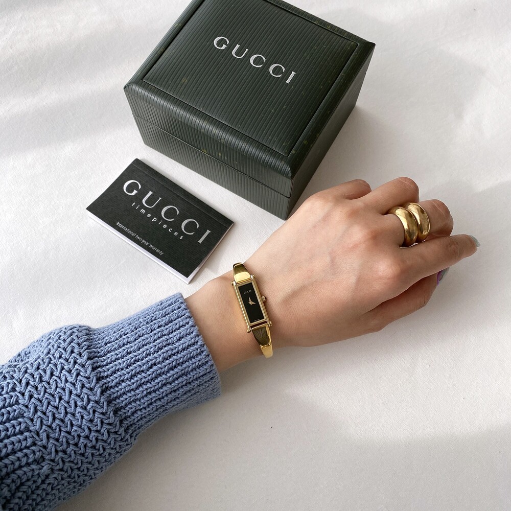 골드 톤 스퀘어 타입의 시계와 블랙 다이얼 위를 장식하는 구찌 로고,