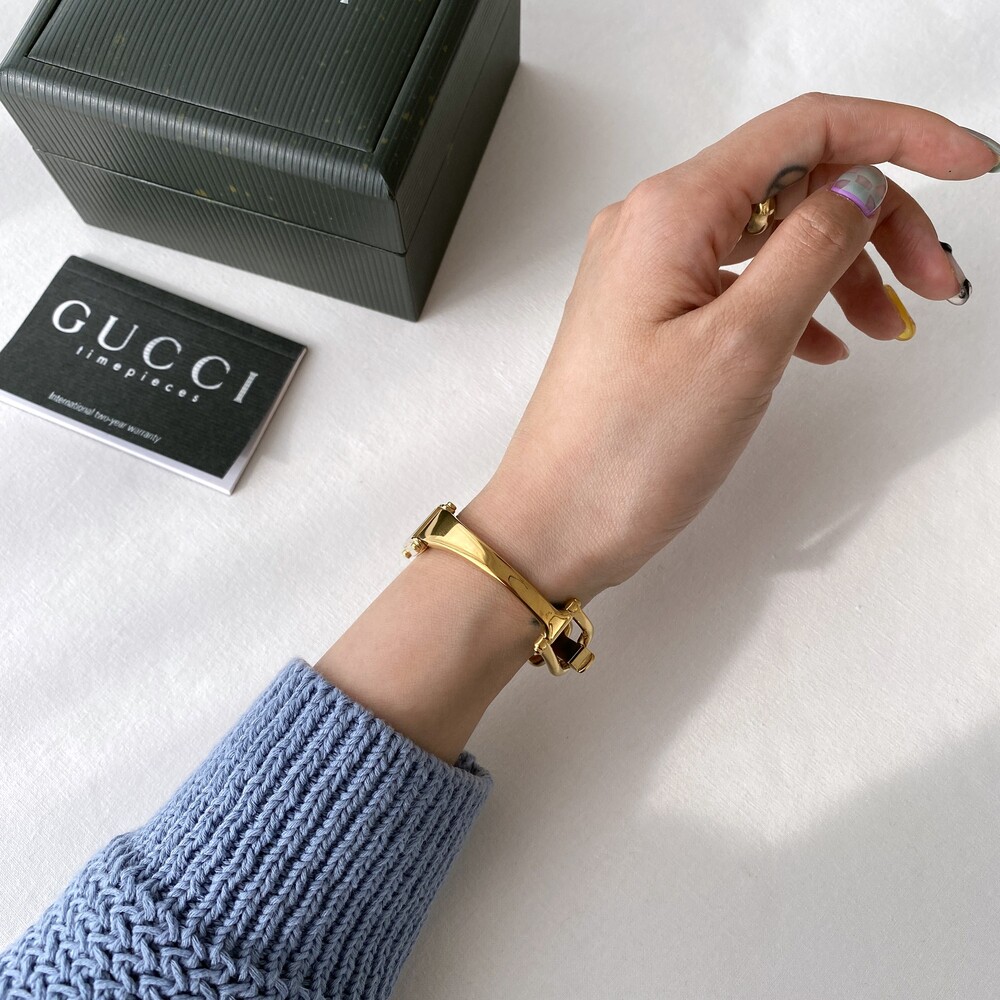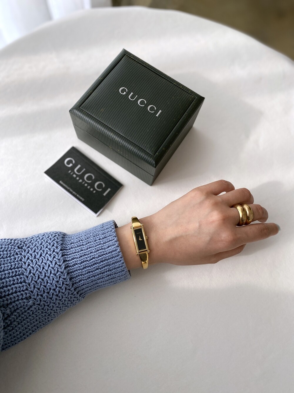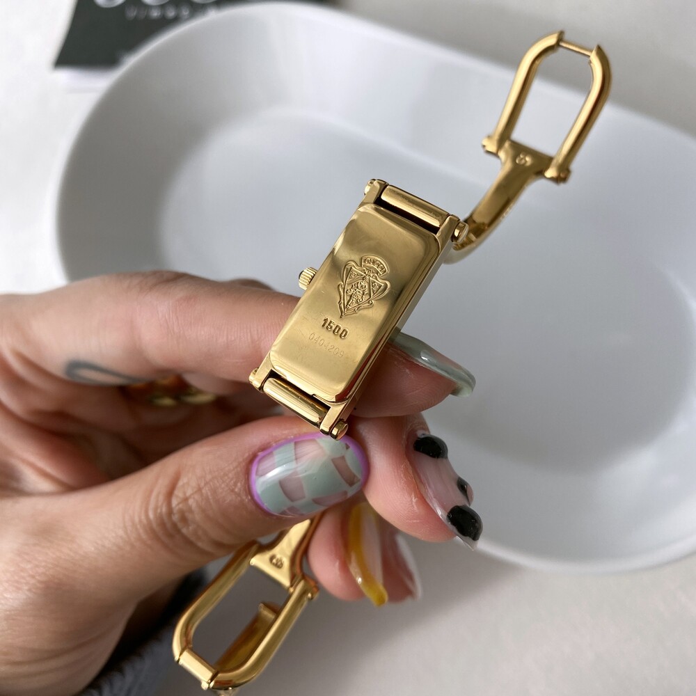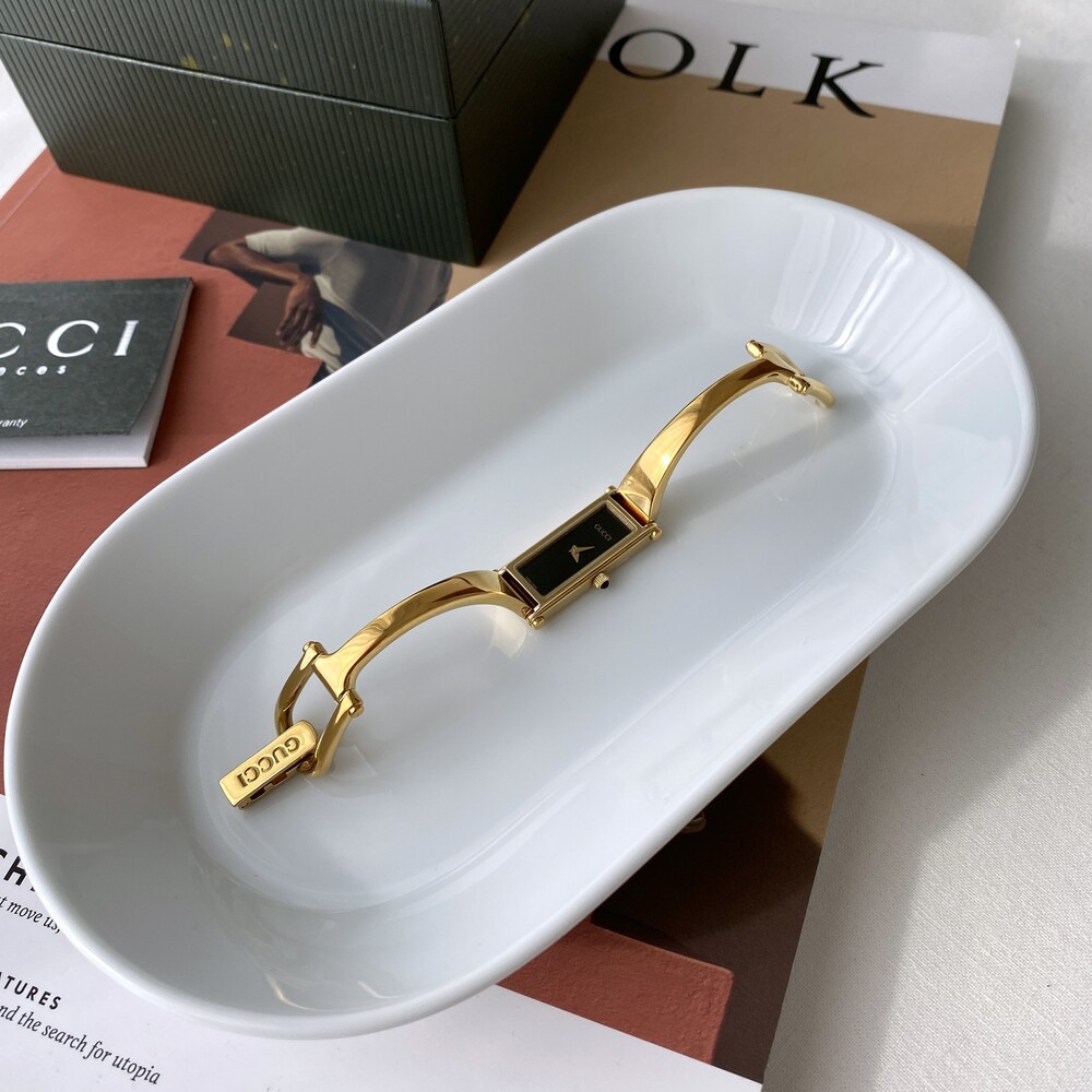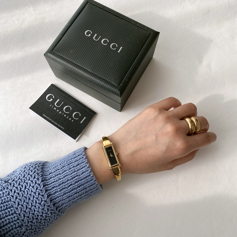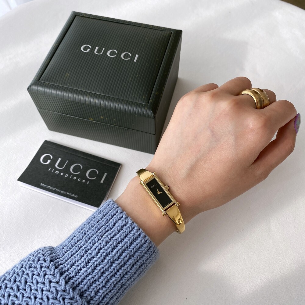 골드 톤 스퀘어 타입의 시계와 블랙 다이얼 위를 장식하는 구찌 로고,