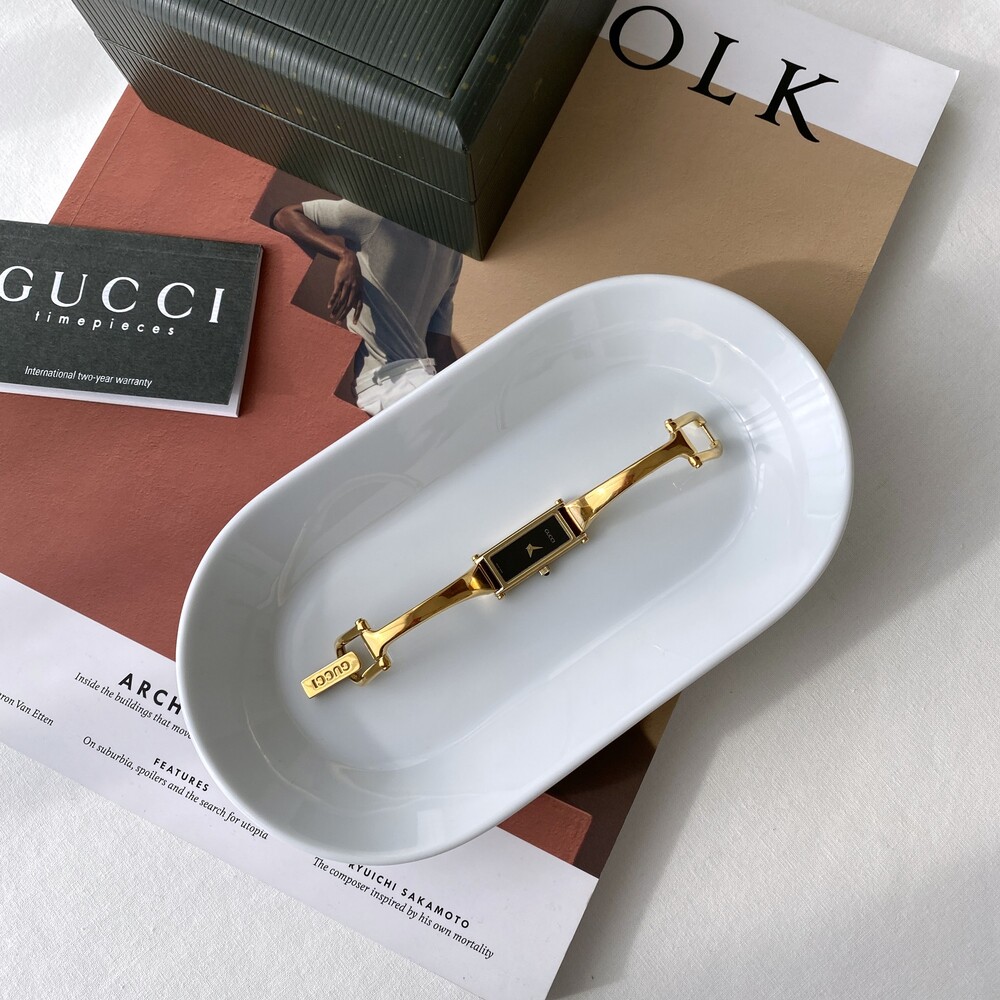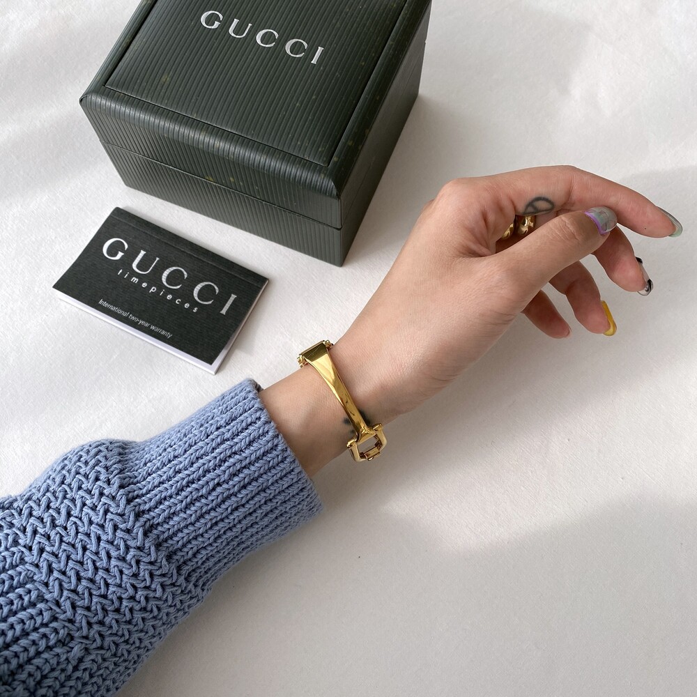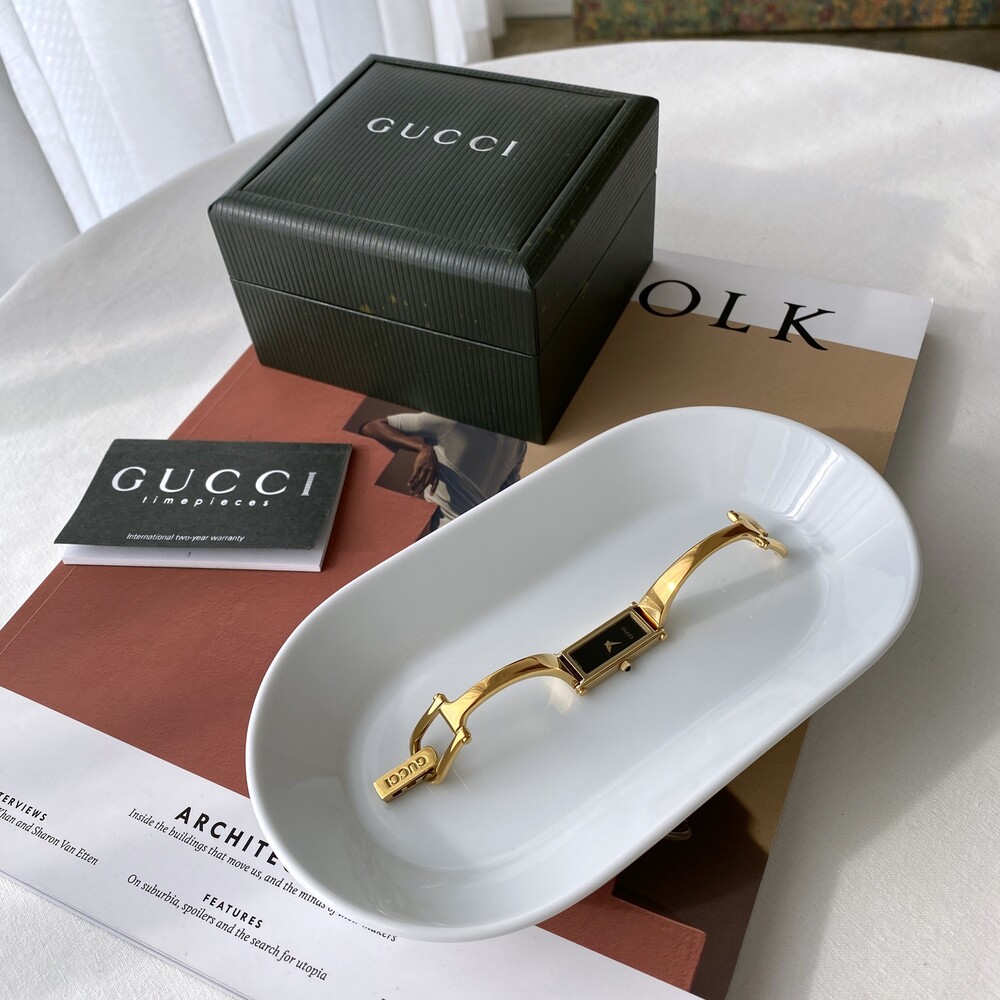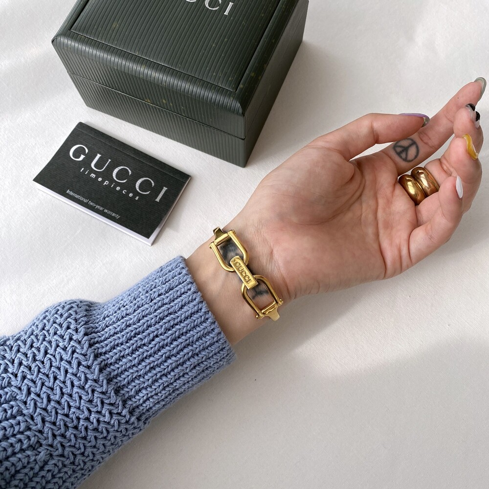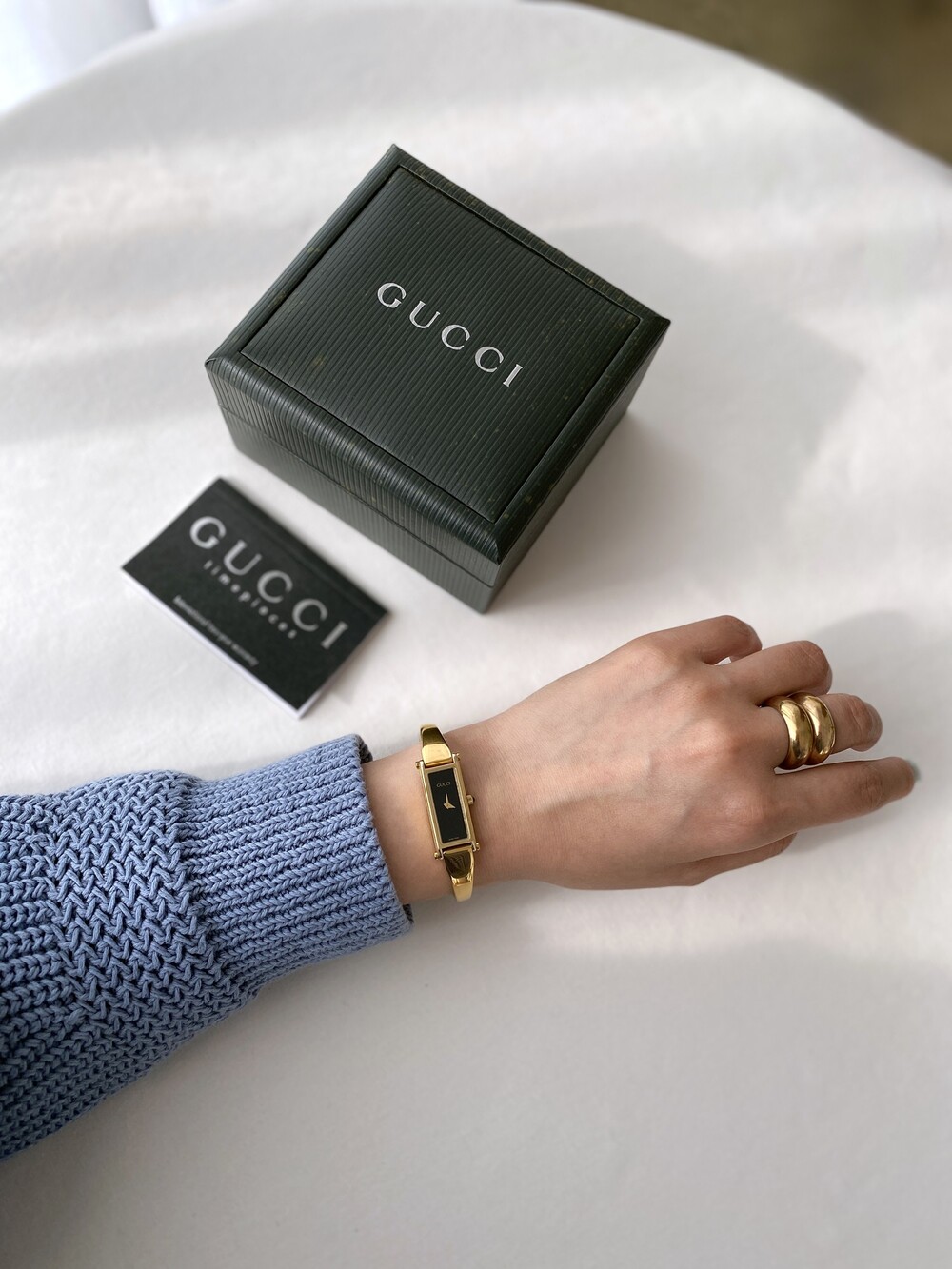 골드 톤 스퀘어 타입의 시계와 블랙 다이얼 위를 장식하는 구찌 로고,