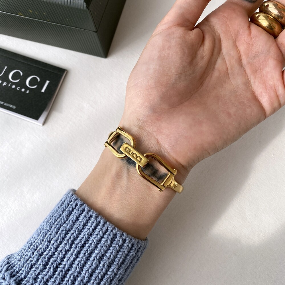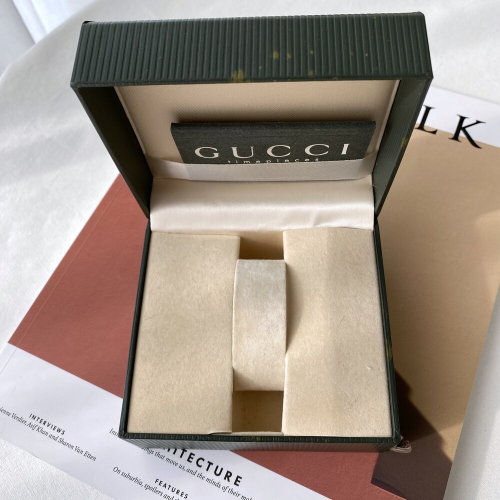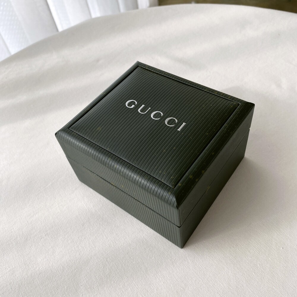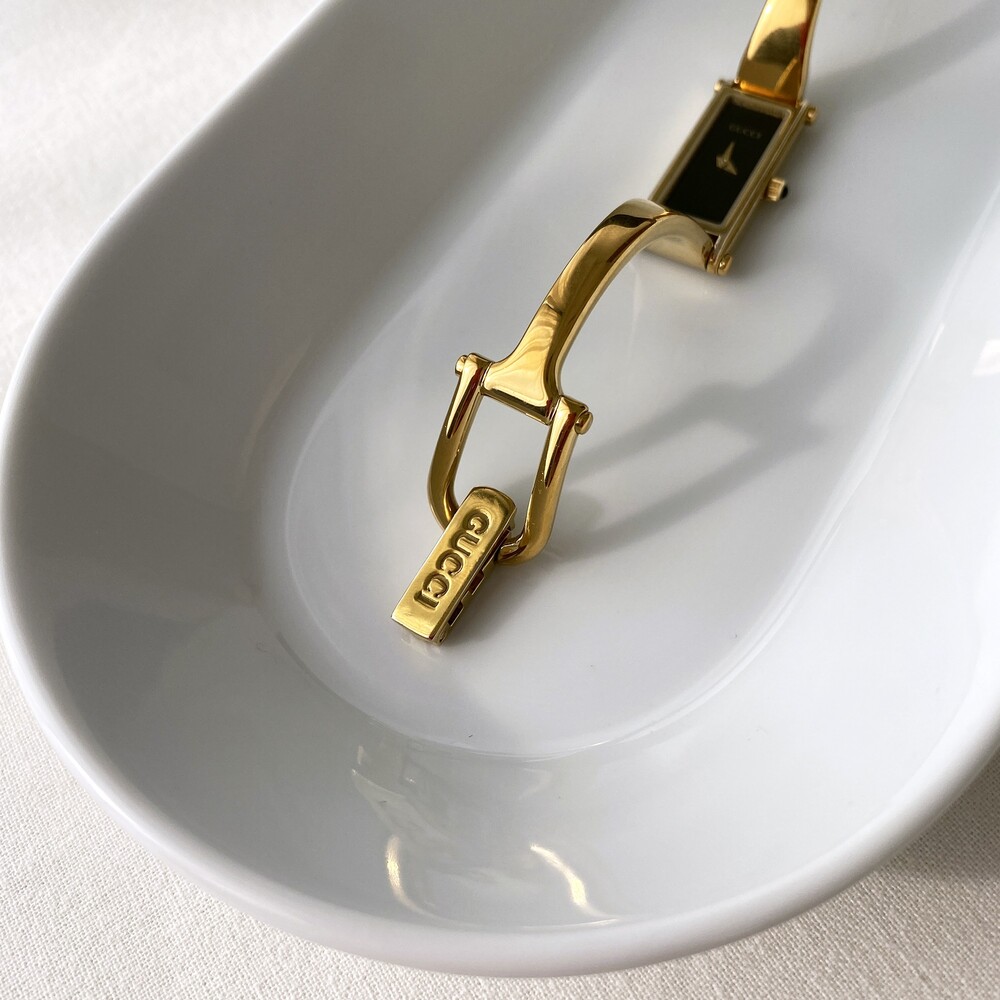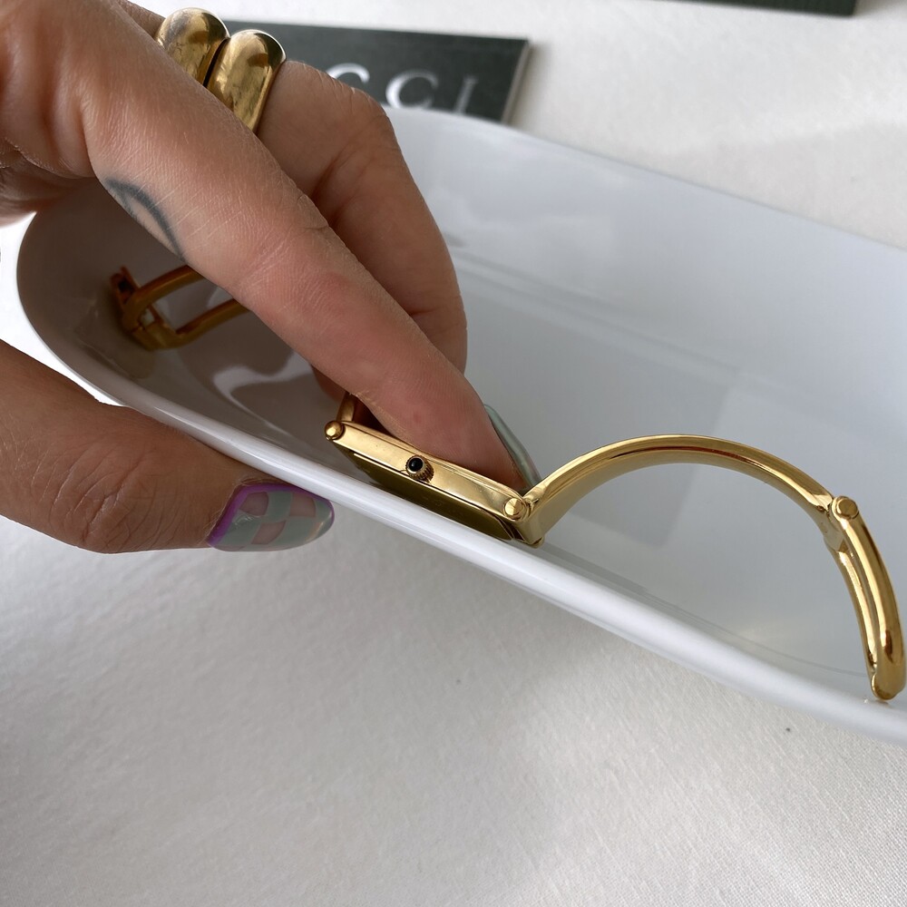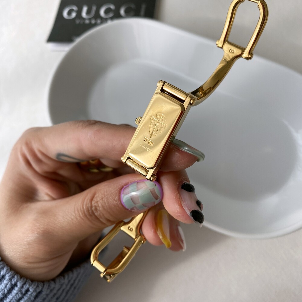골드 톤 스퀘어 타입의 시계와 블랙 다이얼 위를 장식하는 구찌 로고,