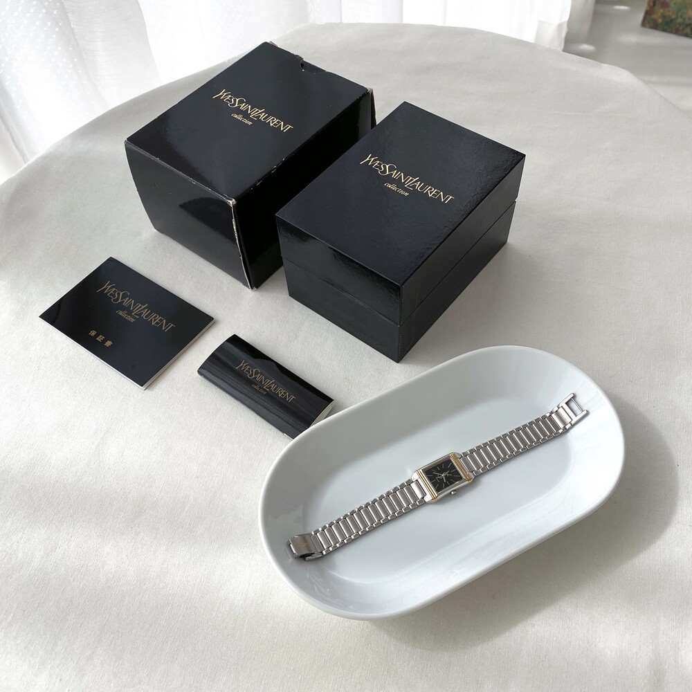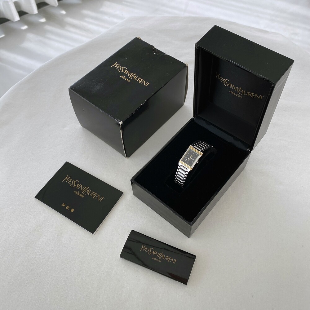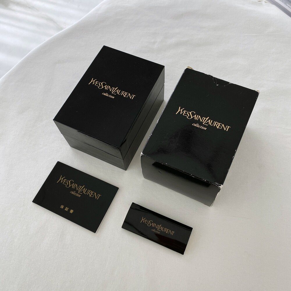 입생로랑 시계 박스, 케이스, 사용설명서, 개런티 카드가 포함된 제품입니다.