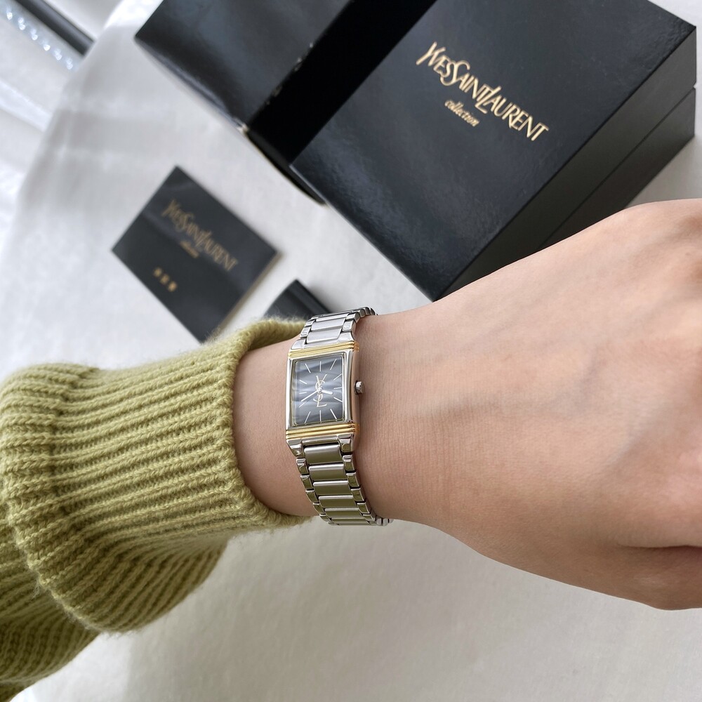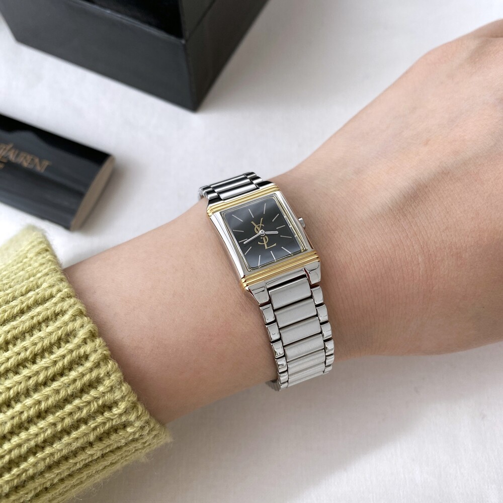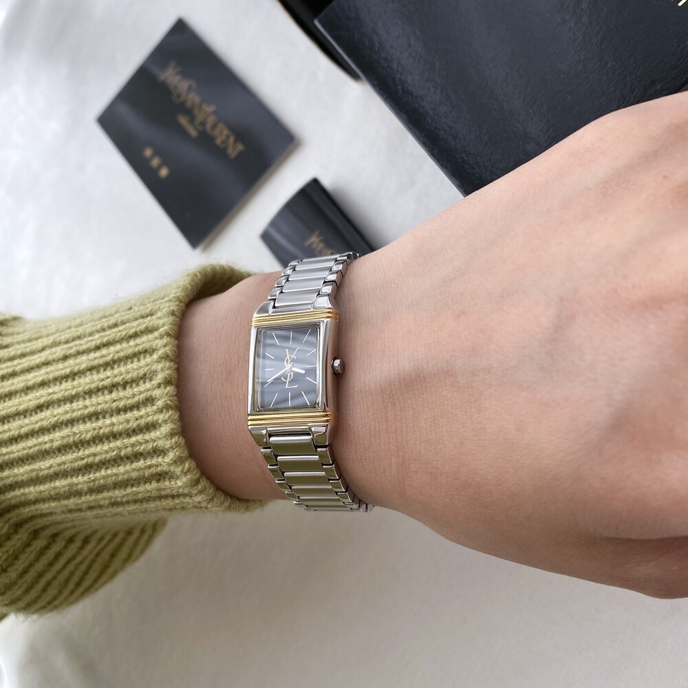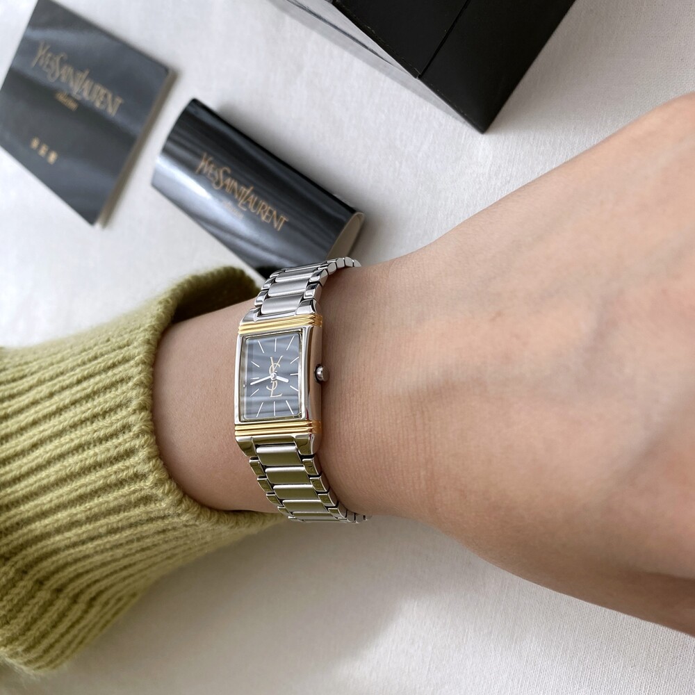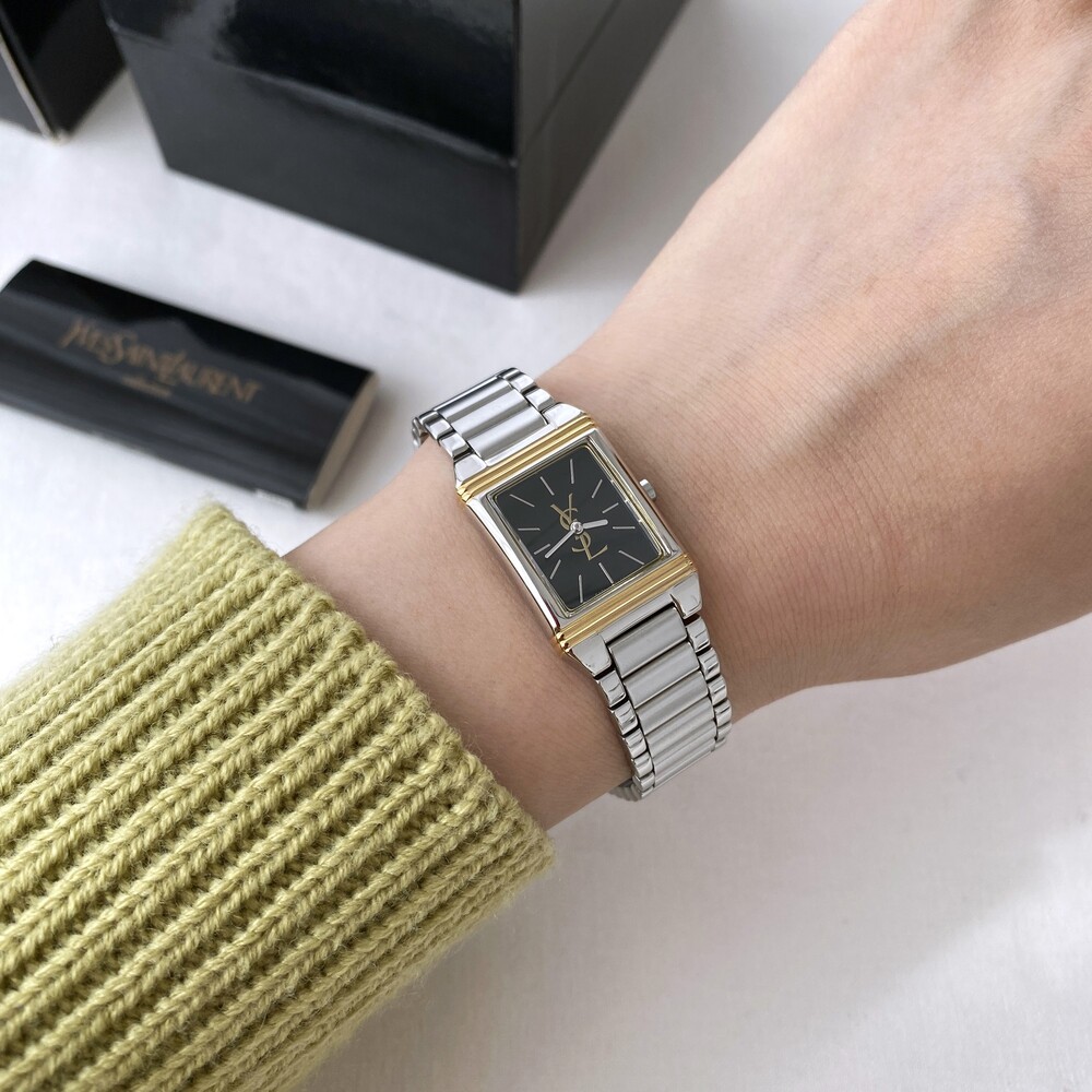 스퀘어 타입의 투톤 케이스와 다이얼 위를 장식하는 생로랑 로고가