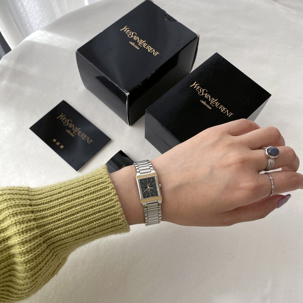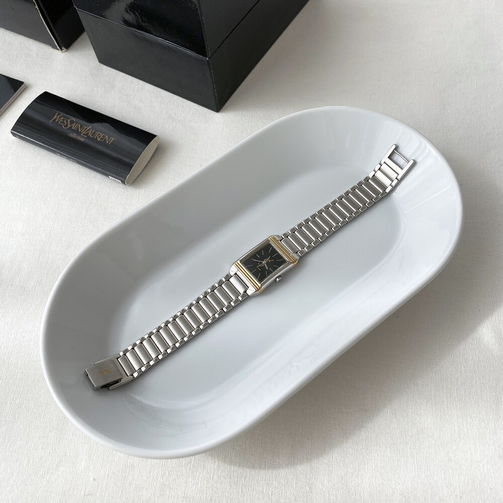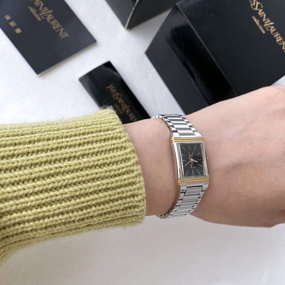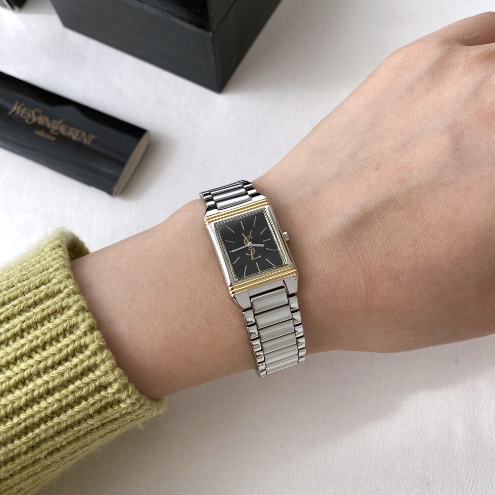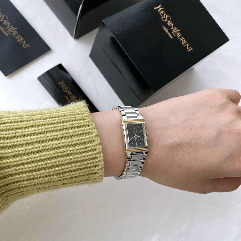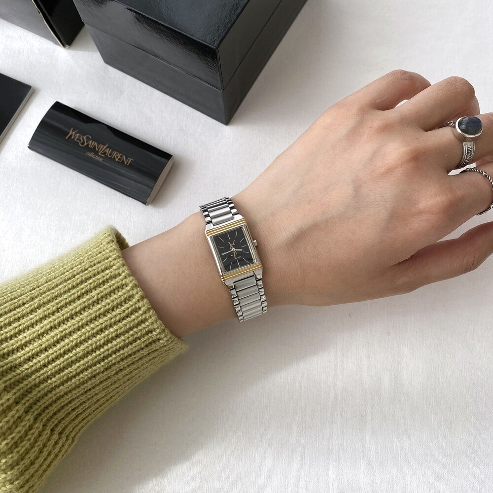 스퀘어 타입의 투톤 케이스와 다이얼 위를 장식하는 생로랑 로고가