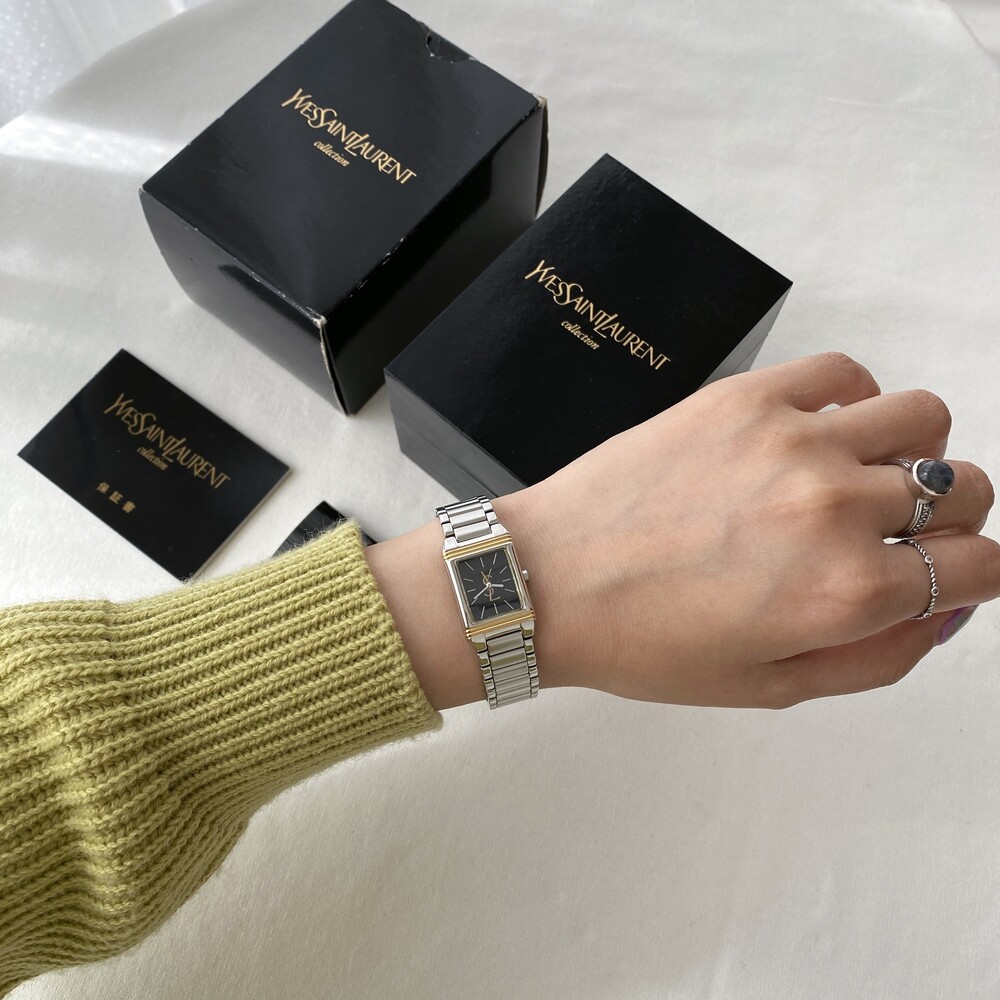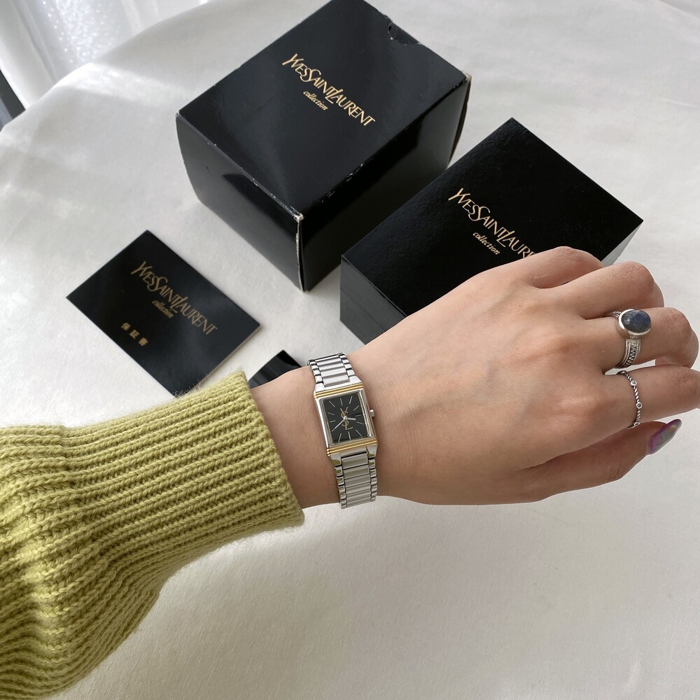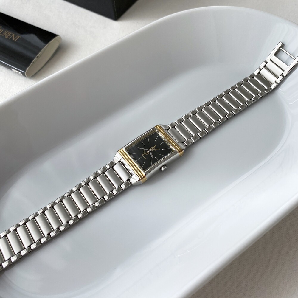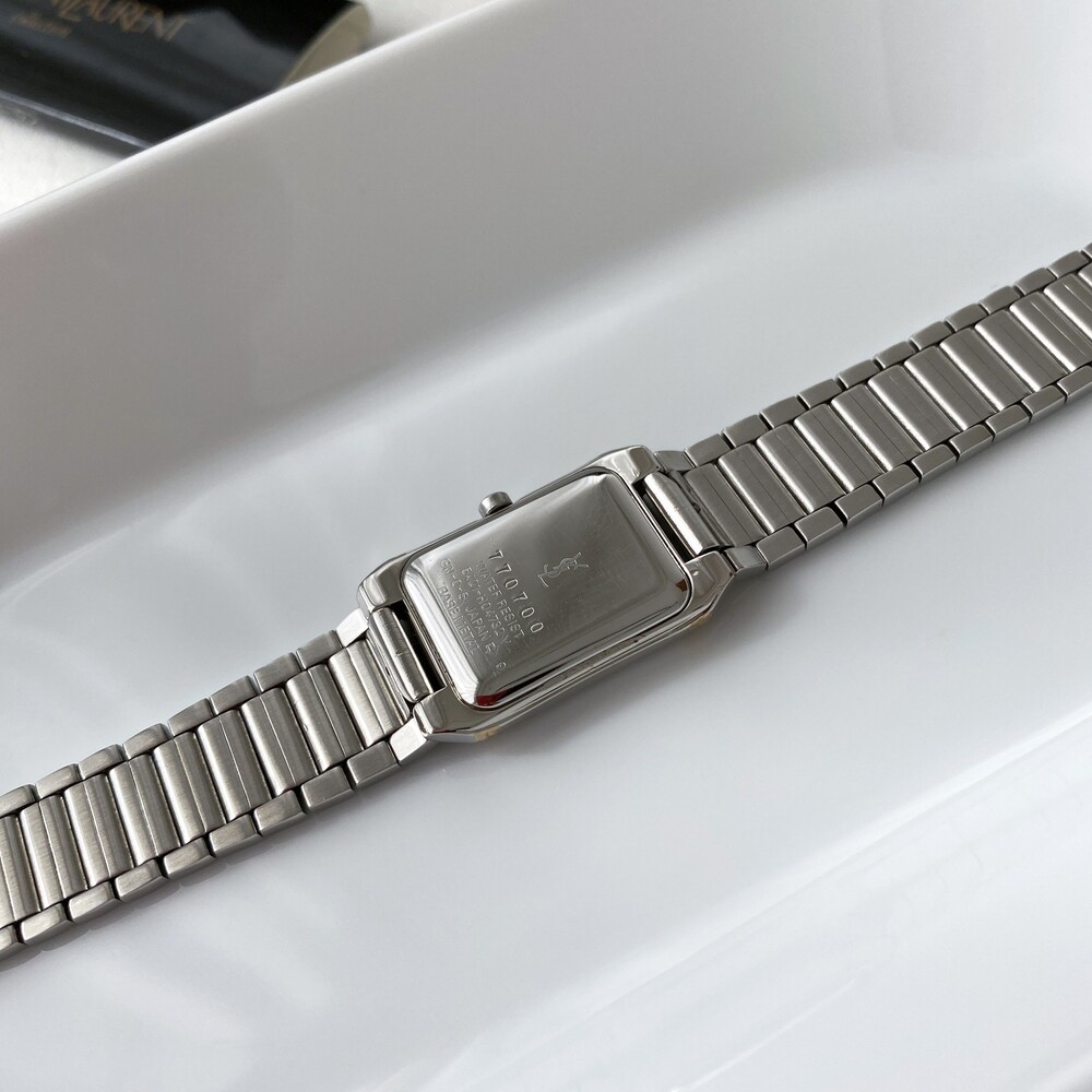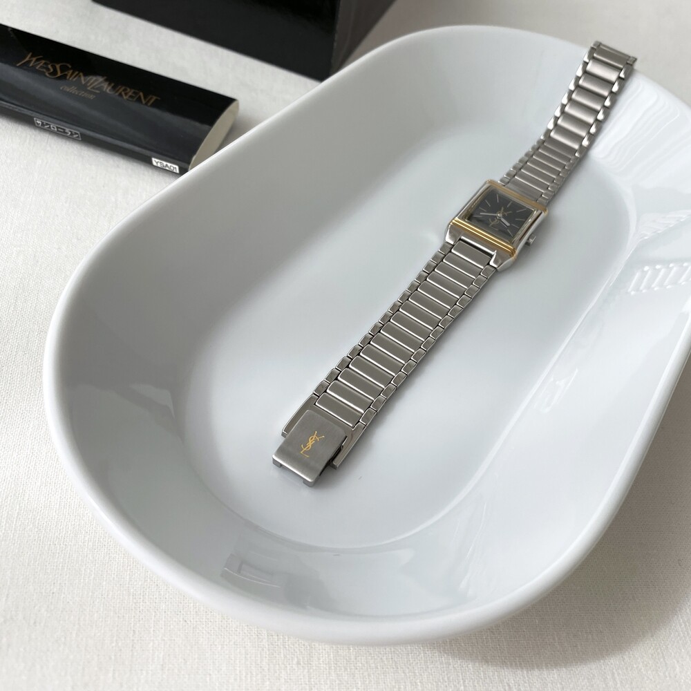 스퀘어 타입의 투톤 케이스와 다이얼 위를 장식하는 생로랑 로고가