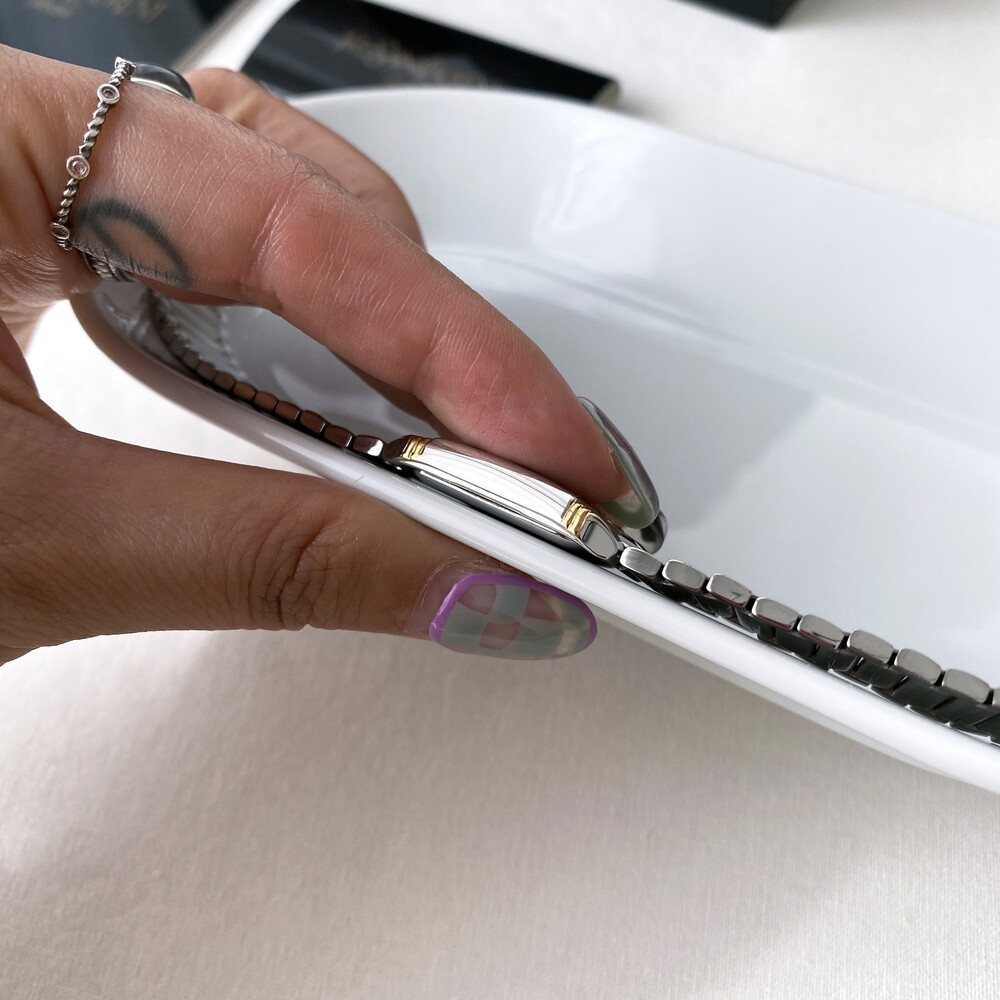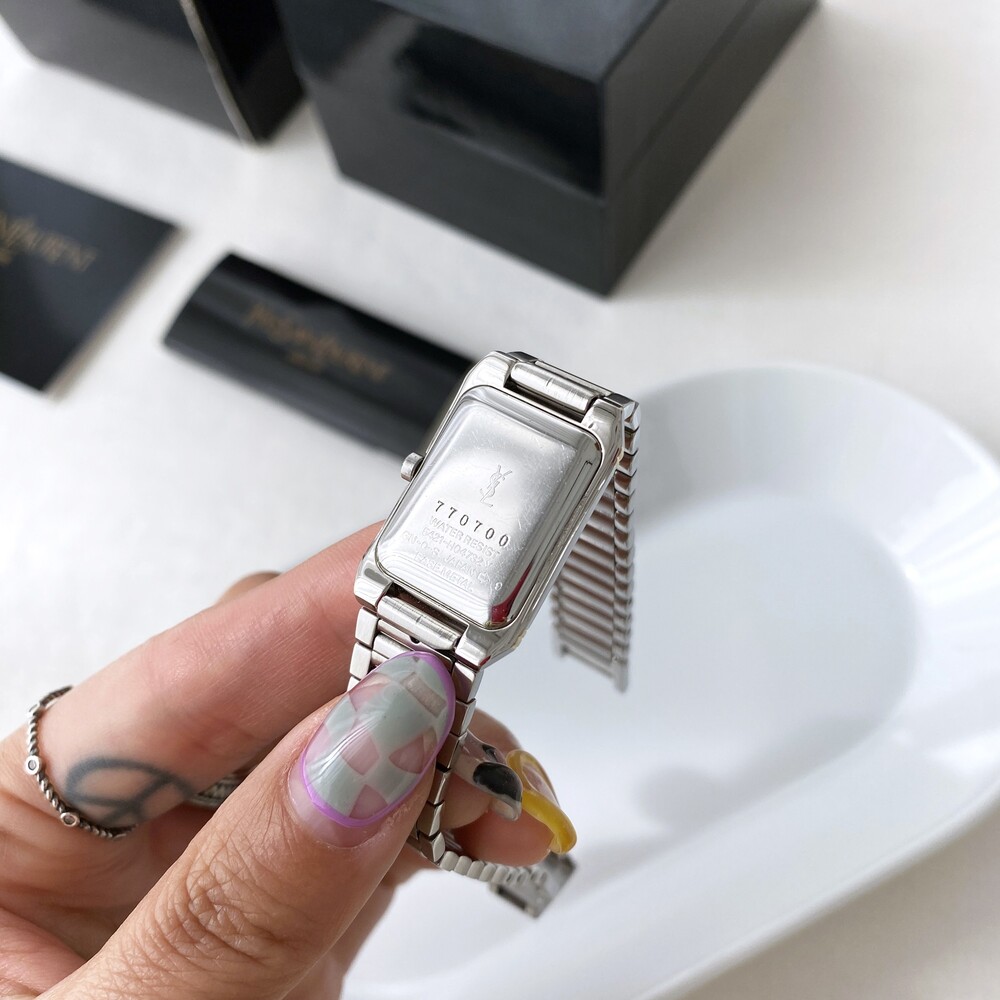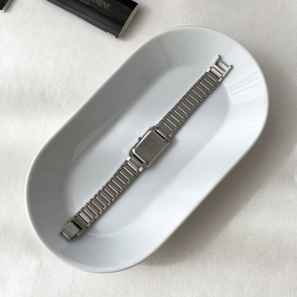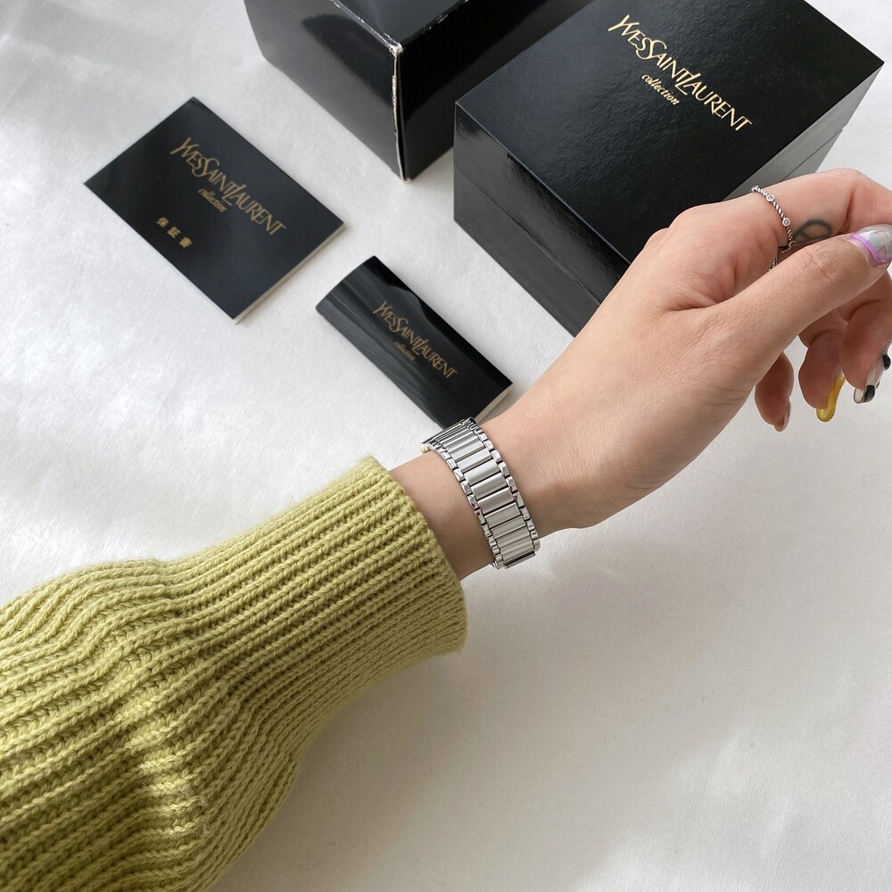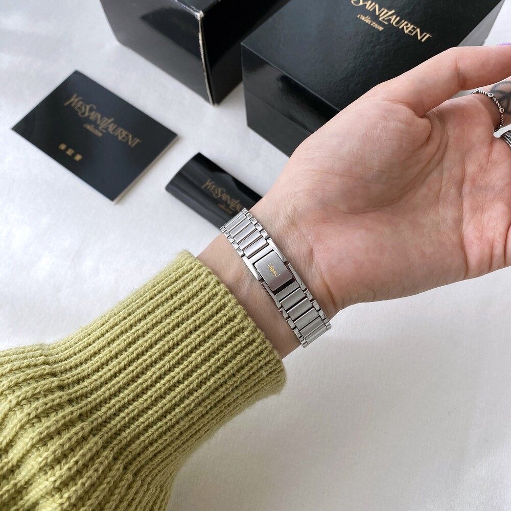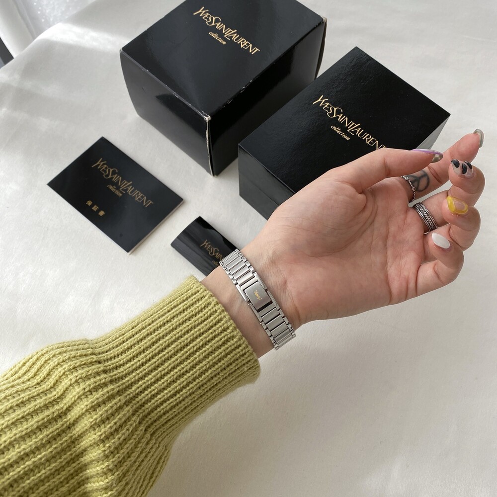 스퀘어 타입의 투톤 케이스와 다이얼 위를 장식하는 생로랑 로고가