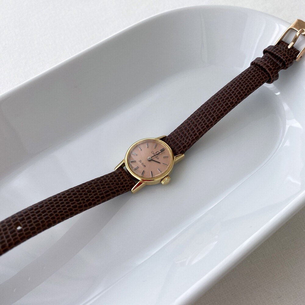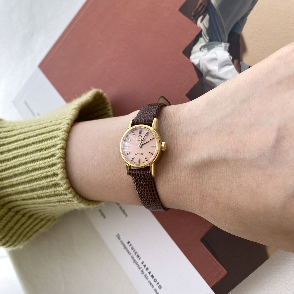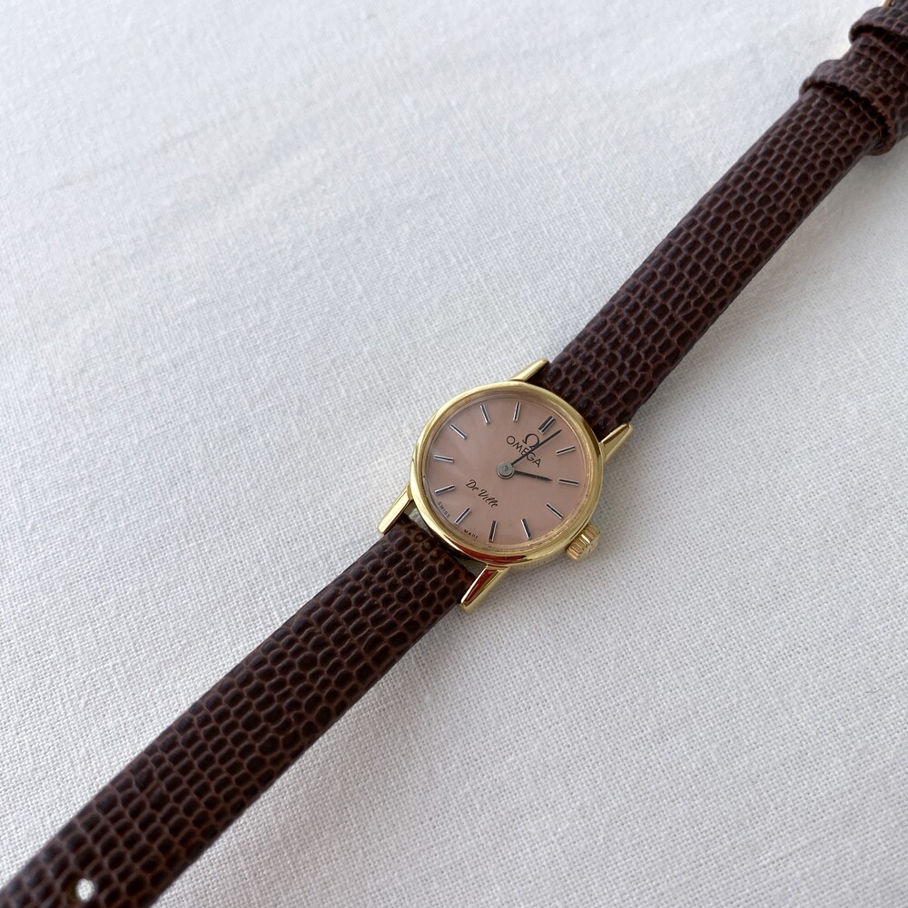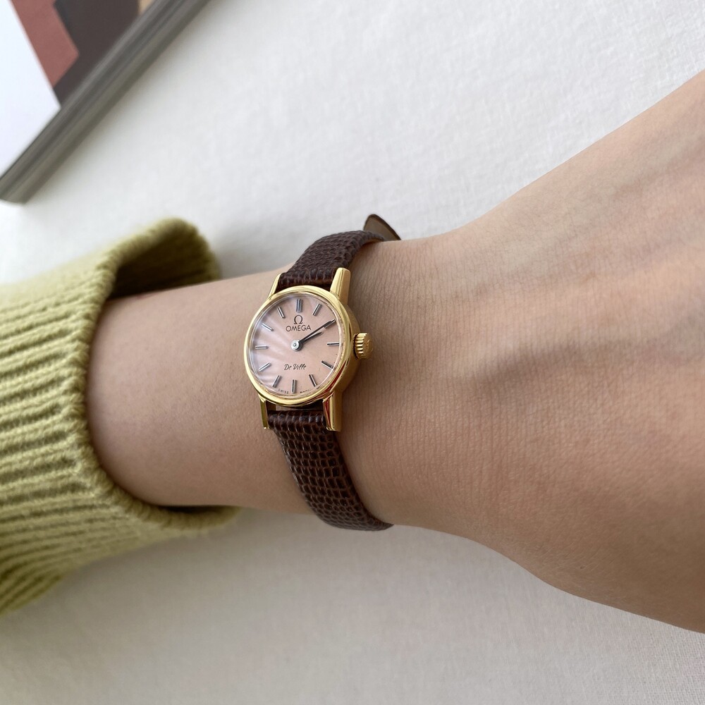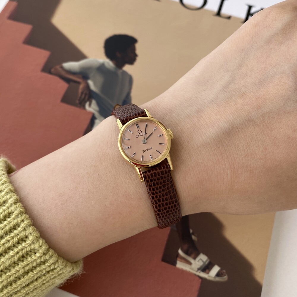 골드 톤 케이스와 핑크톤 다이얼을 장식하는 오메가 로고가 아름다운 모델이며