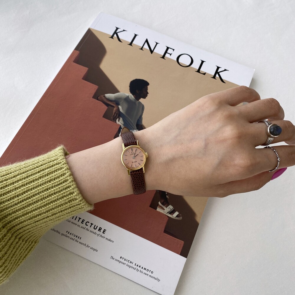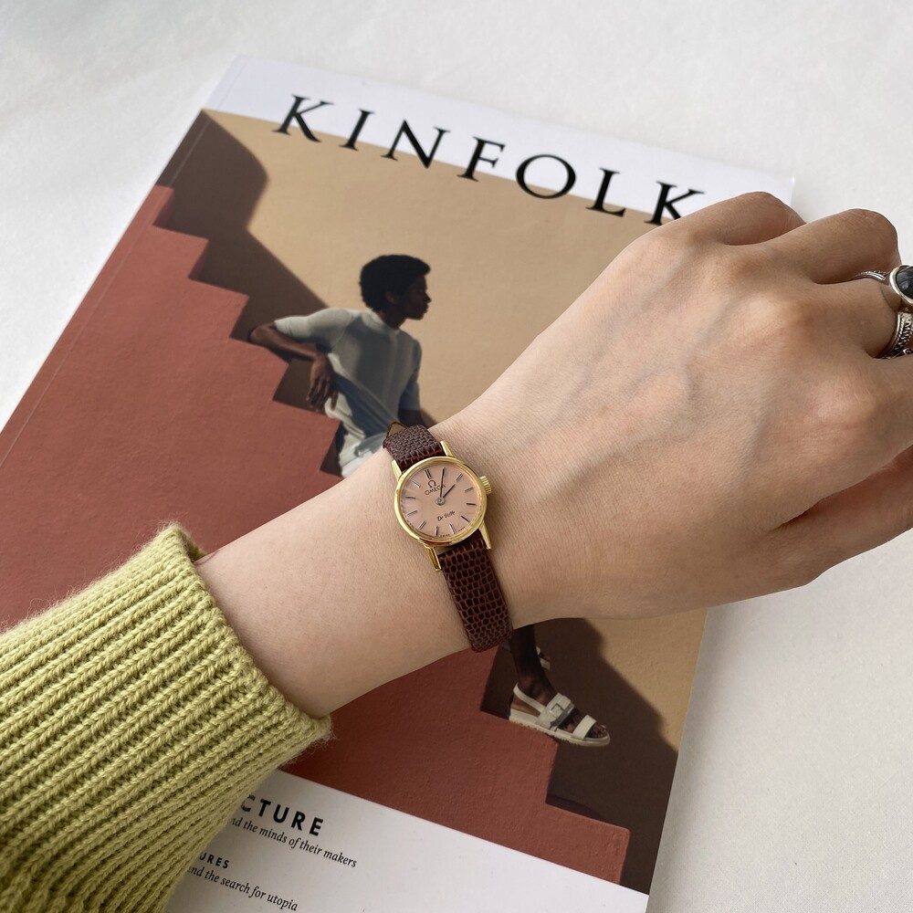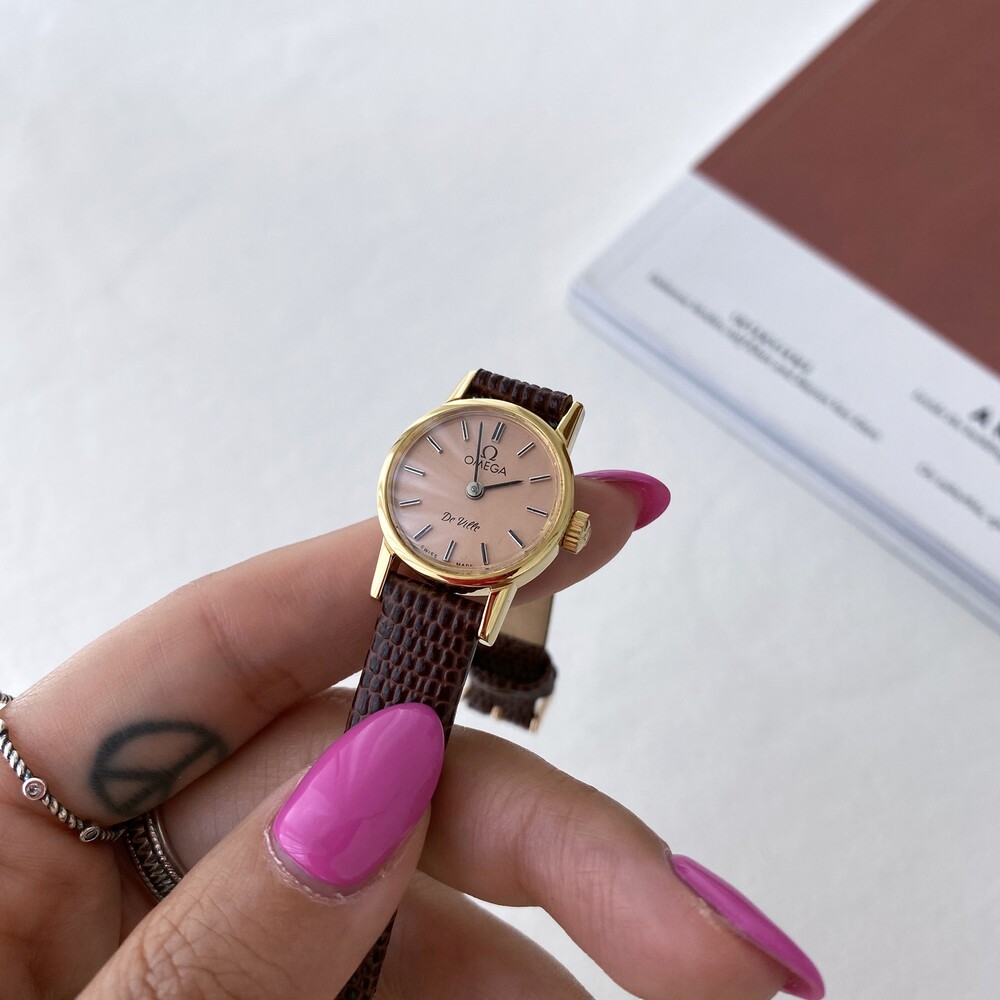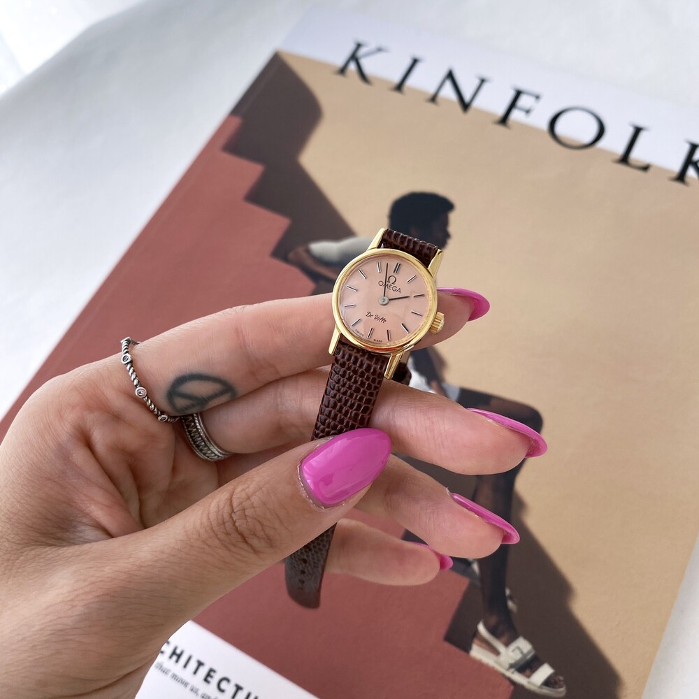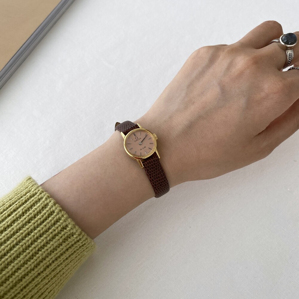 골드 톤 케이스와 핑크톤 다이얼을 장식하는 오메가 로고가 아름다운 모델이며