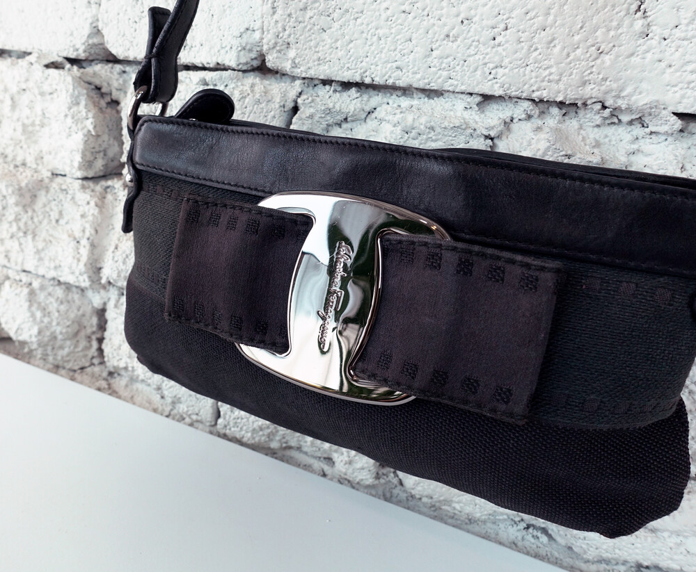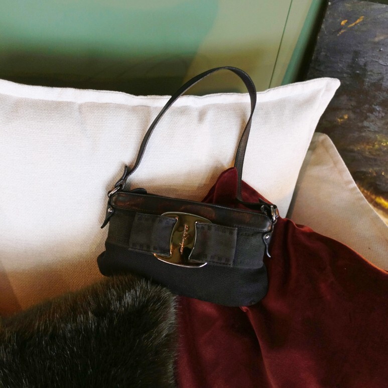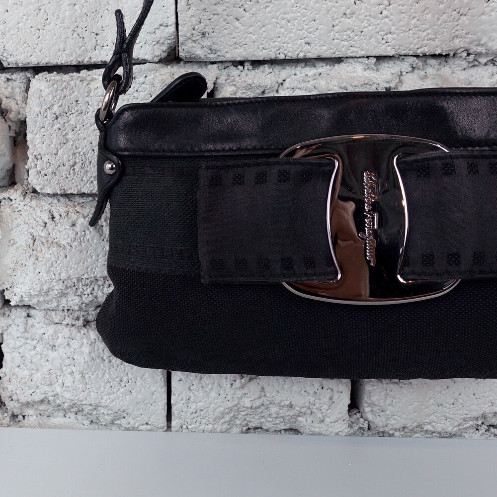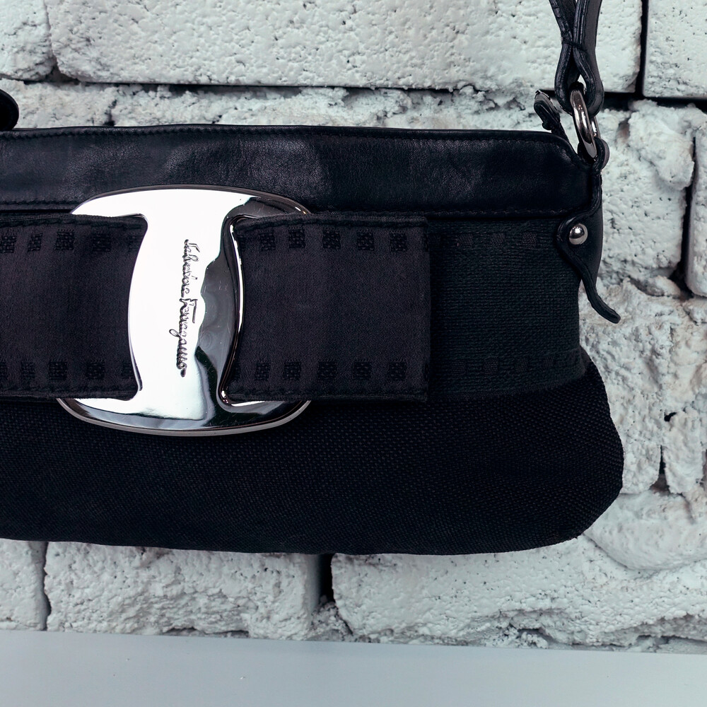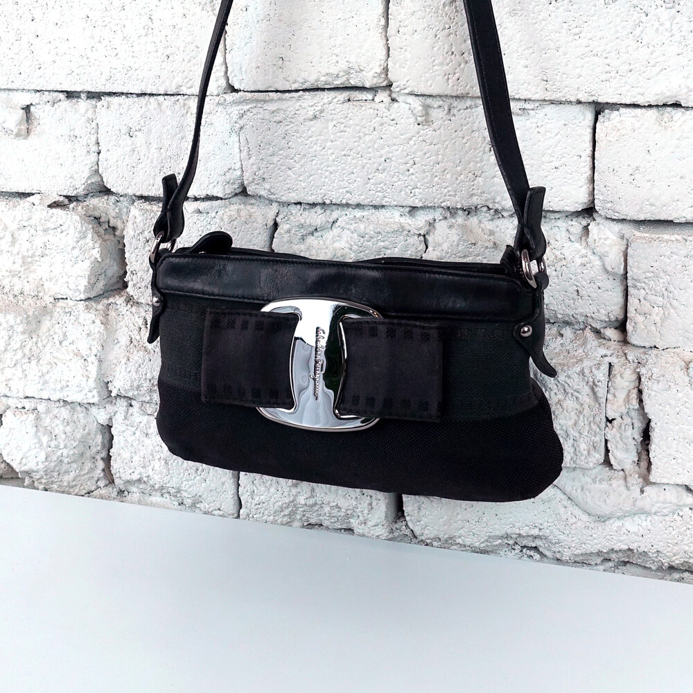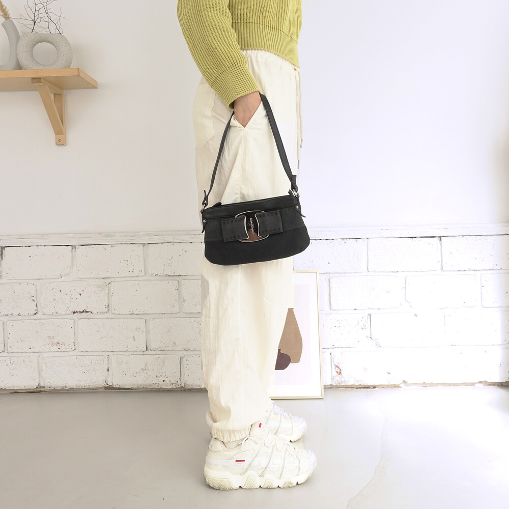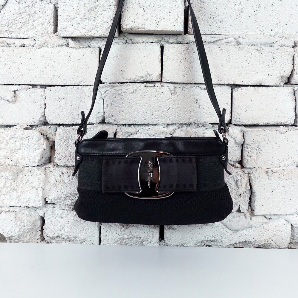 페라가모 리본 메인 장식과 부드러운 3가지 톤의 블랙 캔버스 바디가 매력적인 모델입니다.