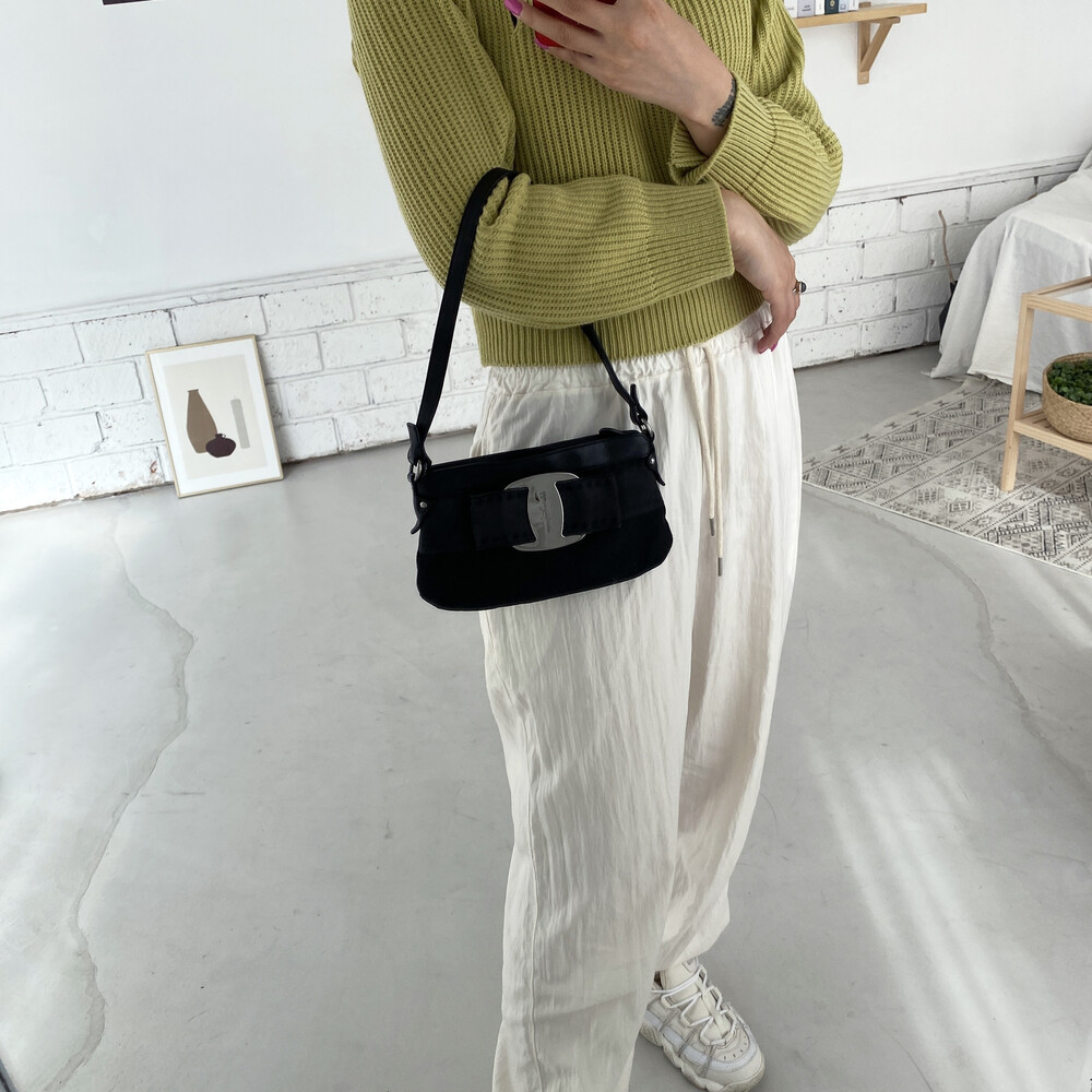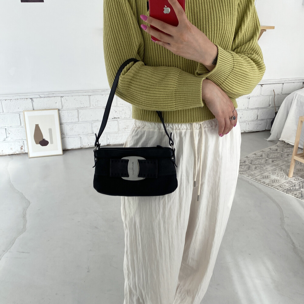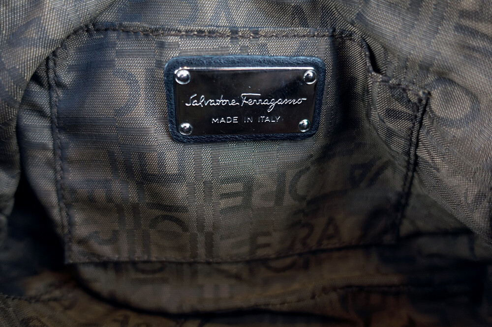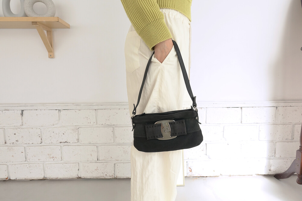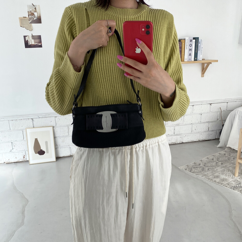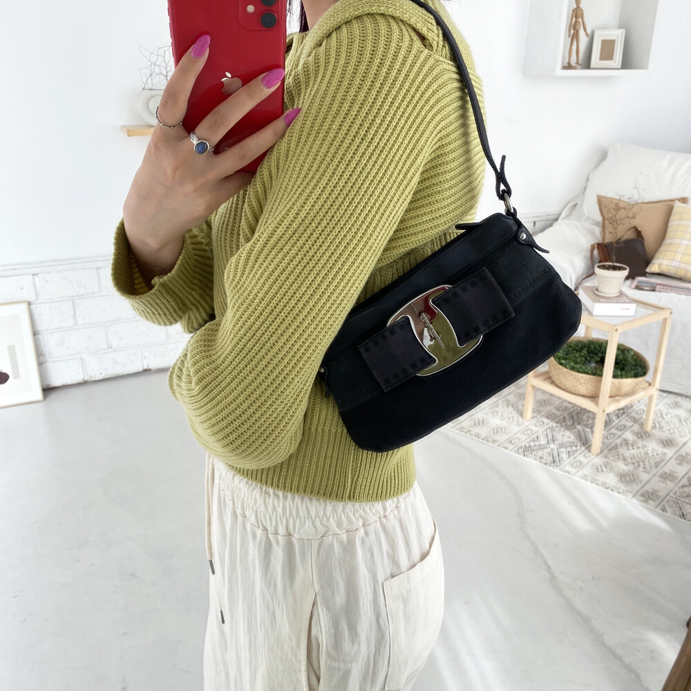 페라가모 리본 메인 장식과 부드러운 3가지 톤의 블랙 캔버스 바디가 매력적인 모델입니다.