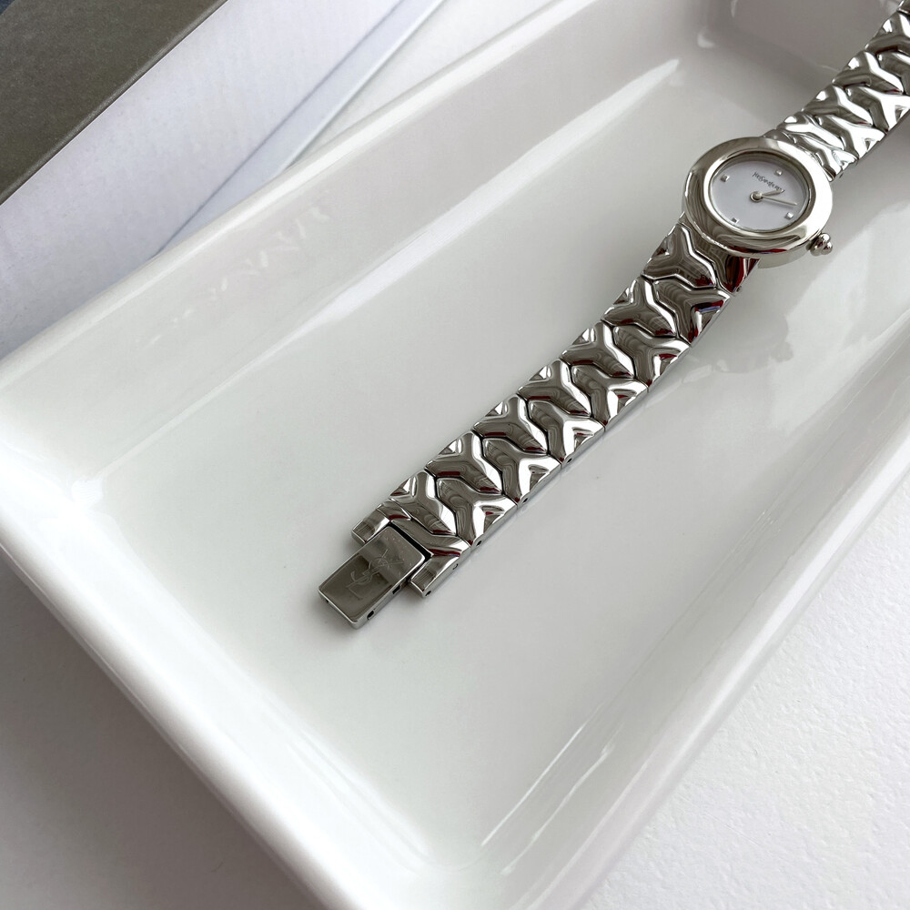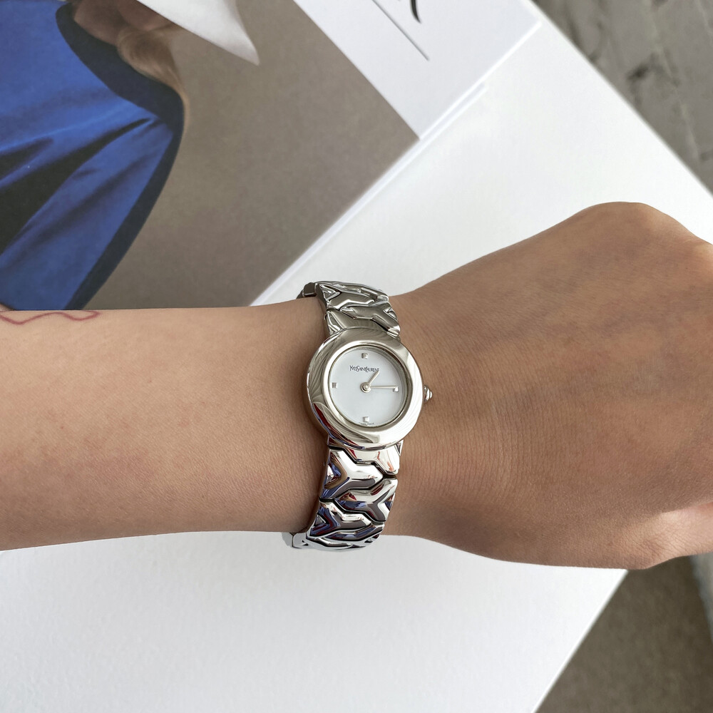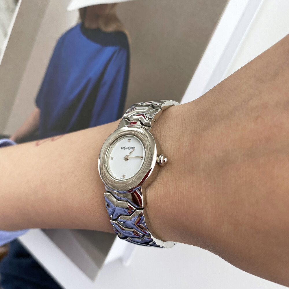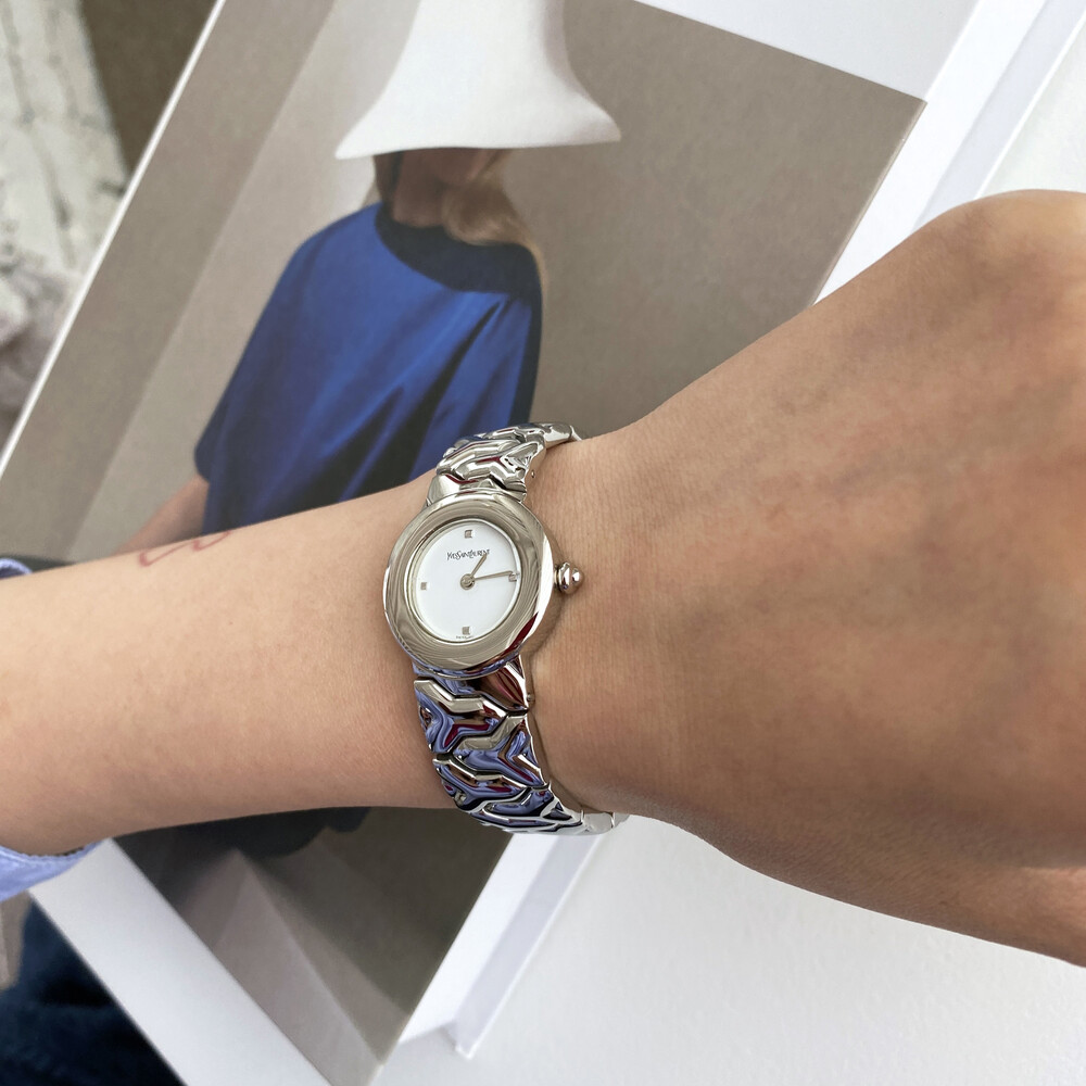 실버톤 케이스와 화이트 다이얼 위를 장식하는 생로랑 로고,