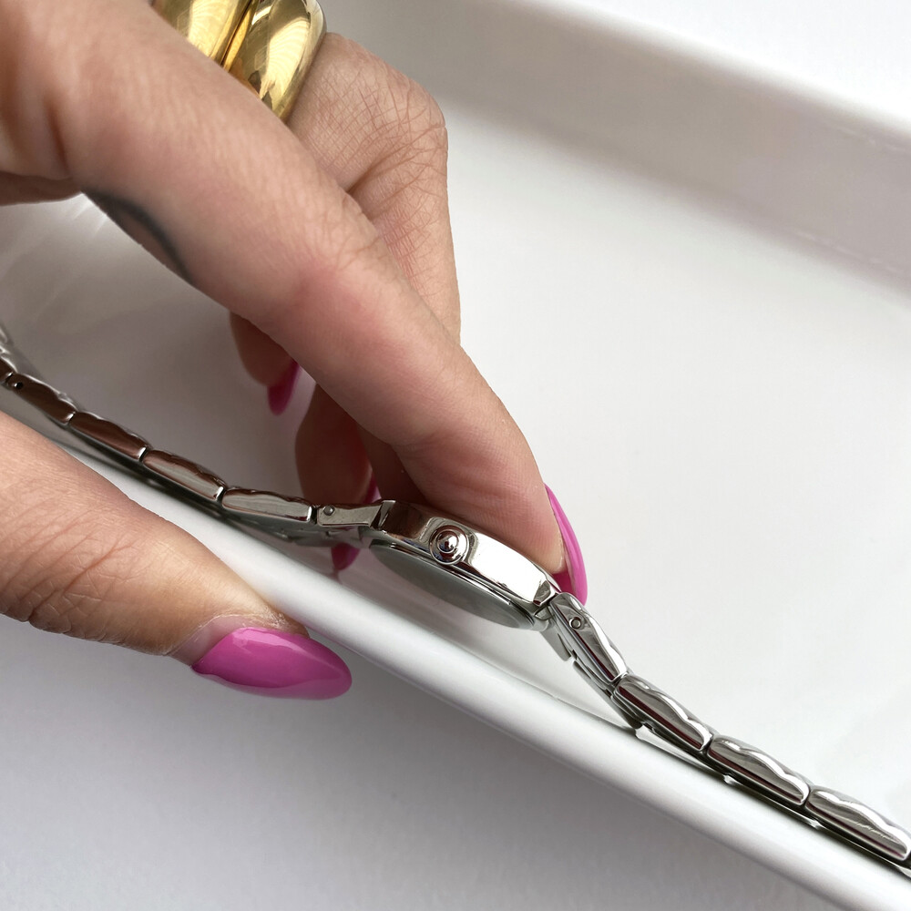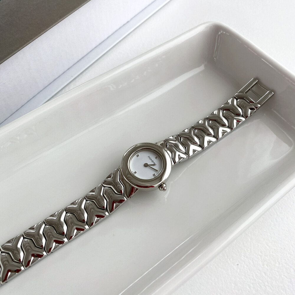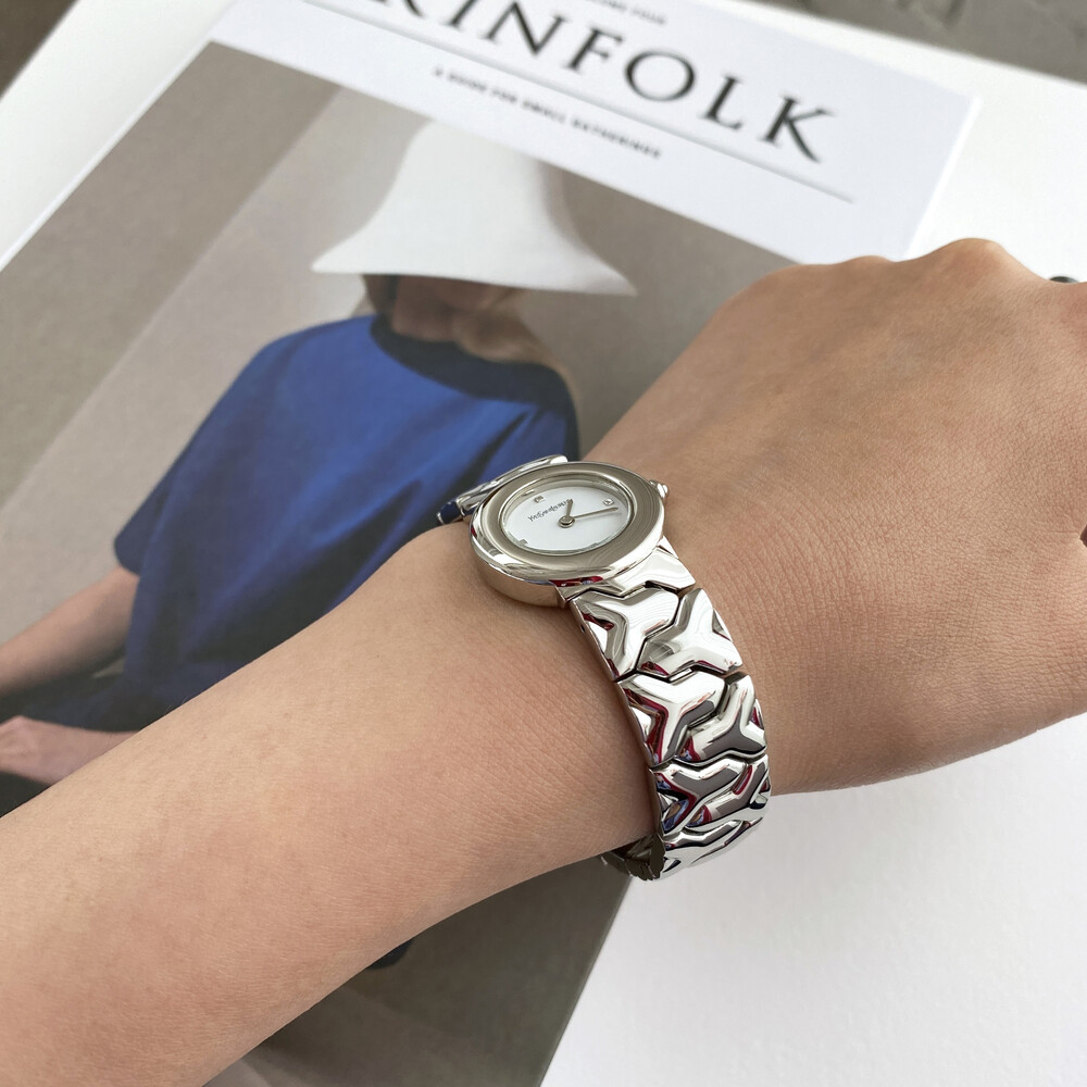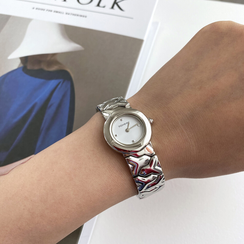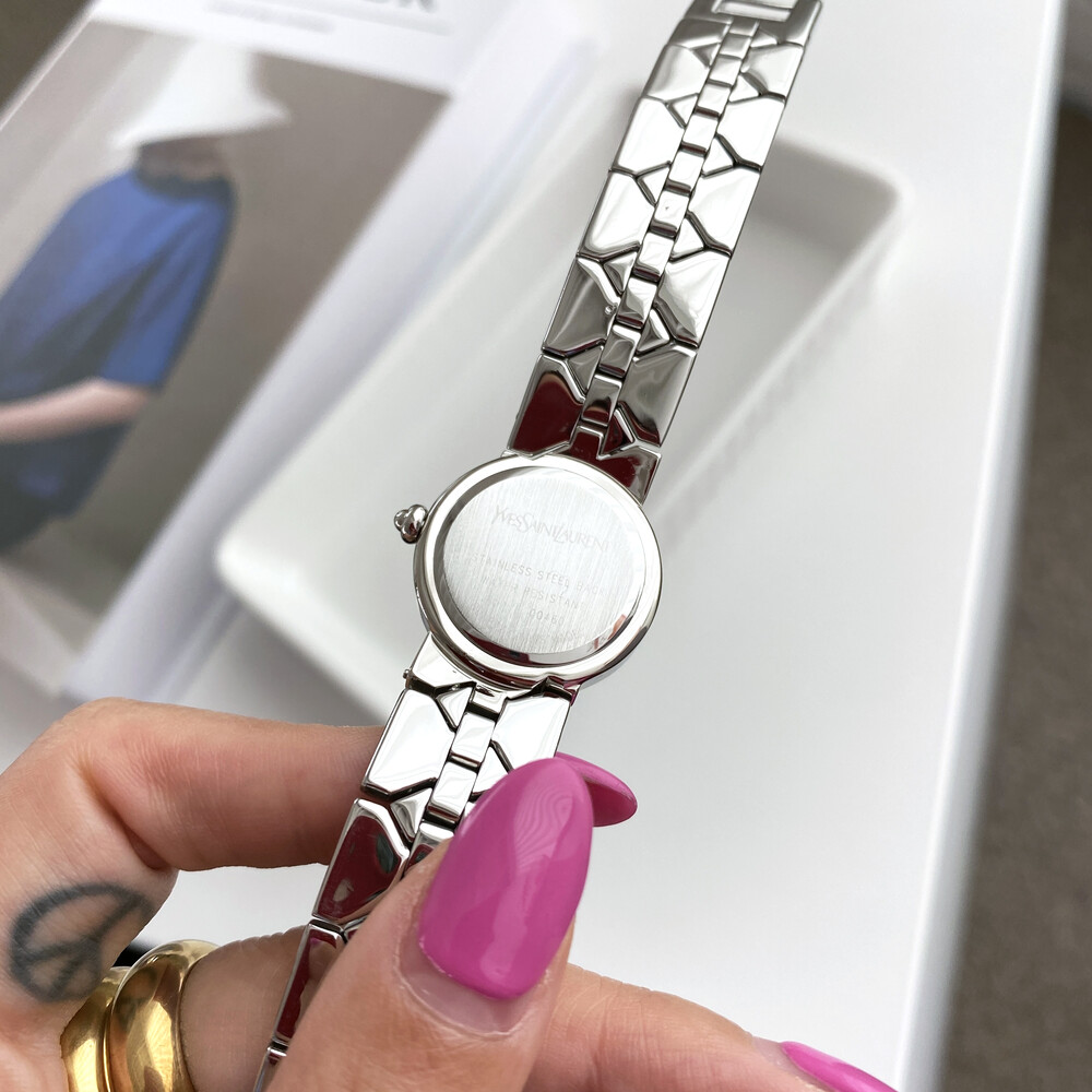실버톤 케이스와 화이트 다이얼 위를 장식하는 생로랑 로고,