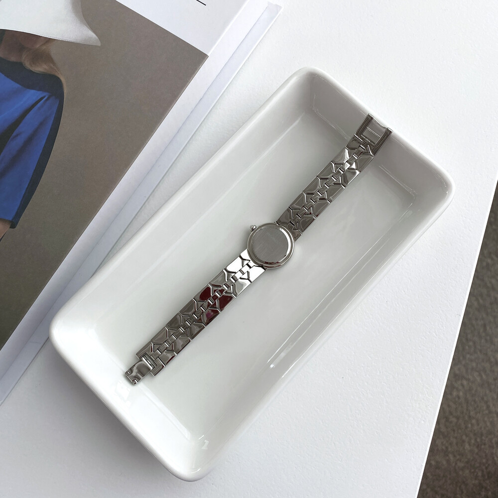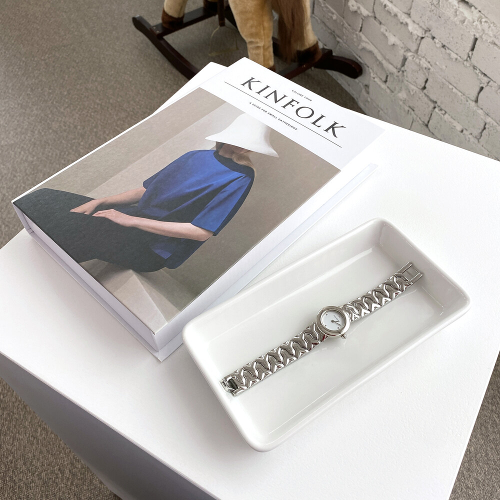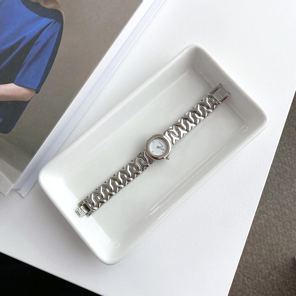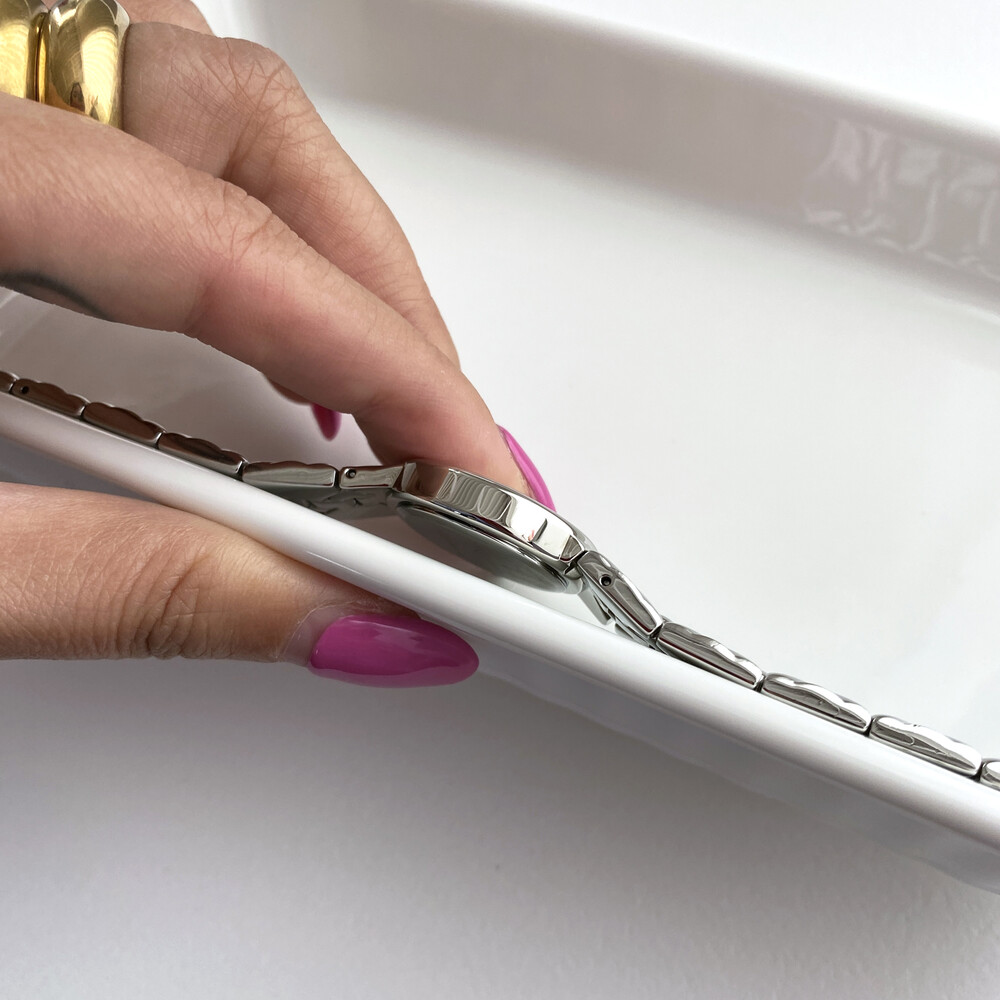 실버톤 케이스와 화이트 다이얼 위를 장식하는 생로랑 로고,