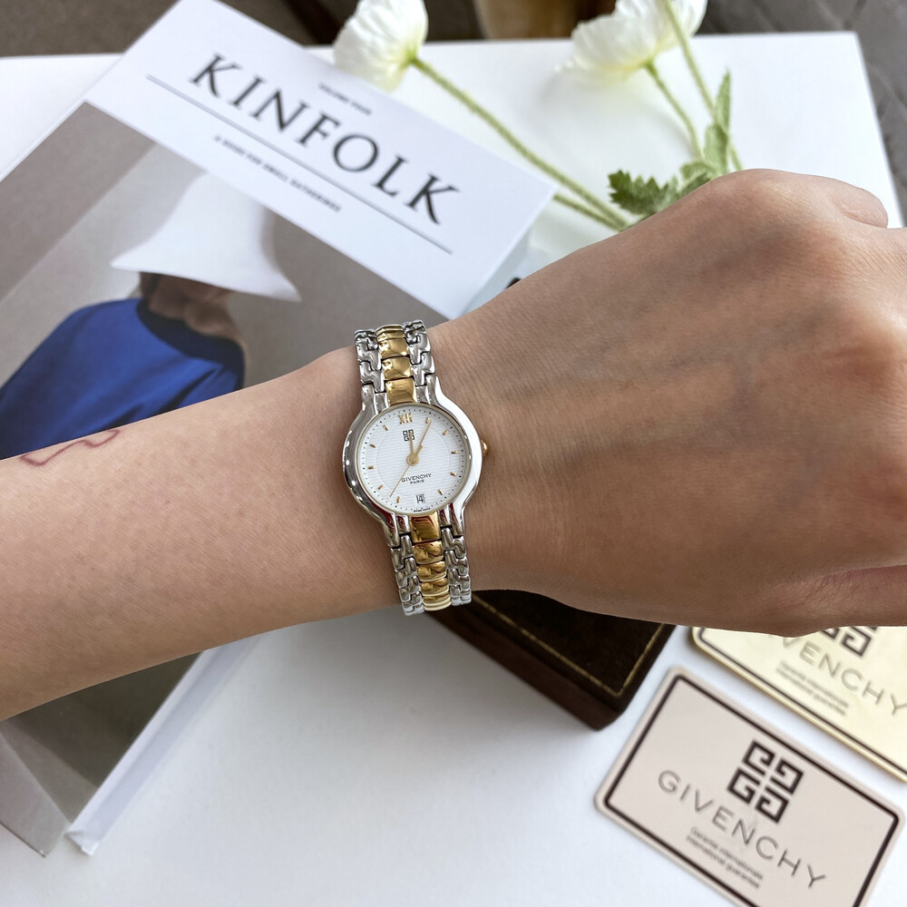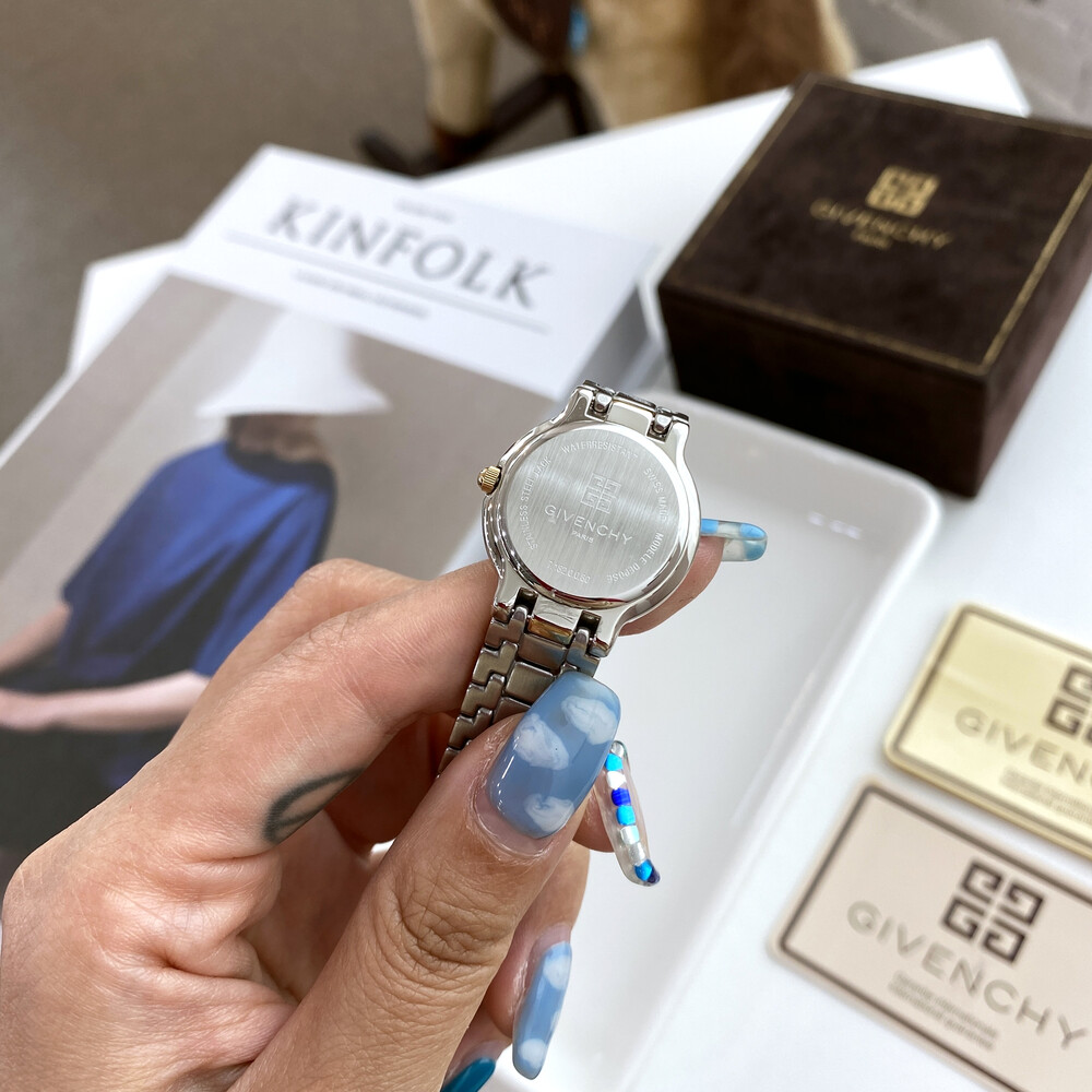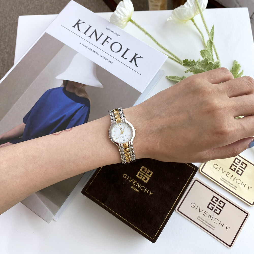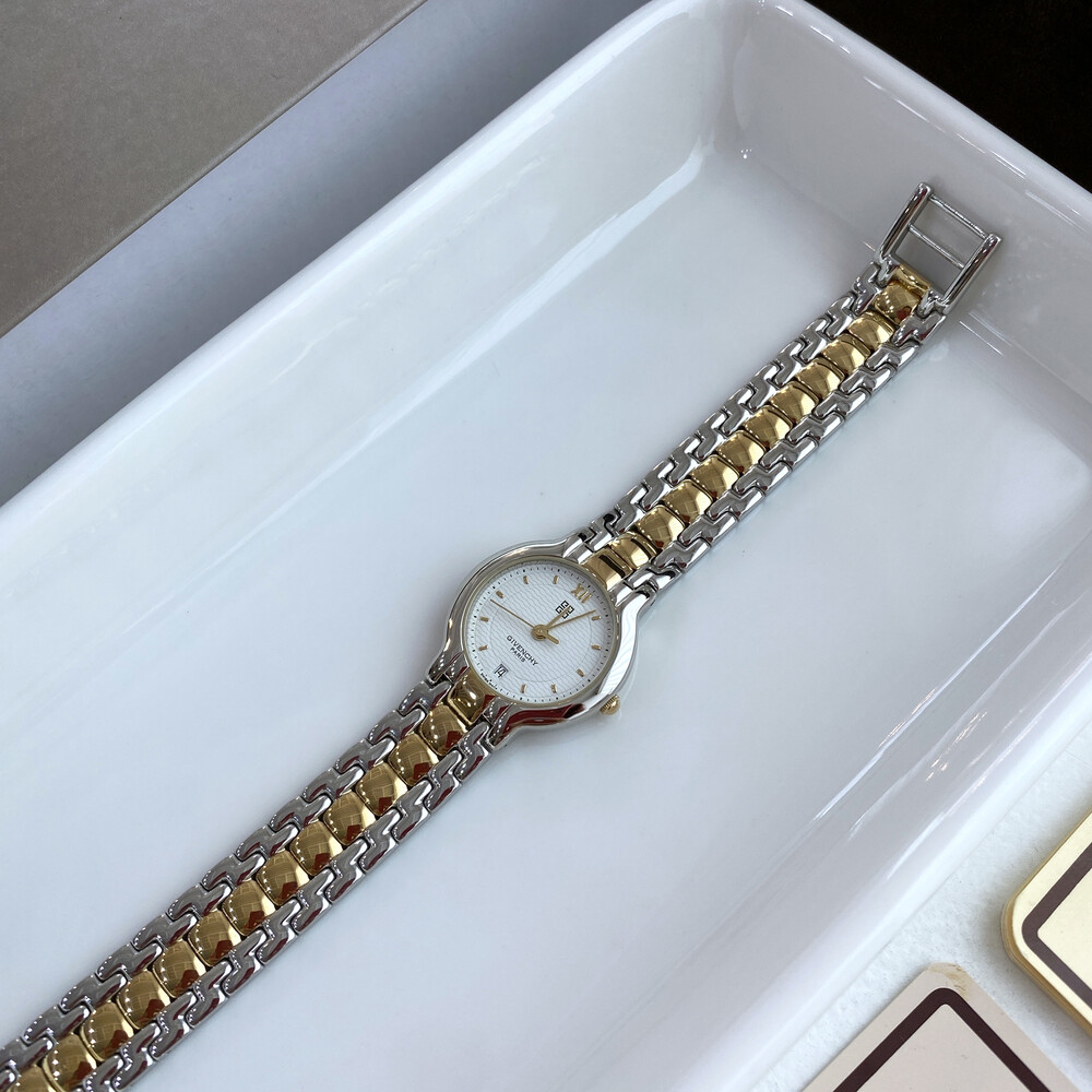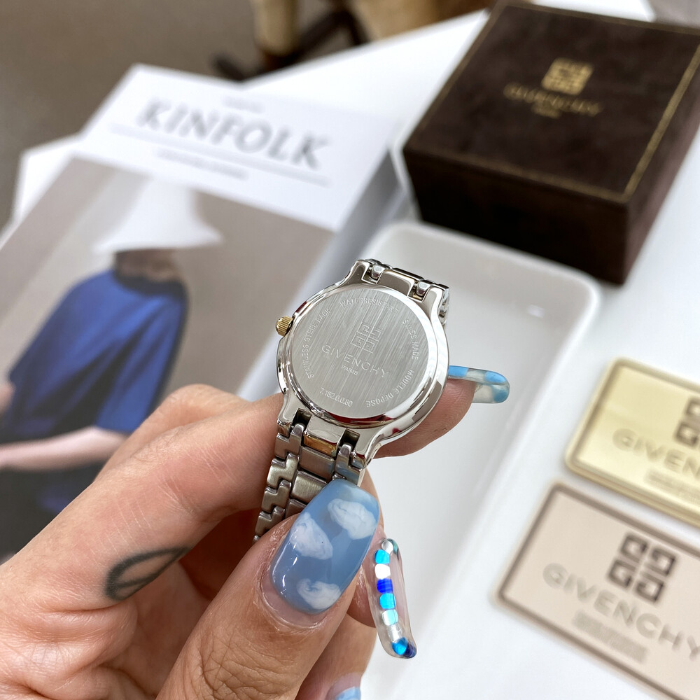 실버톤 라운드 케이스와 화이트 다이얼을 장식하는 지방시 심볼이 매력적인 시계입니다.
