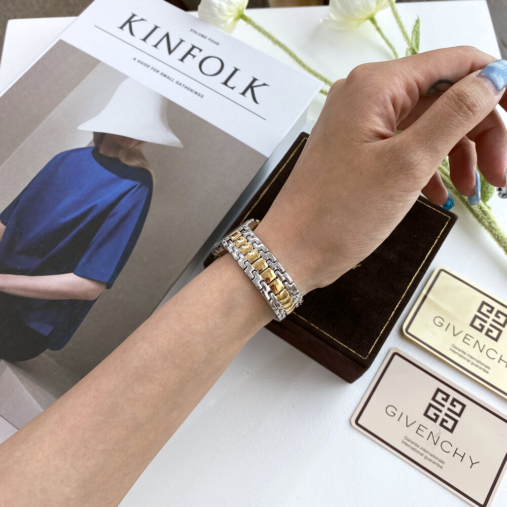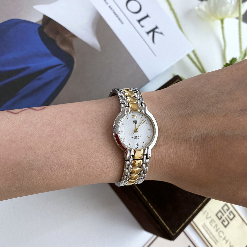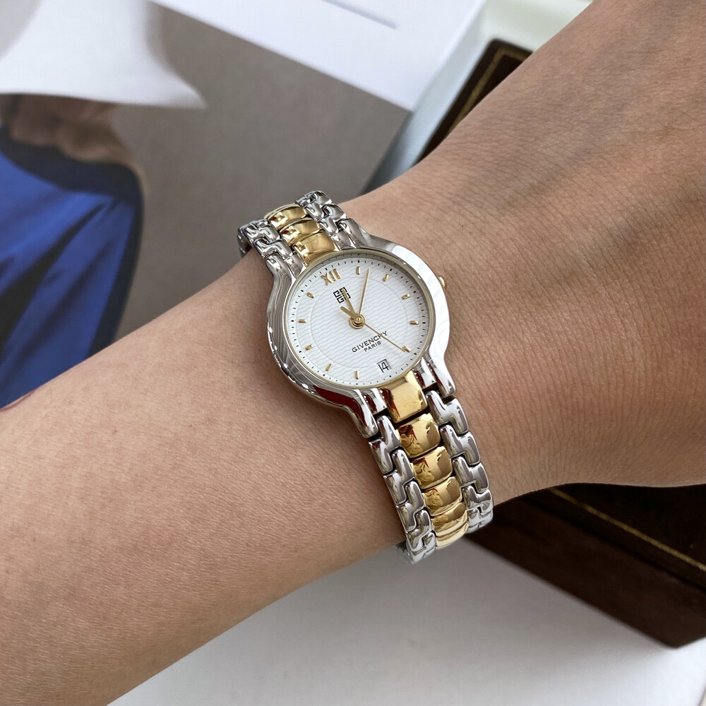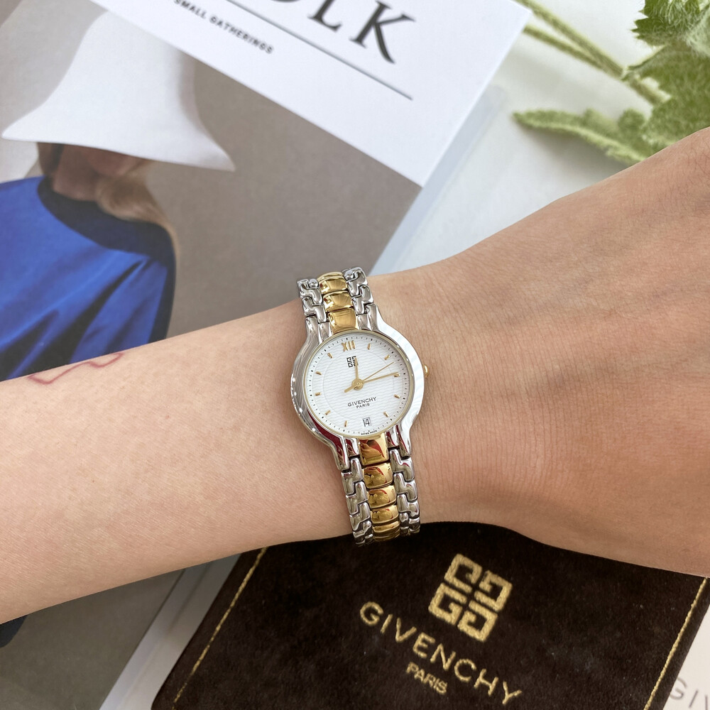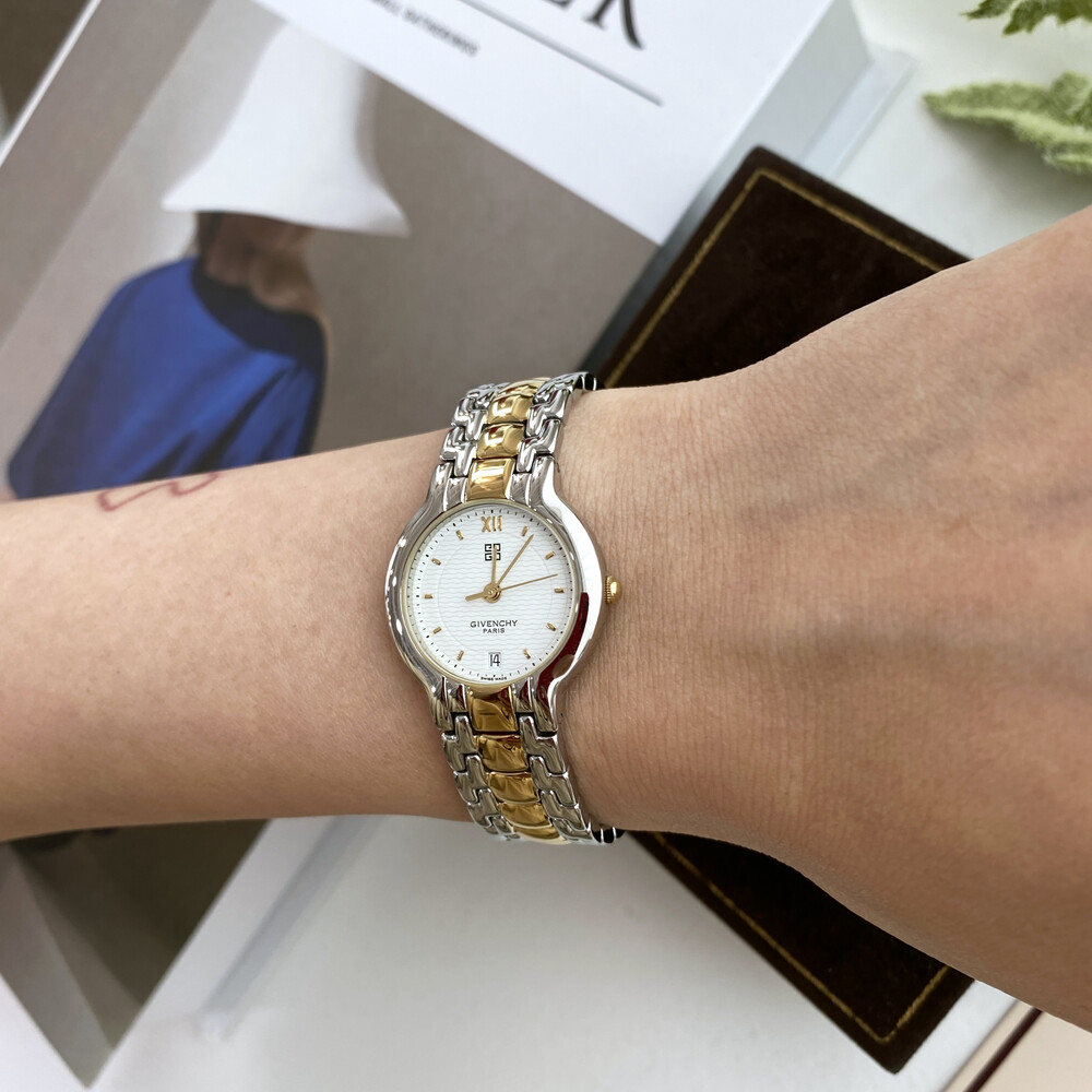 실버톤 라운드 케이스와 화이트 다이얼을 장식하는 지방시 심볼이 매력적인 시계입니다.
