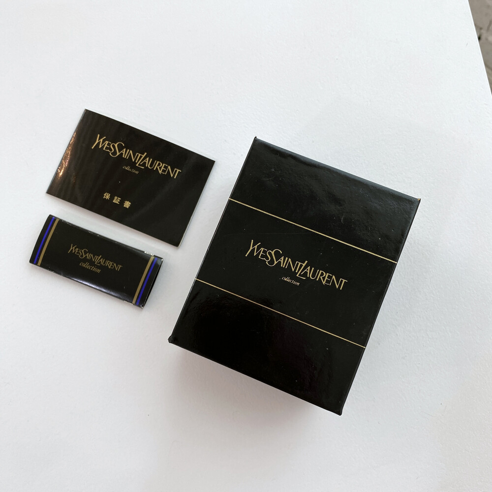 입생로랑 시계 케이스, 보증서, 사용 설명서가 포함된 제품입니다.
