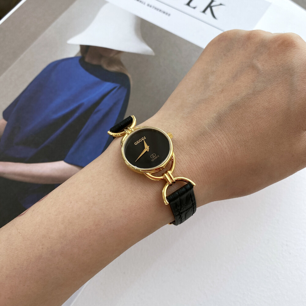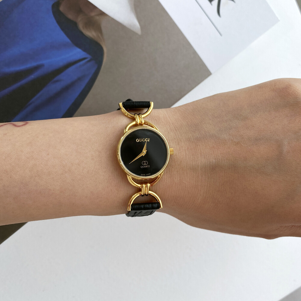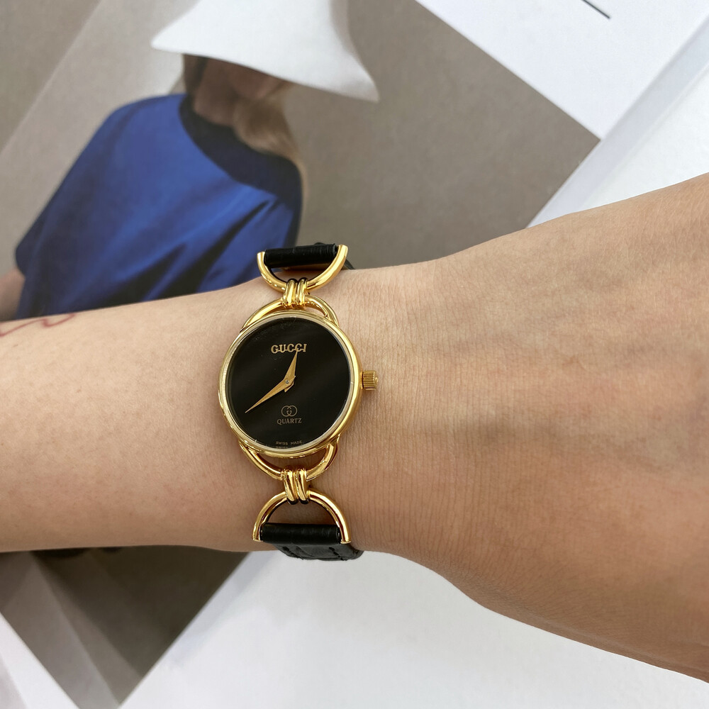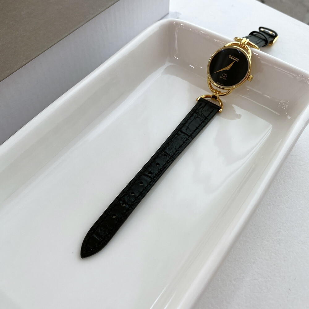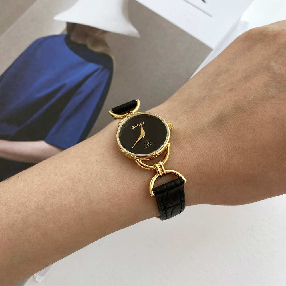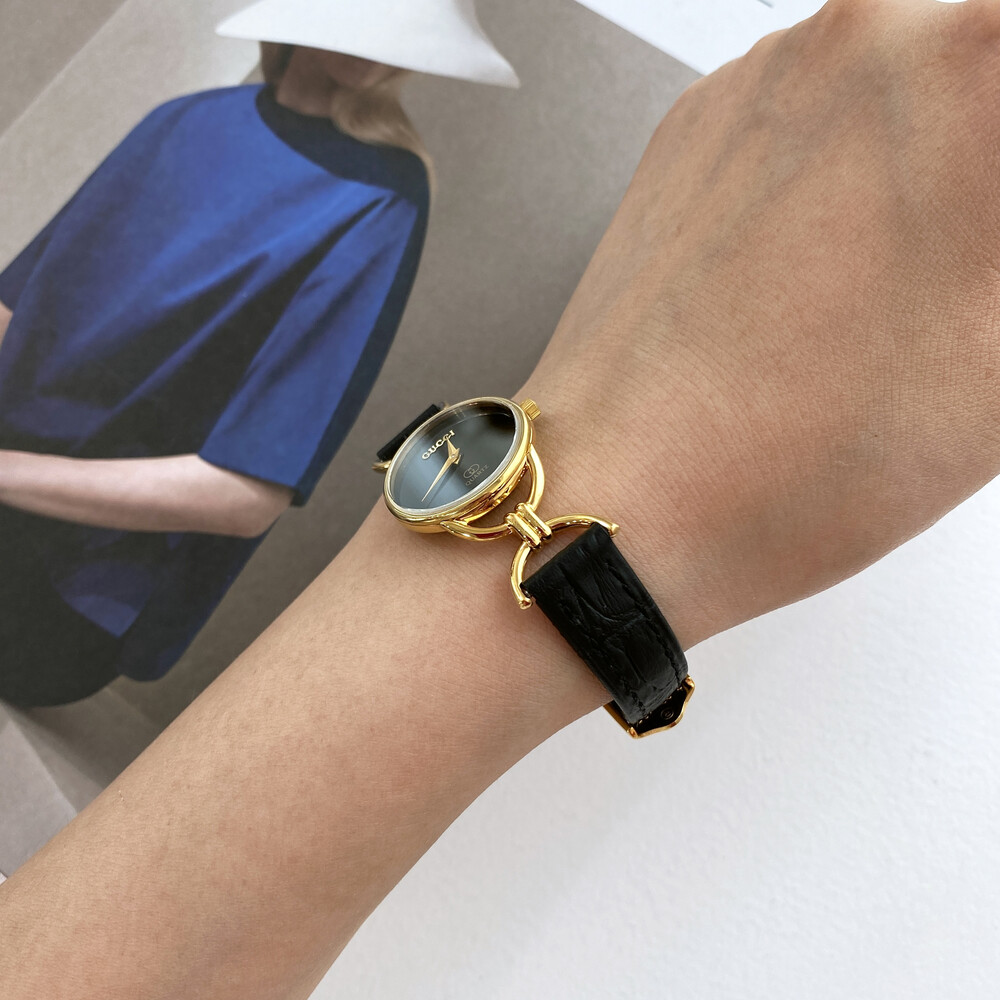 매력적인 홀스빗 타입의 러그와 깔끔한 블랙 문 다이얼 위의 구찌 심볼이