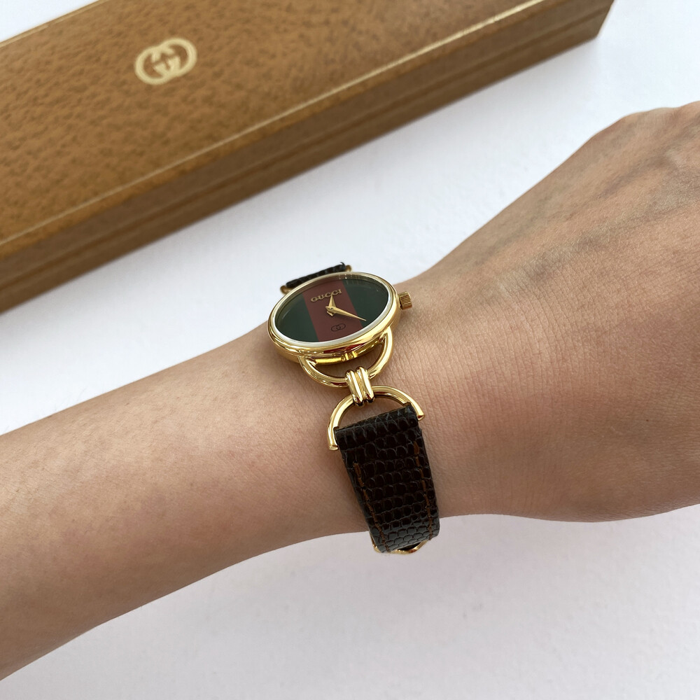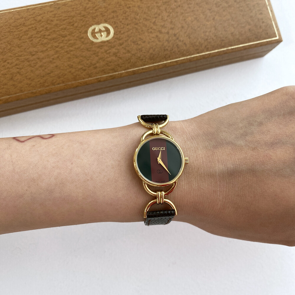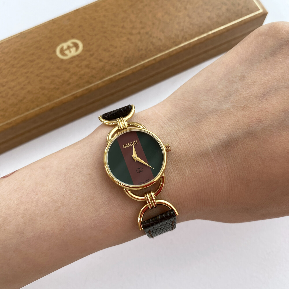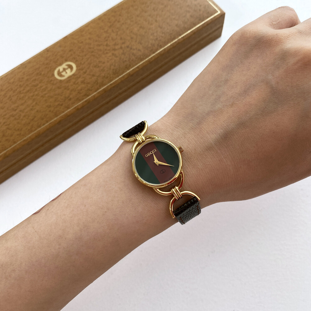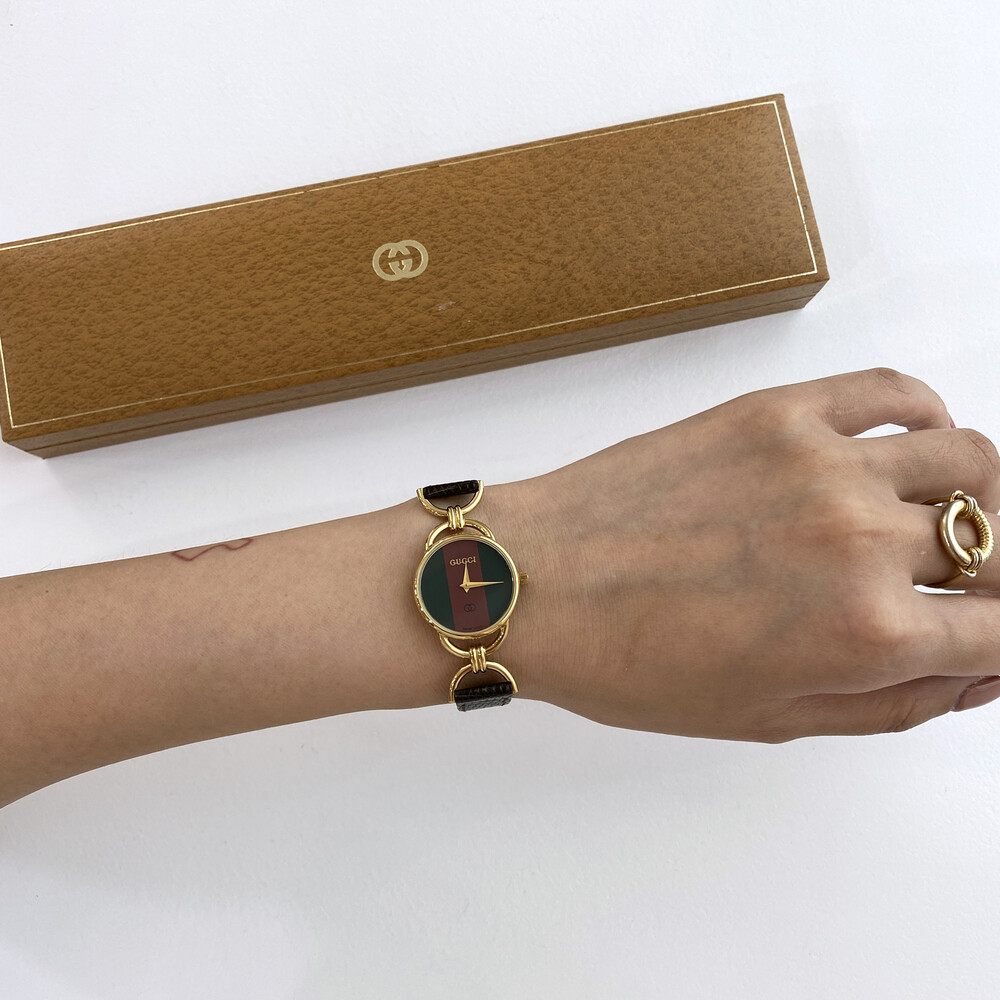 매력적인 홀스빗 타입의 러그와 구찌 시그니처 쉐리 라인 다이얼 위의 구찌 심볼이