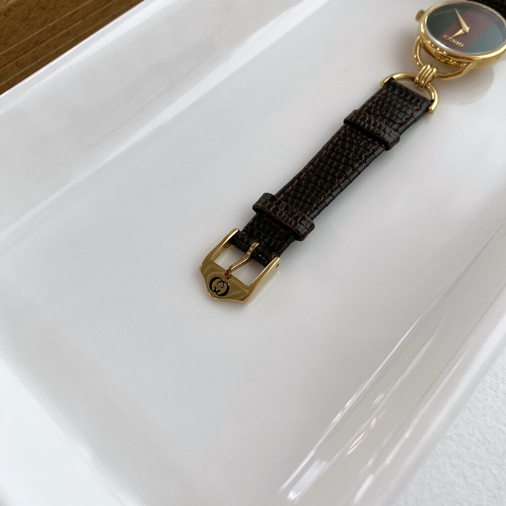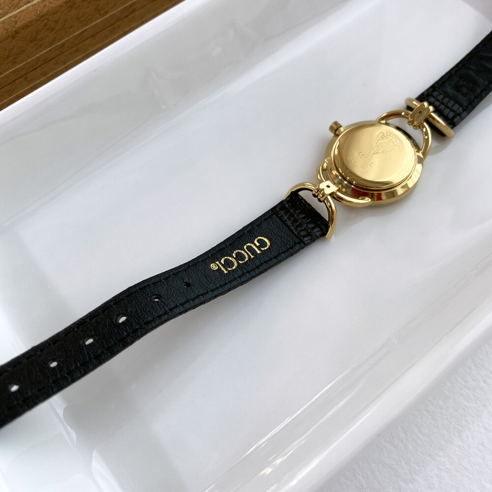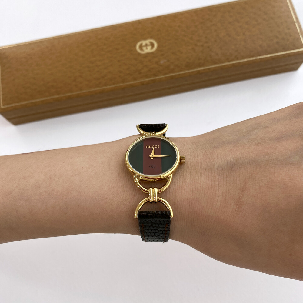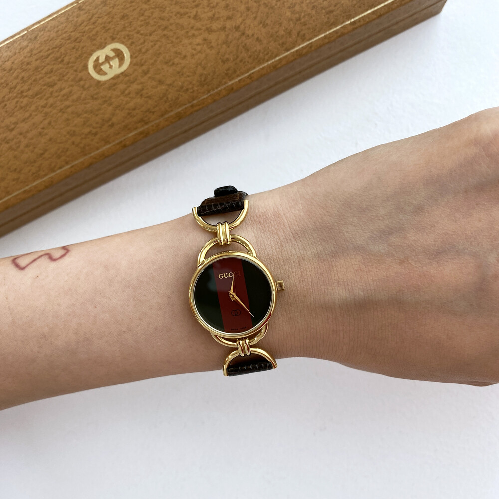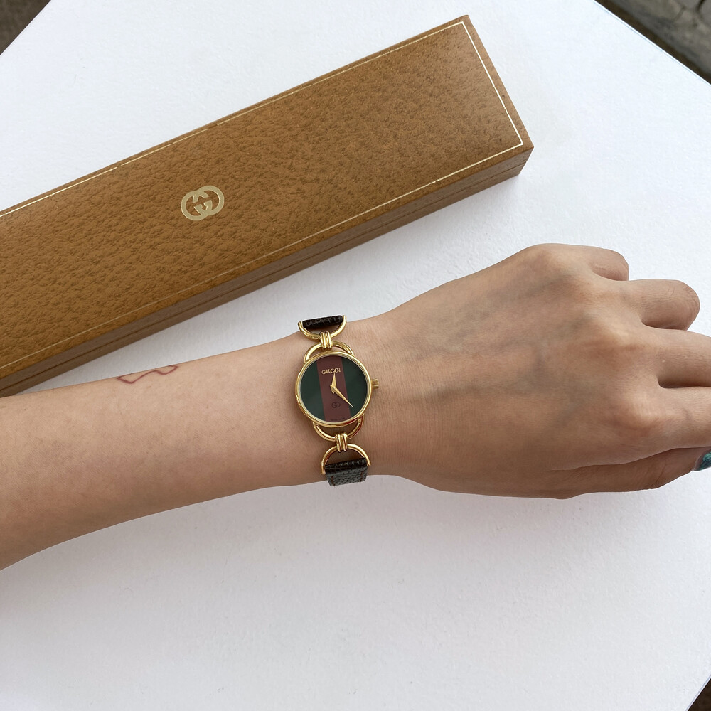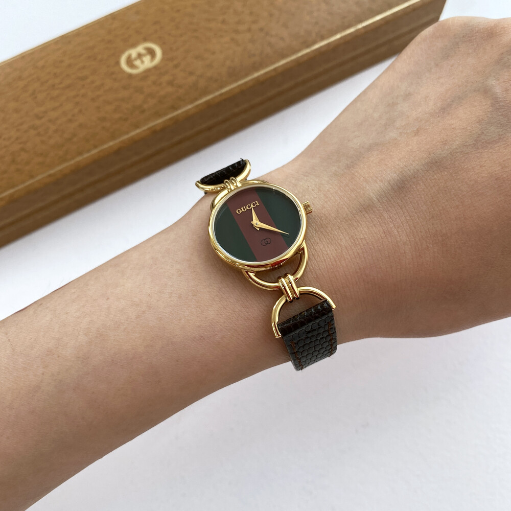 매력적인 홀스빗 타입의 러그와 구찌 시그니처 쉐리 라인 다이얼 위의 구찌 심볼이