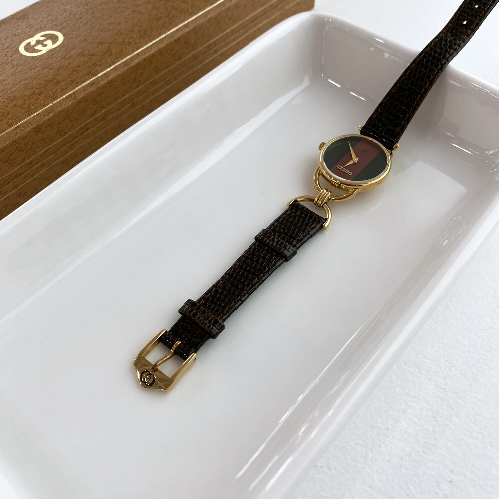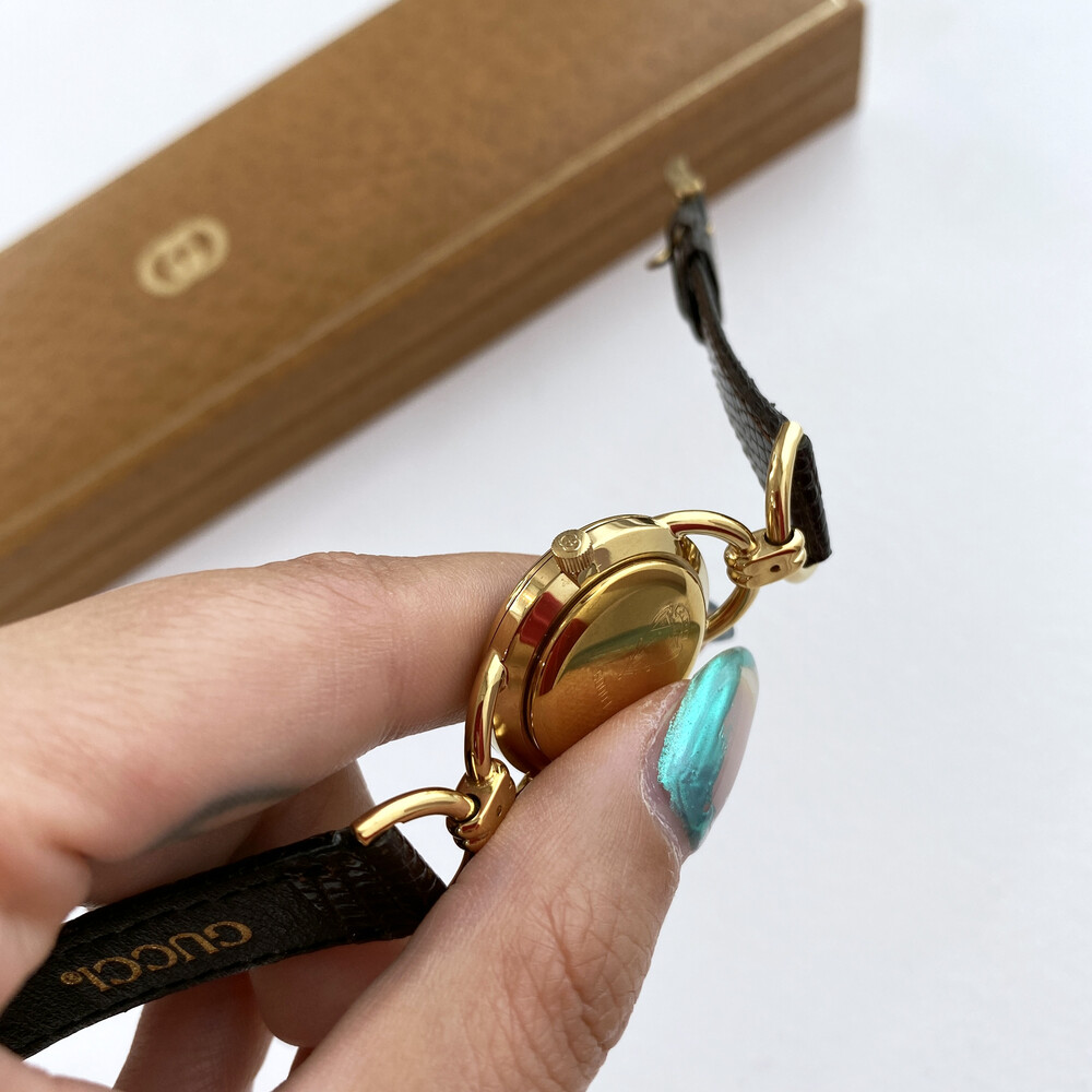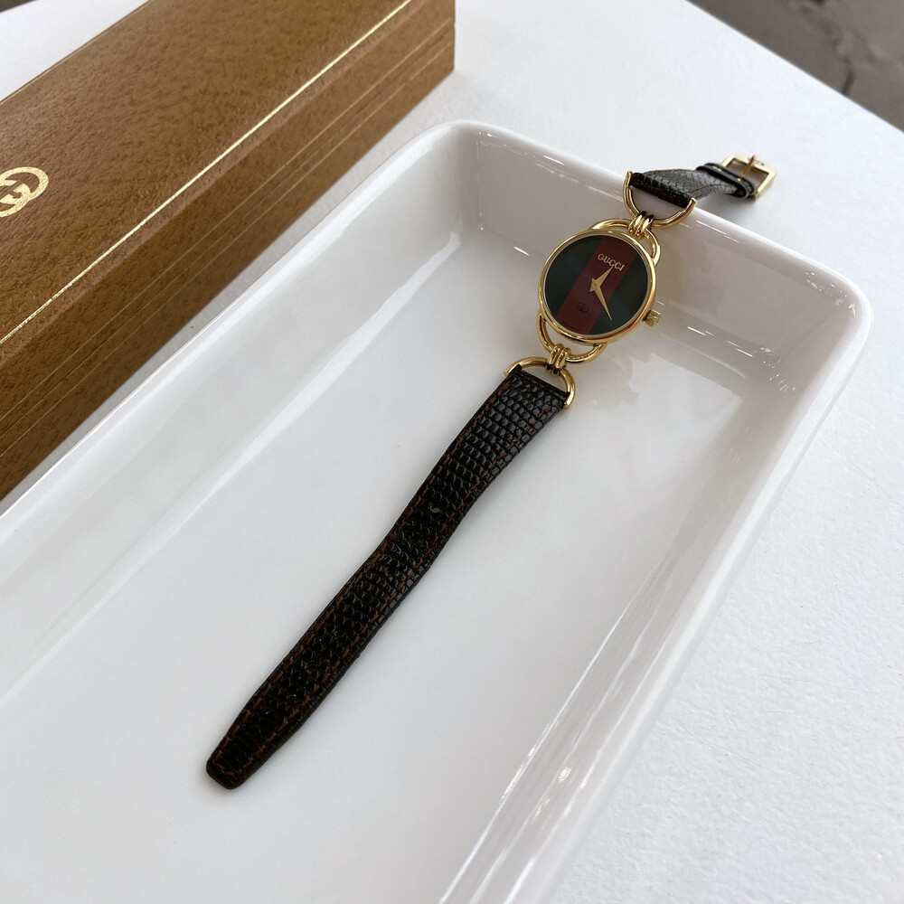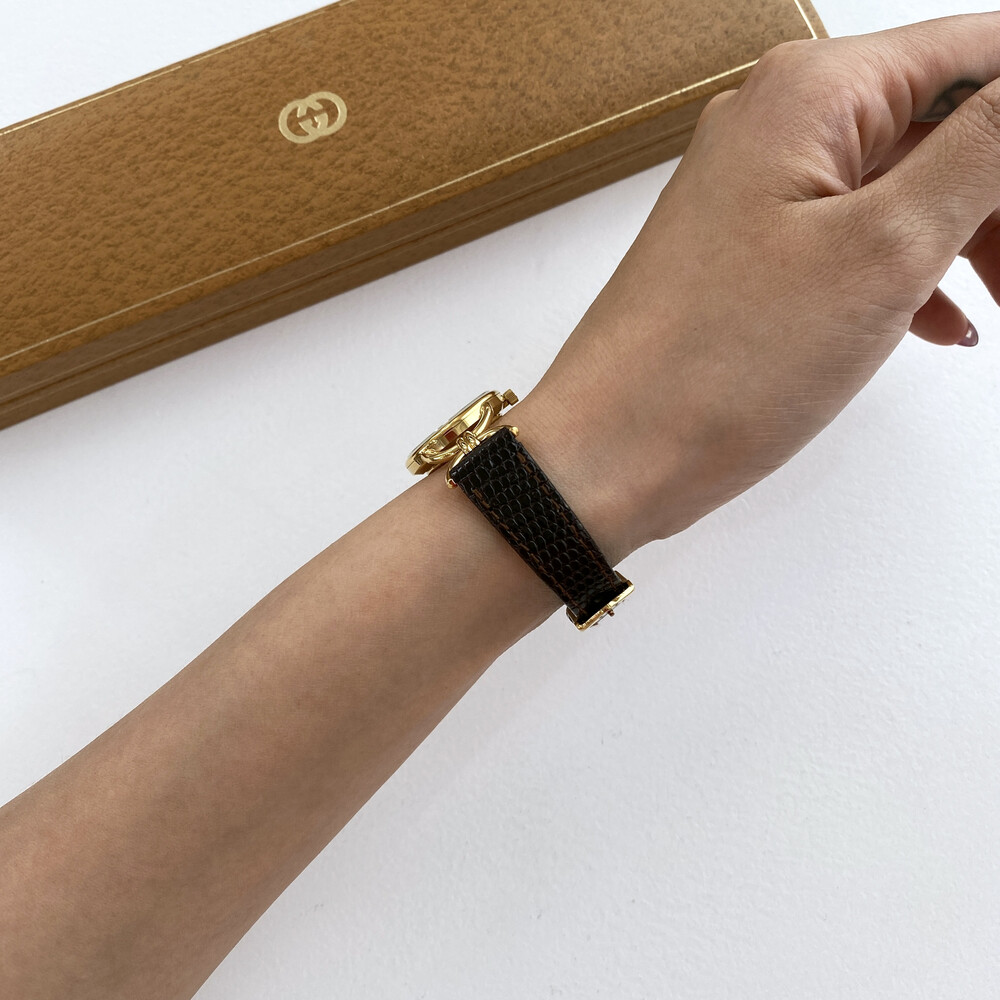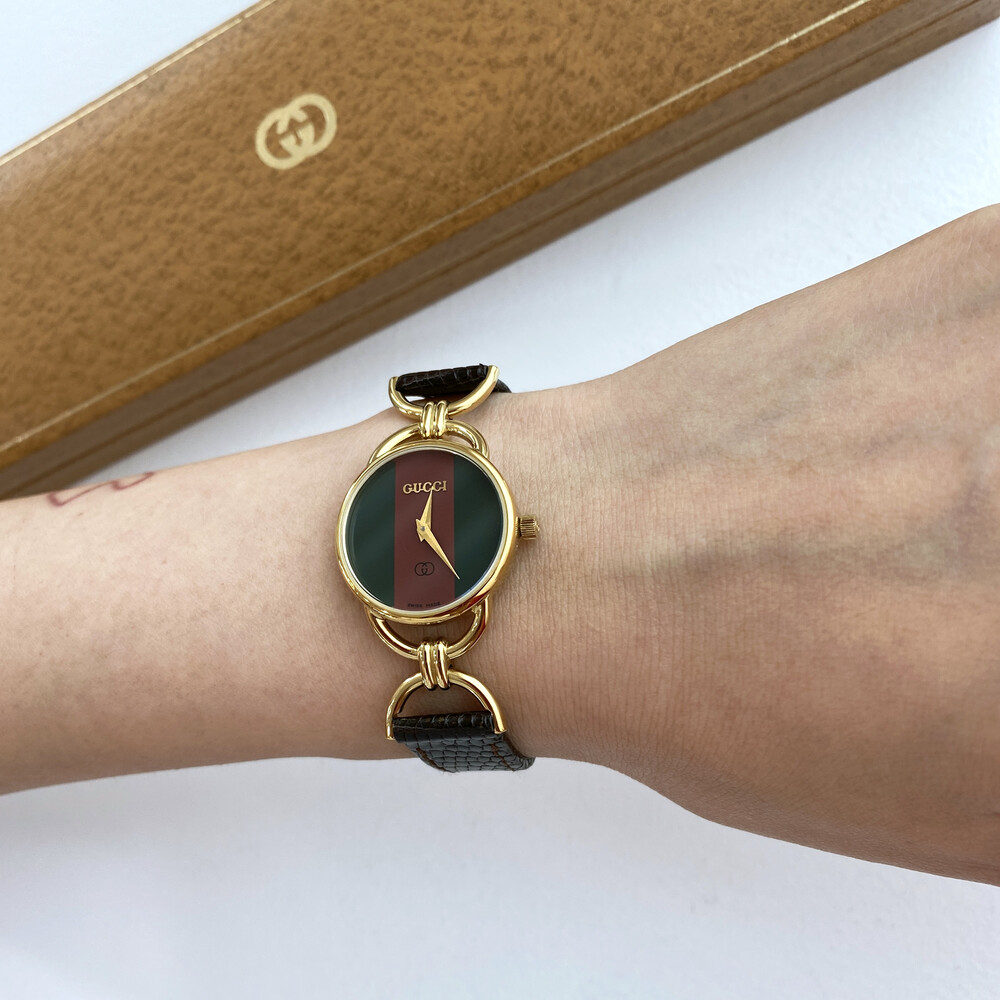 매력적인 홀스빗 타입의 러그와 구찌 시그니처 쉐리 라인 다이얼 위의 구찌 심볼이