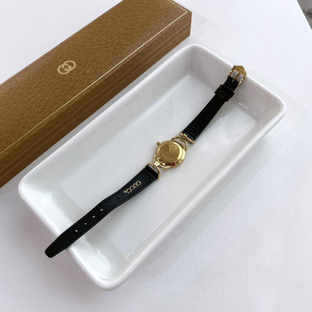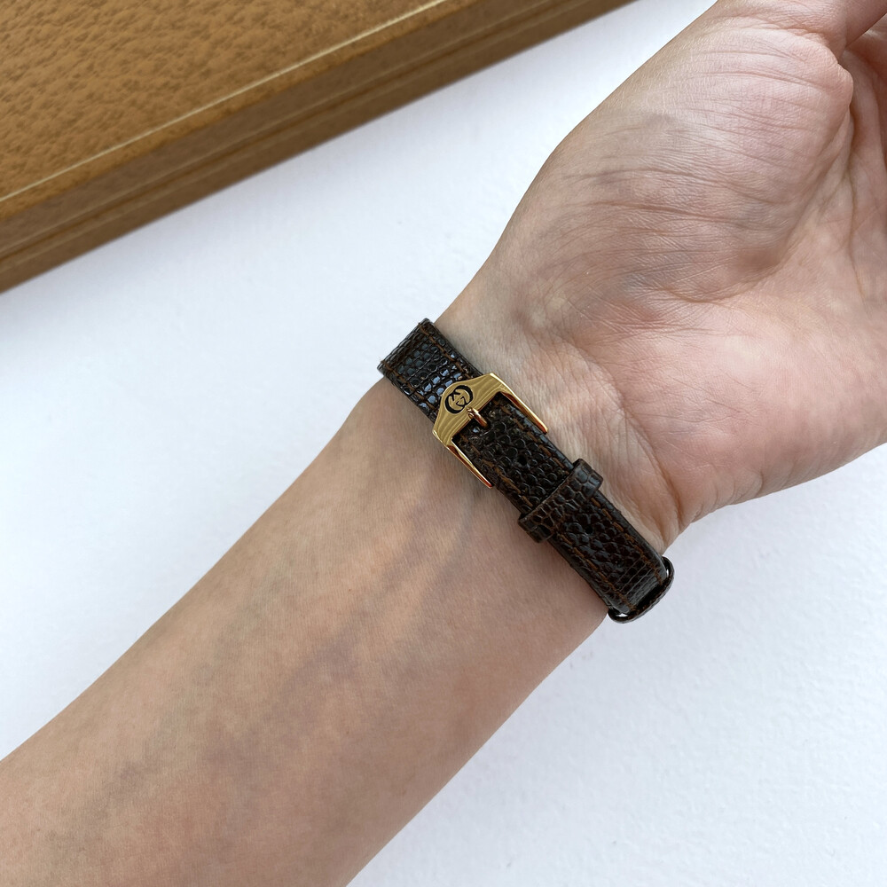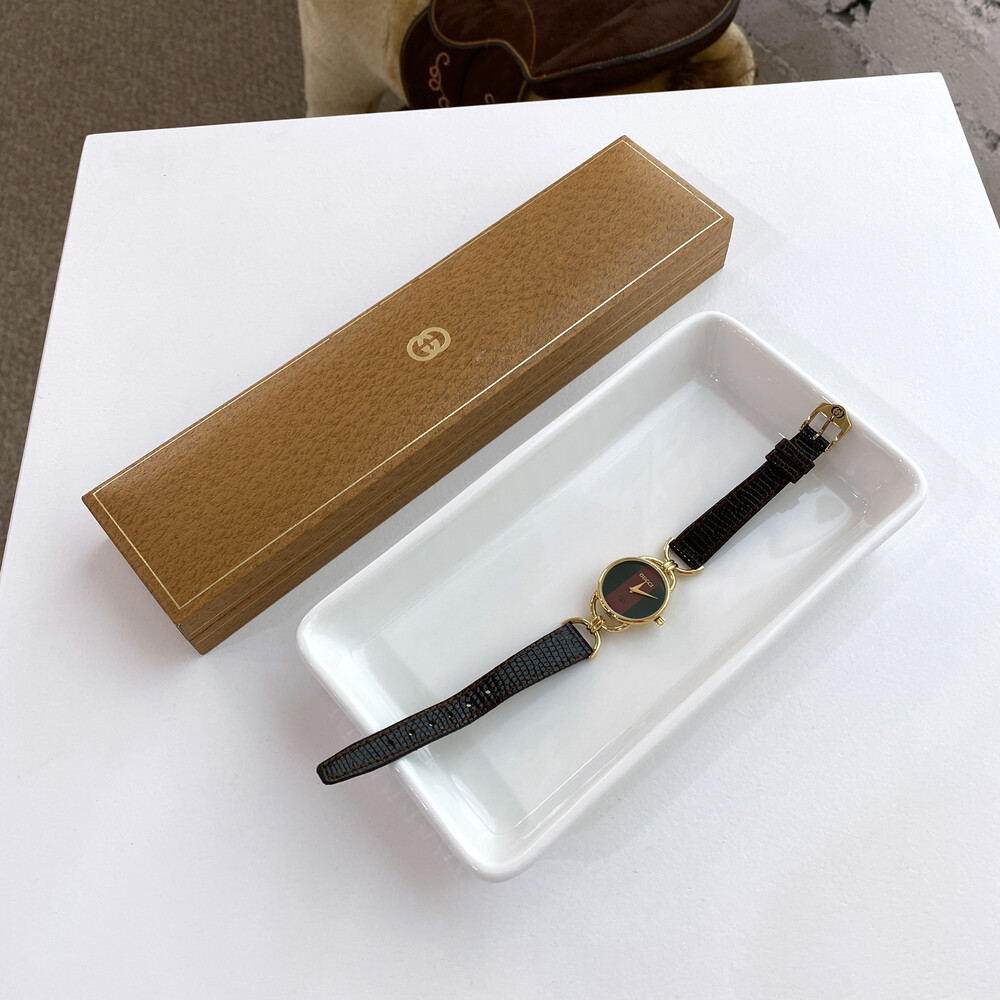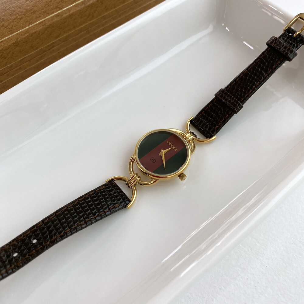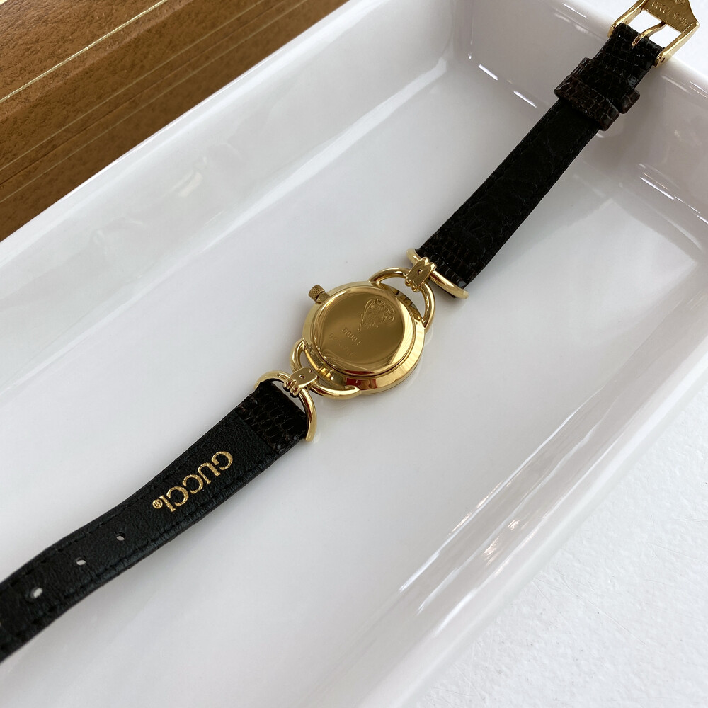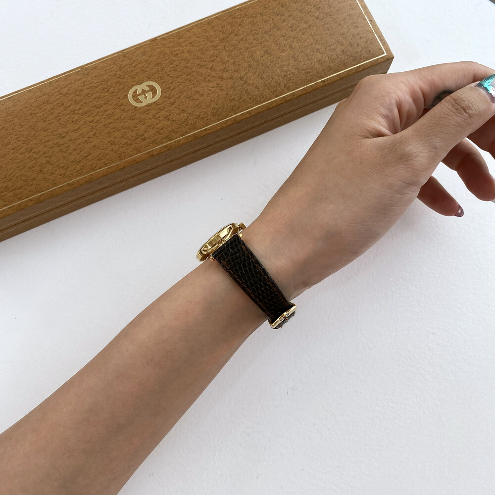 매력적인 홀스빗 타입의 러그와 구찌 시그니처 쉐리 라인 다이얼 위의 구찌 심볼이